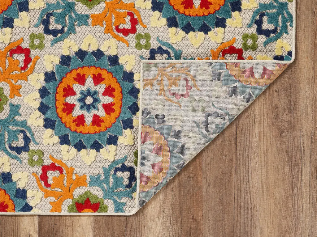 Add some graphic punch to your porch or patio with the bold blooms on our modern floral rug. The large-scale pattern has a geometric effect in a simple palette of leafy green, deep blue and beige. The flatweave design is great for high-traffic spaces indoors too.