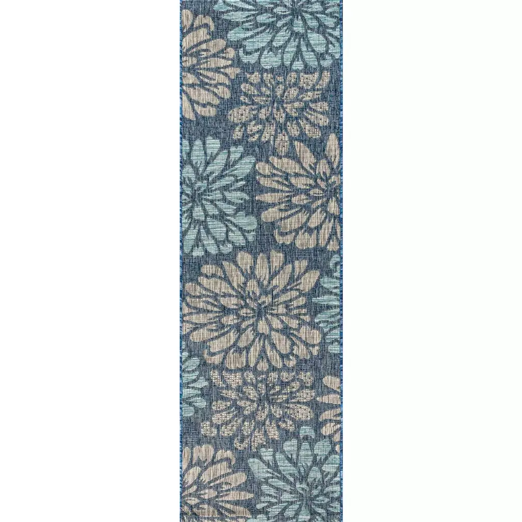 Add some graphic punch to your porch or patio with the bold blooms on our modern floral rug. The large-scale pattern has a geometric effect in a simple palette of leafy green, deep blue and beige. The flatweave design is great for high-traffic spaces indoors too.