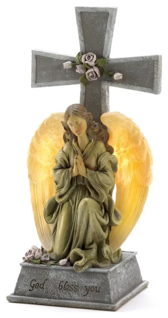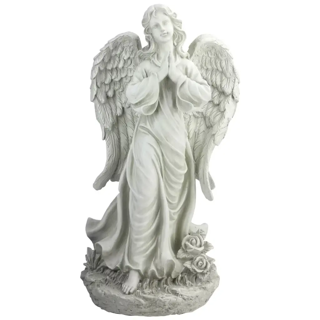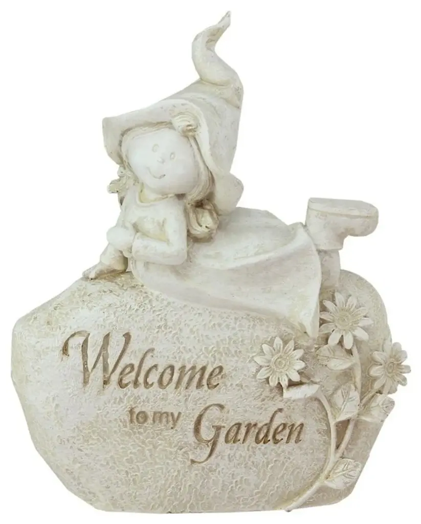 Decorative garden figure is the perfect way to enhance your outdoor areas during the spring and summer monthsDepicts a beautiful angel wearing a floral crown with her head resting upon her hands and kneeAngel sits atop a stone inscribed with the words "Welcome to our Garden"Meticulously sculpted by highly skilled artisans with fine attention to detail and a distressed gray finish with soft gold and green accentsFlower is solar powered and lights up with a white LED lightAdditional Product Features:Solar panel is located on the back of the figureAutomatically turns on at night and off in the morningIncludes on/off switchMust be in ''On'' position in order to chargeFor best results place in an area that gets 8 hours of full sun dailyDimensions: 10"H x 19"W x 4.5"DMaterial(s): Polyresin