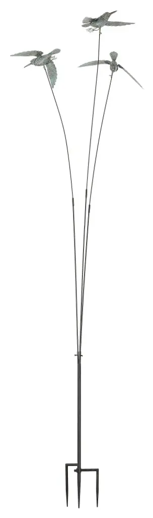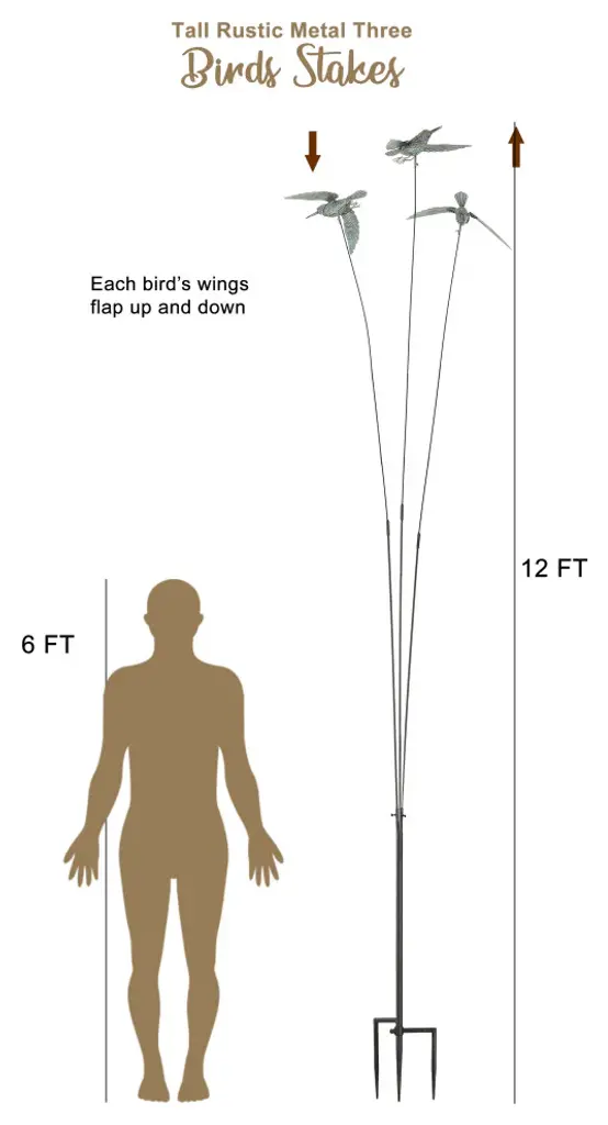 This extra tall garden stake is for sure to be a standout piece in your yard. With its unique design, it remains balanced on its own despite the enormous height - standing at 12 feet. While on its own it is already a statement piece, the real fun begins when the wind comes. Powered by the wind, the sculpture rocks, and the birds'' wings flap, animating it for your enjoyment.