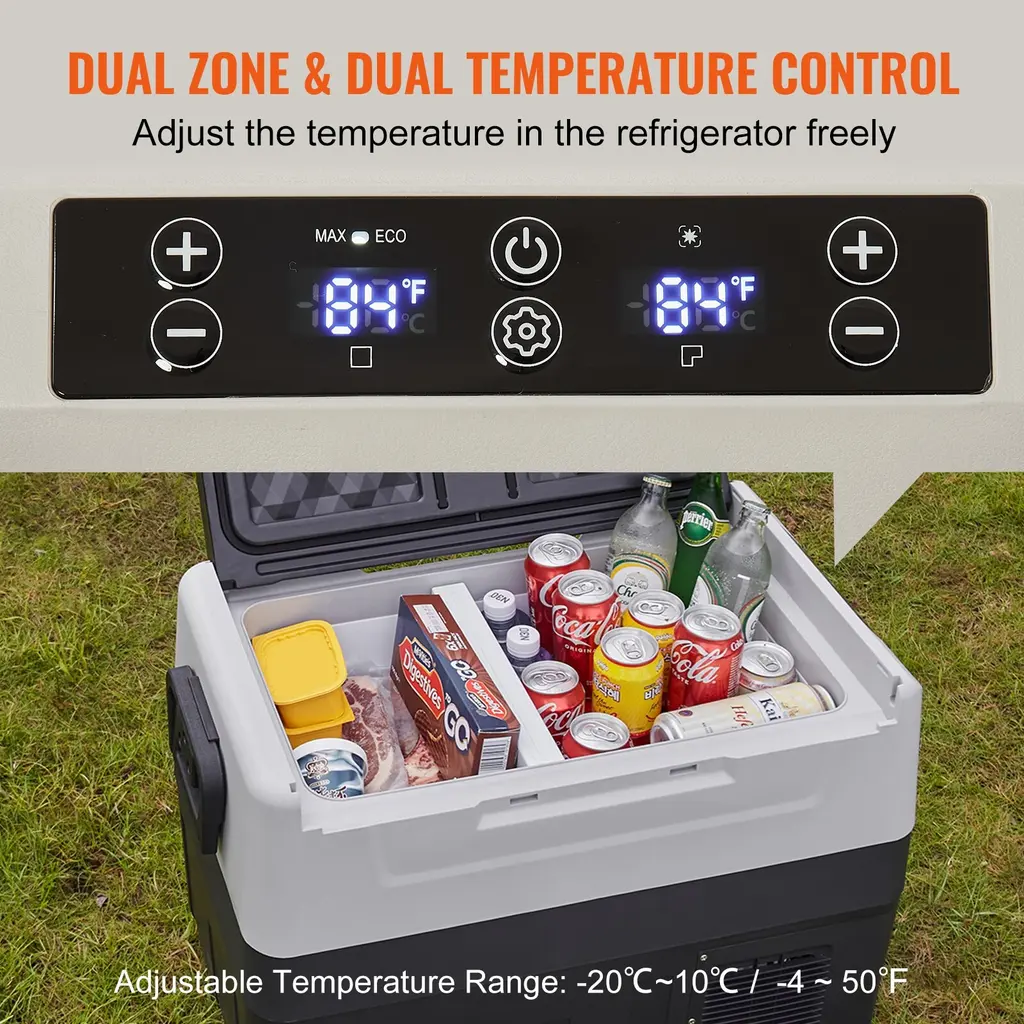 Rapid Cooling: Experience quick and efficient cooling with our mini car fridge. Equipped with an upgraded compressor, it can cool from 77°F to 32°F in just 15 mins/77°F to -4°F in just 1.5 hours, and cool to -4℉ in one hour, ensuring your beverages and food stay refreshingly chilled. It even performs flawlessly at a 45° inclination, making it the perfect companion for outdoor adventures or work on the go. Quiet and Energy Efficient: Our portable car fridge consumes only 0.6kw.h of energy per 24 hours, providing impressive energy efficiency that saves power. And its boasts whisper-quiet operation, emitting less than 45db of noise when running. You can focus on your work or enjoy a peaceful night's sleep without disturbance. Dual-Zone Temperature Control: The two zones can be customized for insulation or refrigeration purposes, and the temperature can be adjusted between -4°F to 50°F to suit your specific needs. With a generous total capacity of 58QT/ 56QT/48QT/37QT, you can easily refrigerate and store an assortment of beverages, fruits, meats, seafood, and more, ensuring you have everything you need for your daily adventures. Versatile for Family and Car Use: The car refrigerator comes with a 138-inch/3.5m car cigarette lighter line and a household conversion plug, enabling you to use it in various settings, including your home, yacht, RV, car, truck, or van. Sturdy Construction: Our portable refrigerator is built to last. Crafted with a robust PP shell, it provides exceptional resistance against collisions and falls. Whether you're on rough terrains or in extreme temperature conditions, it ensures the box body remains intact within a wide temperature range of -4°F to 158°F. Package Content 1 x Car Refrigerator 1 x Adapter 1 x 3.5m/138 inch Car Cigarette Wire