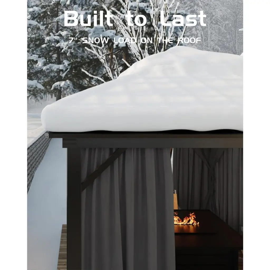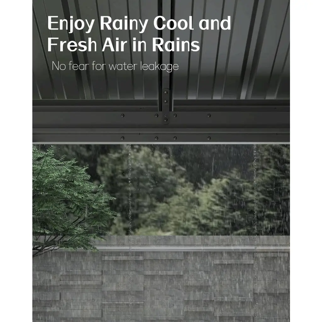 12x14 Hardtop Gazebo with Curtains - Outdoor Metal Pavilion with Double Roof, Galvanized Steel Frame, Netting for Patio, Backyard, DeckProduct DescriptionRedefine Your Outdoor Living with a Durable and Versatile All-Weather SanctuaryTransform your patio, deck, or backyard into a sophisticated and functional outdoor retreat with the TROPOW 12'x14' Hardtop Gazebo. This meticulously engineered metal pavilion is designed not just as a shade structure, but as a permanent, all-weather sanctuary for year-round enjoyment. Crafted from a robust combination of galvanized steel and aluminum, it offers unparalleled durability against the elements. The innovative double-roof design, complete with an efficient gutter system, ensures superior weather protection and ventilation. Enhanced with dual-layer curtains for privacy and insect protection, this gazebo provides a comfortable, bug-free, and private space for dining, entertaining, or simply relaxing. Whether you're seeking shelter from the sun, light rain, or pesky insects, this modern gray gazebo is the ultimate investment in enhancing your home's outdoor living experience.Uncompromising Durability for Year-Round UseBuilt to be a lasting fixture in your garden, this gazebo's strength lies in its high-quality materials and intelligent engineering. Sturdy Metal Framework: The core structure is constructed from a hybrid frame of galvanized steel and powder-coated aluminum. This combination provides exceptional strength and load-bearing capacity while ensuring remarkable resistance to rust and corrosion. The galvanized steel offers a solid foundation, and the aluminum components add durability without excessive weight. Triangular Architecture for Enhanced Stability: Key sections of the frame incorporate a triangular design, a principle known for its superior structural integrity. This design significantly enhances the gazebo's stability, enabling it to better withstand wind loads and ensuring it remains a sturdy, wobble-free shelter for years to come. Weatherproof Hardtop Roof: Unlike fabric canopies that degrade in the sun and rain, the solid hardtop roof is engineered to be completely weatherproof, fade-proof, and rust-proof. It provides permanent protection from UV rays and rain, eliminating the need for seasonal replacement and ensuring your gazebo looks beautiful season after season. Enhanced Comfort with Privacy and Insect ProtectionCreate a secluded haven in your own backyard with the included curtain system, designed for both comfort and convenience. Dual-Layer Curtain System: The gazebo comes equipped with two sets of curtains to adapt to your needs. The primary curtain offers maximum privacy and UV blockage, perfect for creating an intimate setting. The second layer is a fine mesh netting curtain designed to keep mosquitoes and other insects out while allowing fresh air and natural light to filter through. Versatile Enclosure Options: You can use either curtain independently or together for complete seclusion and pest protection. When not in use, the curtains can be tied back to create an open, airy pavilion. Functional Hooks for Convenience: The curtains are fitted with hooks, providing a handy solution for hanging small items like lanterns, planters, or tools, keeping your living space organized and personalized. Intelligent Design for Superior Weather ManagementThis gazebo goes beyond basic shelter with design features that actively manage rain and airflow for a more comfortable environment. Efficient Roof Drainage System: The gazebo features a sloped roof design with a unique integrated gutter system. When it rains, water is channeled along the roof's edge and directed down the aluminum columns, effectively guiding it away from the seating area and the base of the structure. This prevents water from pooling on the roof or dripping through the center, keeping you and your guests dry and minimizing water-related wear on the frame. Specifications Brand: TROPOW Frame Material: Metal (Galvanized Steel and Aluminum) Roof Material: Hardtop (Double Layer) Color: Gray Shape: Rectangular Style: Modern Water Resistance Level: Waterproof Ultraviolet Light Protection: Yes