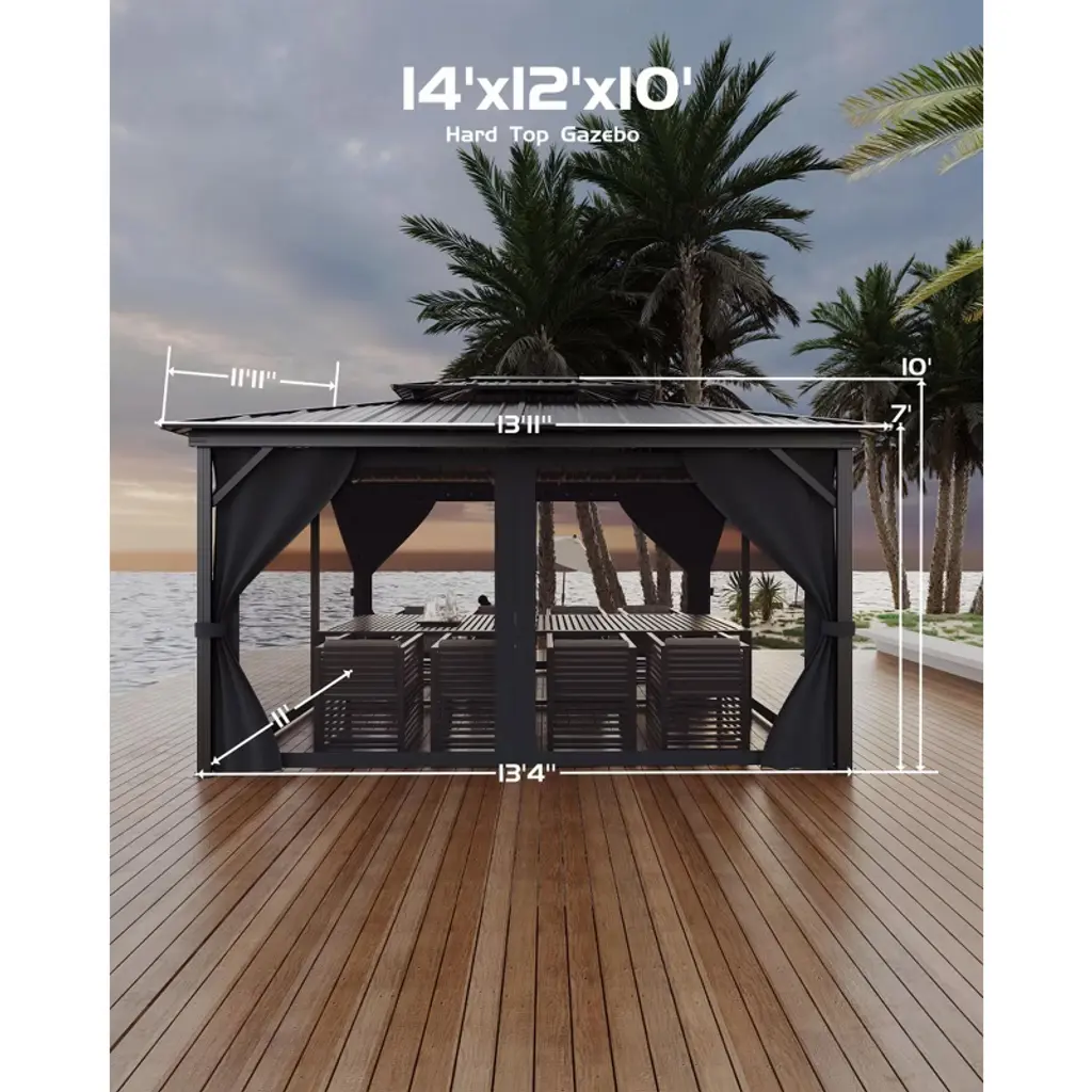 12'*14'hardtop Gazebo - Outdoor Metal Pavilion With Galvanized Steel And Aluminum Frame, Double Roof Canopy With Netting And Curtains -Ideal For Patio