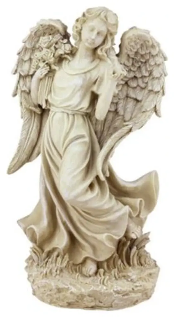 Decorative garden figure is the perfect way to enhance your outdoor areas during the spring and summer monthsDepicts an angel wearing a flowing ivory gown and holding a dove in her handsShe is standing upon a pedestal base that reads "May Peace and Love Always Be With You" with floral accentsFor indoor/outdoor useDimensions: 13.5"H x 5"W x 3.5"DMaterial(s): Polyresin