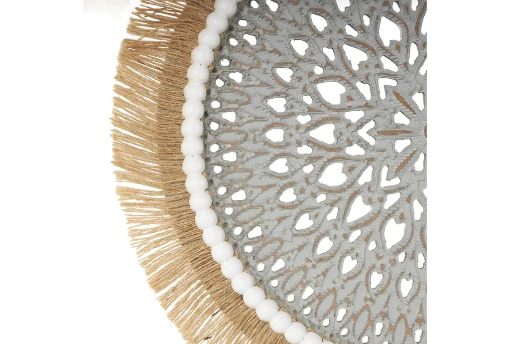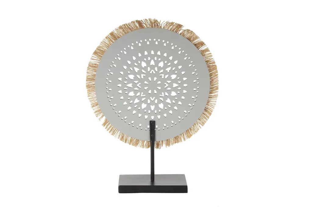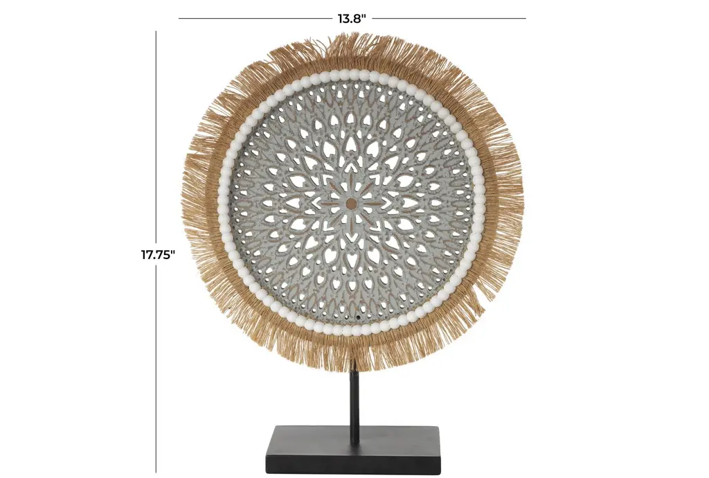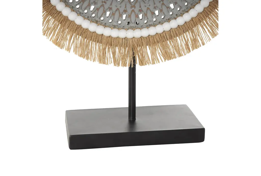 This 14" X 4" X 18" Grey Wooden Tribal Handmade Seagrass Fringed Sculpture with Black Base is a stunning decorative piece that adds a touch of free-spirited charm to any space. The intricate design and combination of materials create a unique and eye-catching display. Perfect for enhancing the aesthetic of your home or office.