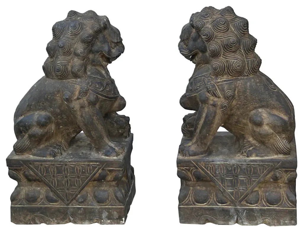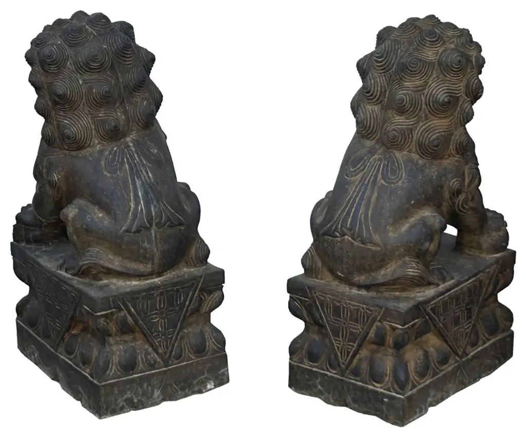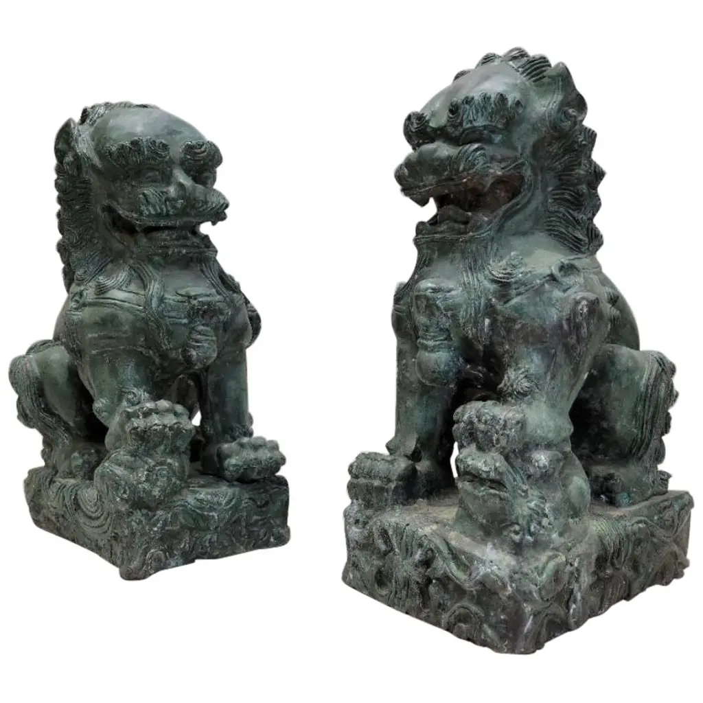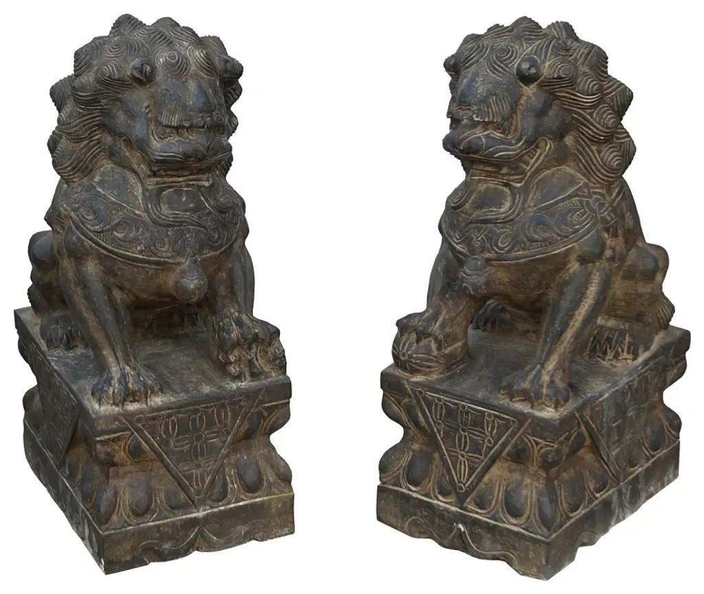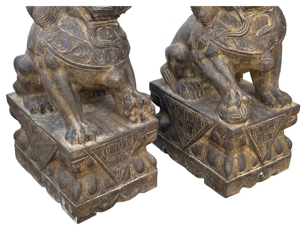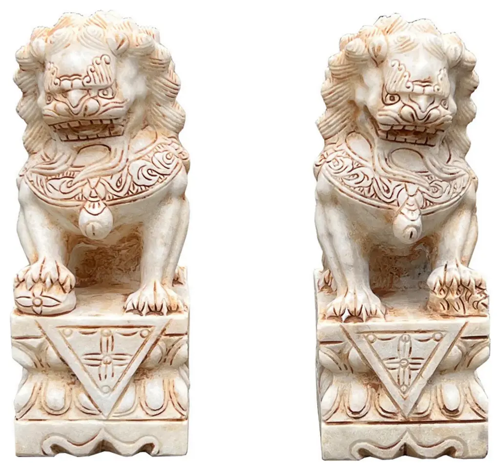 The Pair Chinese Rustic Brown Marks Stone Fengshui Foo Dogs Lions Statue is a stunning embodiment of traditional Chinese symbolism and craftsmanship. Crafted from natural stone, these statues exude elegance and grace, making them a captivating addition to any space.Standing majestically, these foo dogs, also known as guardian lions, are depicted in a classic pose: one with its paw resting on a ball, representing supremacy over the world, and the other with its paw on a playful cub, symbolizing protection and nurturing. Each intricate detail, from their flowing manes to their fierce expressions, is meticulously carved, showcasing the skill and artistry of the sculptor.In Chinese culture, foo dogs are believed to possess protective powers, guarding against evil spirits and negative energy. Placing them at the entrance of a home or business is thought to invite good fortune and ward off malevolent forces. As such, these statues not only serve as exquisite decorative pieces but also carry deep cultural significance and spiritual symbolism.Whether displayed indoors or outdoors, the Pair Chinese Rustic Distressed Stone Fengshui Foo Dogs Lions Statue commands attention and admiration, serving as a timeless symbol of strength, protection, and prosperity.Dimensions: w5.5" x d7.5" x h15" eachOrigin: ChinaMaterial: StoneCondition: hand-carved, natural stone marks, edge chips, dirt.For all USA domestic continental customers (from 48 states), there is a flat shipping fee of $155, which includes insurance and handling charges. (Additional shipping charges apply to buyers from Hawaii, Alaska, US Islands, Florida Keywest, and Canada). If you are in the San Francisco Bay Area, we warmly encourage you to take advantage of our convenient in-store pick-up option at no extra cost. Please keep all original packing material and box if damage happens.