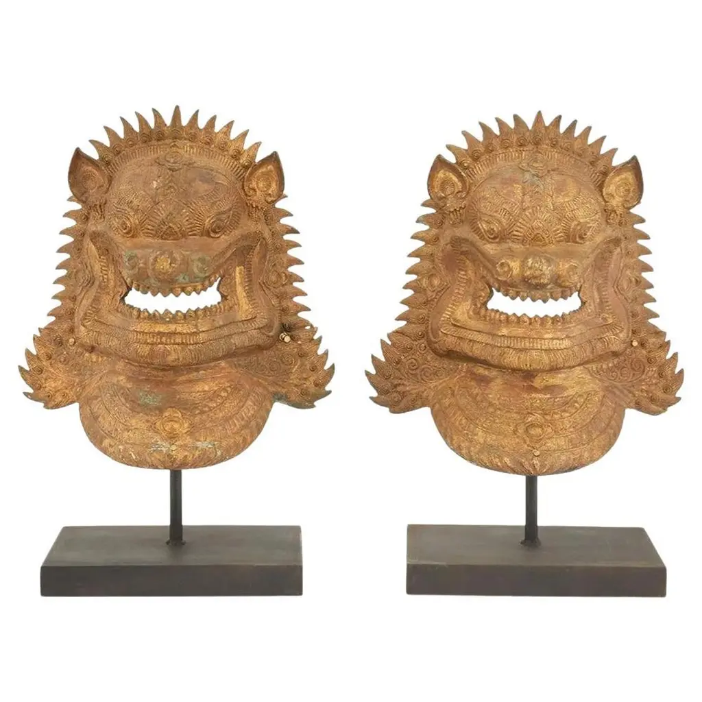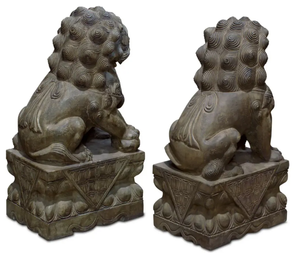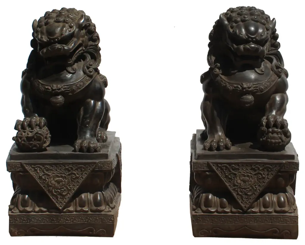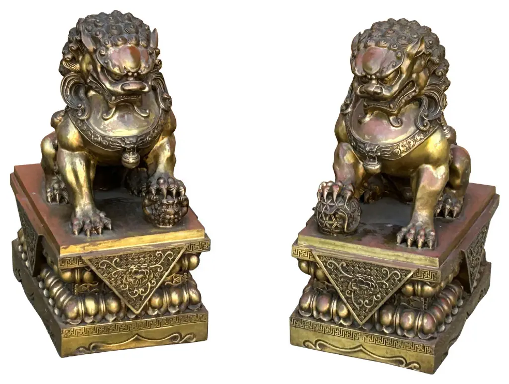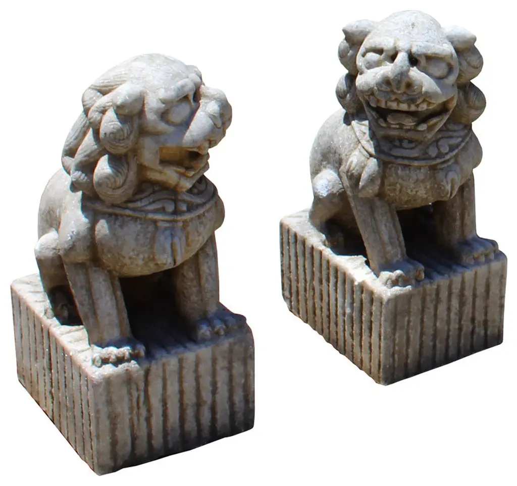 The Pair Chinese Rustic Brown Marks Stone Fengshui Foo Dogs Lions Statue is a stunning embodiment of traditional Chinese symbolism and craftsmanship. Crafted from natural stone, these statues exude elegance and grace, making them a captivating addition to any space.Standing majestically, these foo dogs, also known as guardian lions, are depicted in a classic pose: one with its paw resting on a ball, representing supremacy over the world, and the other with its paw on a playful cub, symbolizing protection and nurturing. Each intricate detail, from their flowing manes to their fierce expressions, is meticulously carved, showcasing the skill and artistry of the sculptor.In Chinese culture, foo dogs are believed to possess protective powers, guarding against evil spirits and negative energy. Placing them at the entrance of a home or business is thought to invite good fortune and ward off malevolent forces. As such, these statues not only serve as exquisite decorative pieces but also carry deep cultural significance and spiritual symbolism.Whether displayed indoors or outdoors, the Pair Chinese Rustic Distressed Stone Fengshui Foo Dogs Lions Statue commands attention and admiration, serving as a timeless symbol of strength, protection, and prosperity.Dimensions: w5.5" x d7.5" x h15" eachOrigin: ChinaMaterial: StoneCondition: hand-carved, natural stone marks, edge chips, dirt.For all USA domestic continental customers (from 48 states), there is a flat shipping fee of $155, which includes insurance and handling charges. (Additional shipping charges apply to buyers from Hawaii, Alaska, US Islands, Florida Keywest, and Canada). If you are in the San Francisco Bay Area, we warmly encourage you to take advantage of our convenient in-store pick-up option at no extra cost. Please keep all original packing material and box if damage happens.