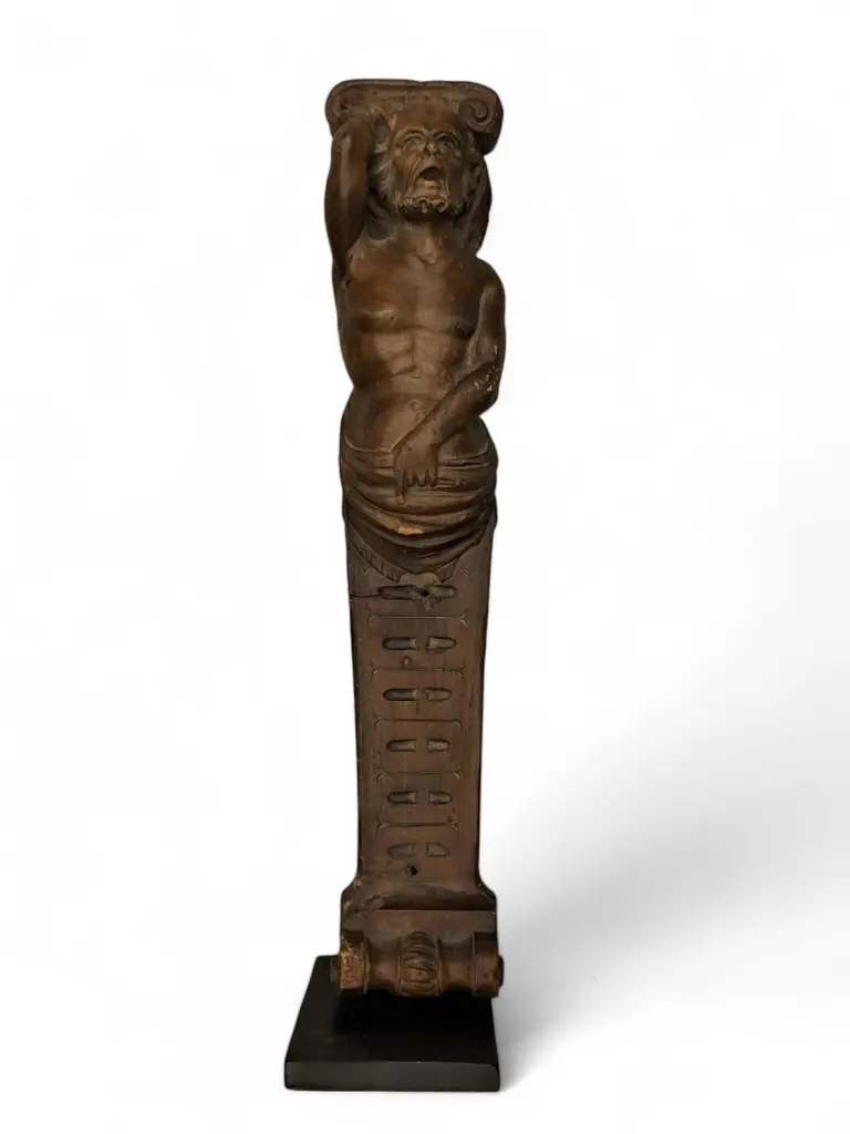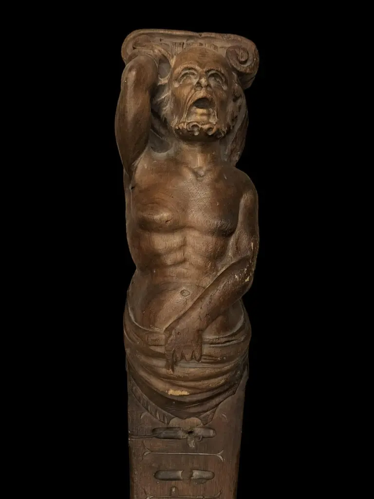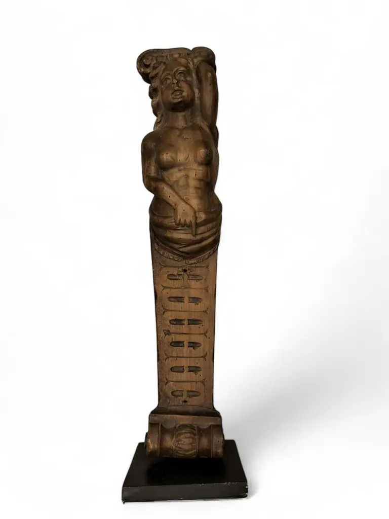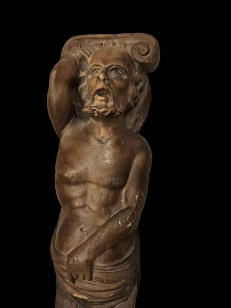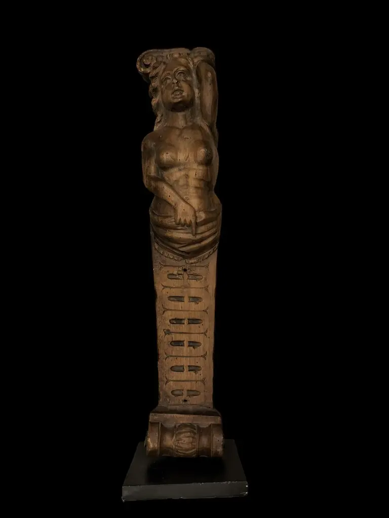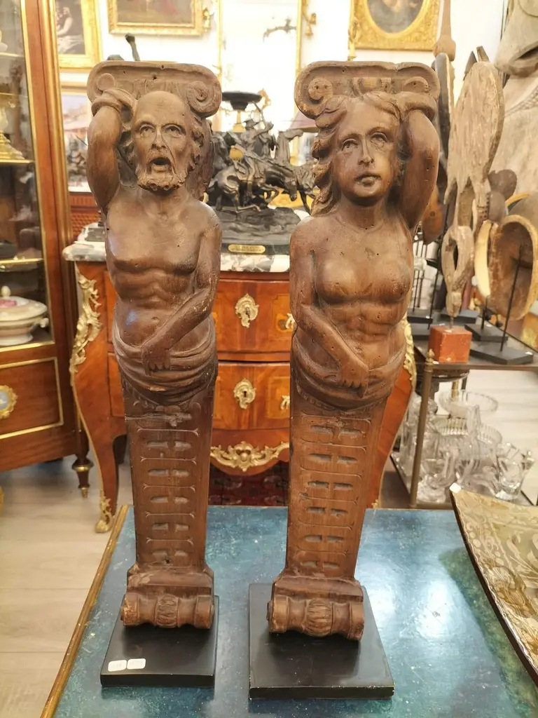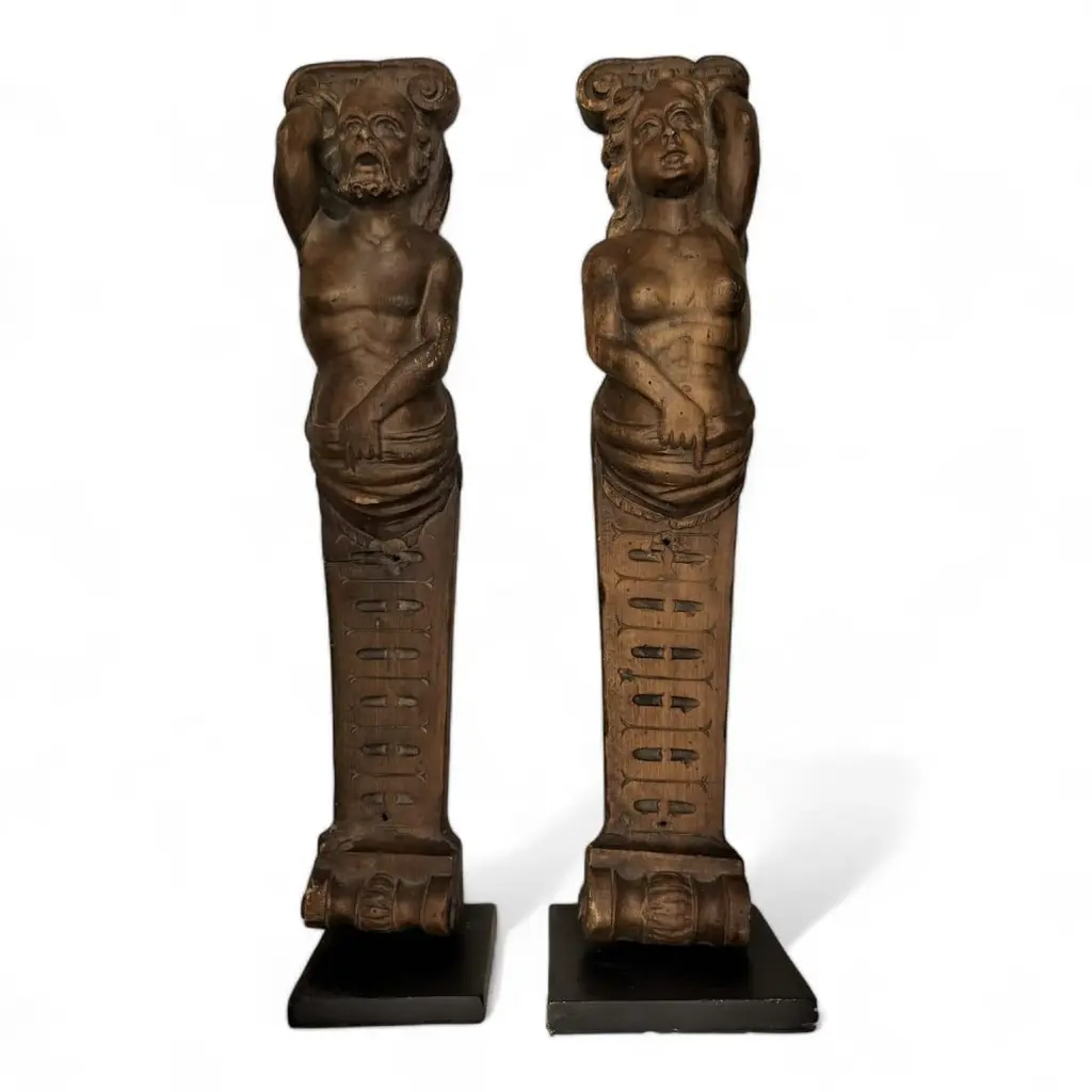 This rare and finely crafted pair of French 17th-century term caryatids is a stunning example of Baroque-era wood sculpture. Executed in molded and sculpted oak, the figures represent a classically draped male and female figure, both shown with bare torsos and elaborate stylized hair, topped with Ionic capitals and terminating in fluted architectural bases.Originally intended as part of a corbel or an architectural woodwork ensemble—perhaps from a monumental fireplace, a grand cabinet, or a wall paneling element—these caryatids served both a structural and decorative function. The term “term” refers to a sculptural figure that merges into a pillar or pilaster form, drawing inspiration from classical antiquity, a motif widely revived during the Renaissance and Baroque periods.The quality of the carving is particularly notable: muscular modeling, expressive facial features, refined detailing of the drapery, and a beautiful aged patina all testify to the work of a highly skilled artisan. These figures reflect the French 17th-century fascination with ancient themes, interpreted through the lens of Baroque dynamism and decorative richness.Whether acquired as collector's items or integrated into a luxury interior design project, these caryatids, very rare on the art market, bring both historical depth and sculptural beauty to any setting.