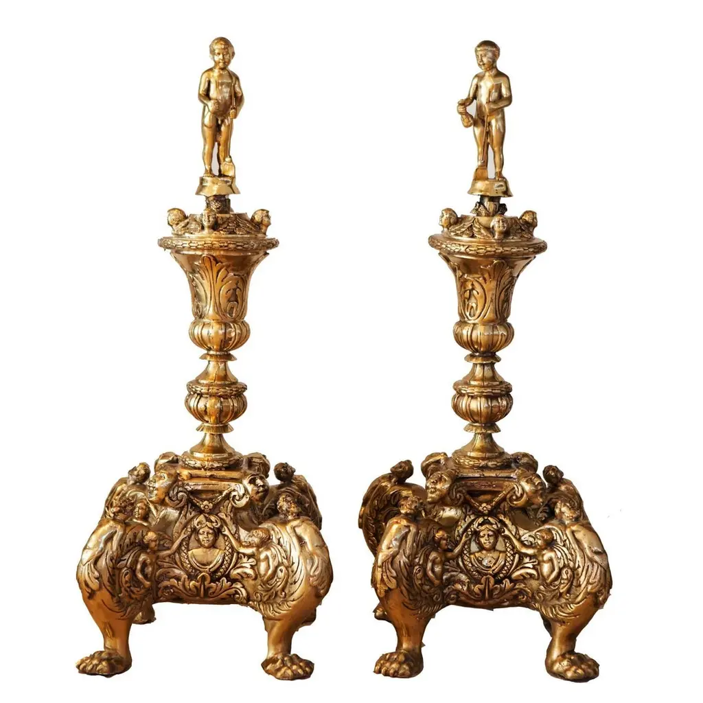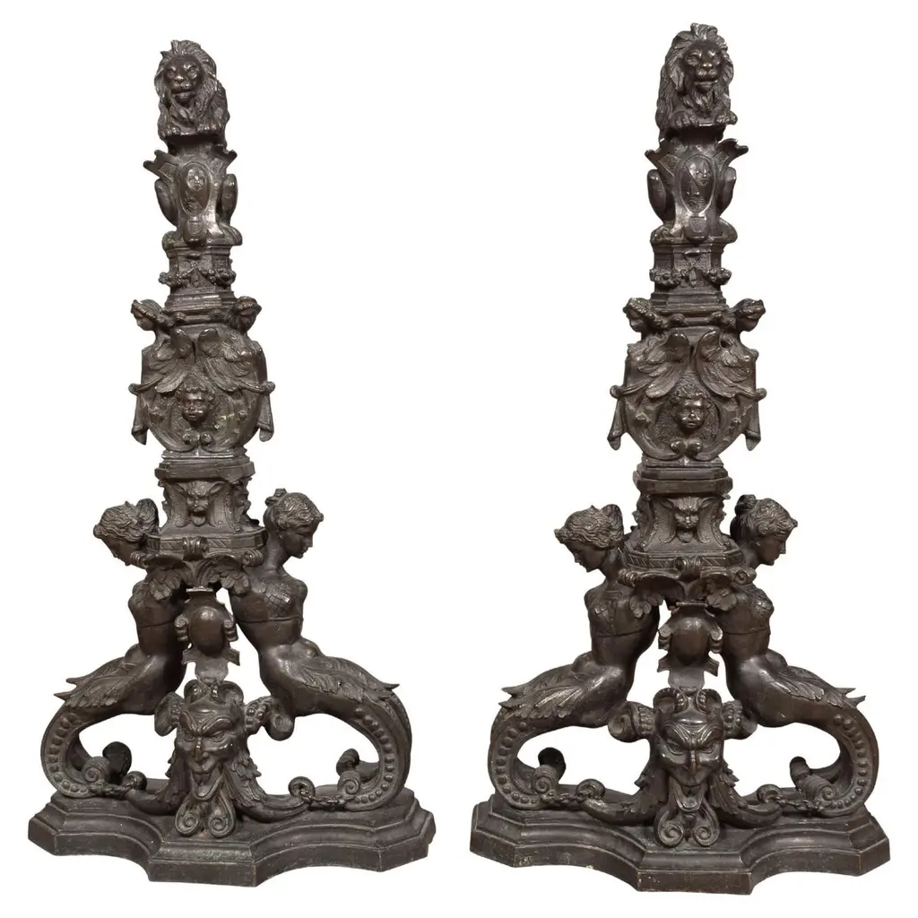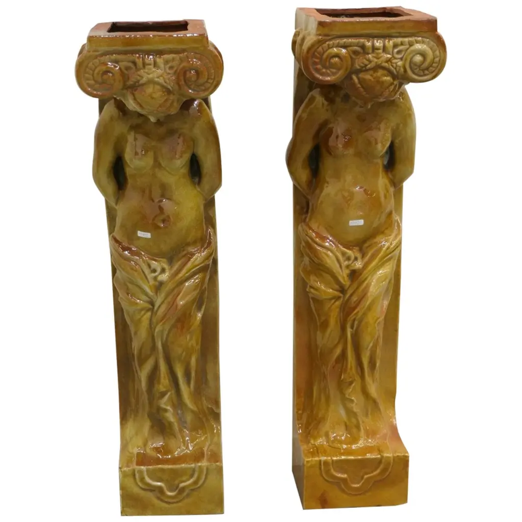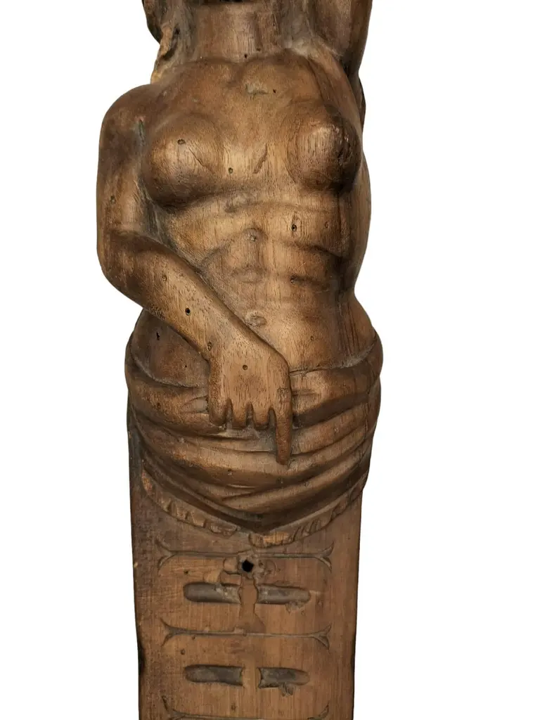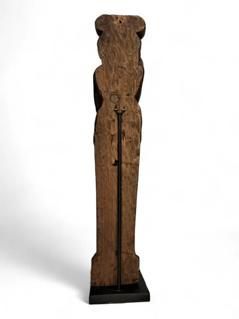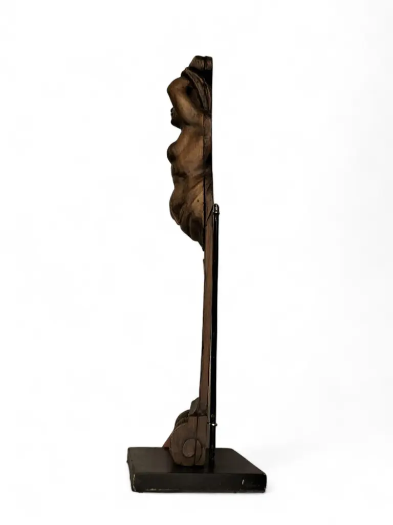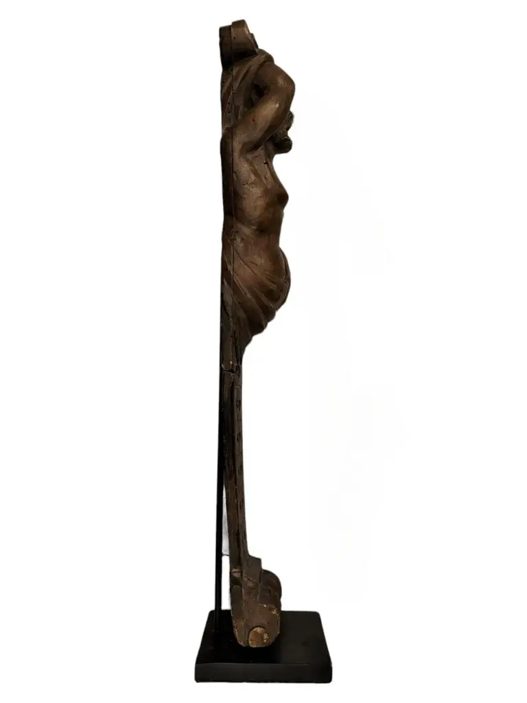 This rare and finely crafted pair of French 17th-century term caryatids is a stunning example of Baroque-era wood sculpture. Executed in molded and sculpted oak, the figures represent a classically draped male and female figure, both shown with bare torsos and elaborate stylized hair, topped with Ionic capitals and terminating in fluted architectural bases.Originally intended as part of a corbel or an architectural woodwork ensemble—perhaps from a monumental fireplace, a grand cabinet, or a wall paneling element—these caryatids served both a structural and decorative function. The term “term” refers to a sculptural figure that merges into a pillar or pilaster form, drawing inspiration from classical antiquity, a motif widely revived during the Renaissance and Baroque periods.The quality of the carving is particularly notable: muscular modeling, expressive facial features, refined detailing of the drapery, and a beautiful aged patina all testify to the work of a highly skilled artisan. These figures reflect the French 17th-century fascination with ancient themes, interpreted through the lens of Baroque dynamism and decorative richness.Whether acquired as collector's items or integrated into a luxury interior design project, these caryatids, very rare on the art market, bring both historical depth and sculptural beauty to any setting.