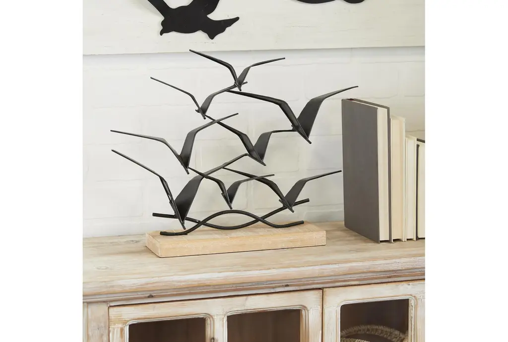 Inspired by blissful serenity and the allure of the sea, this 19" X 14" Black Metal Bird Sculpture brings effortless charm to your home. Crafted from iron, fir wood, and MDF, this decorative piece boasts a solid and durable form. The sculpture features flying birds with a matte black finish, elegantly perched on a natural wood base with a rich brown hue.