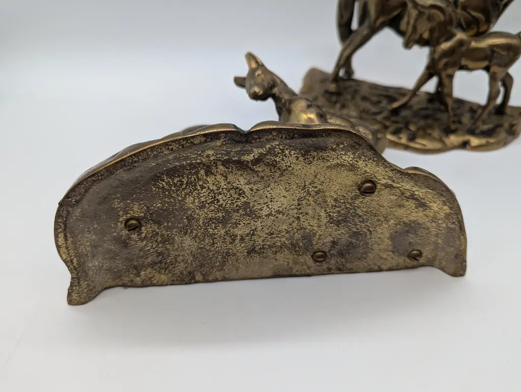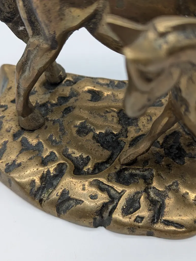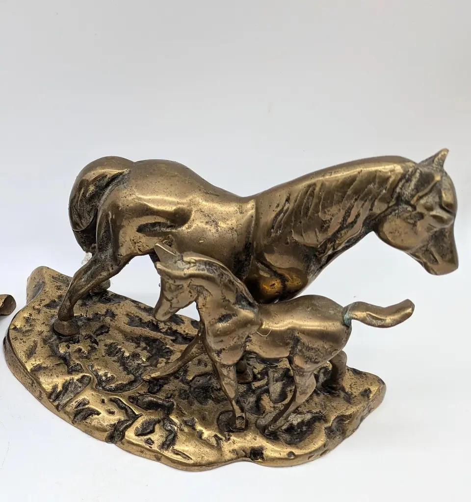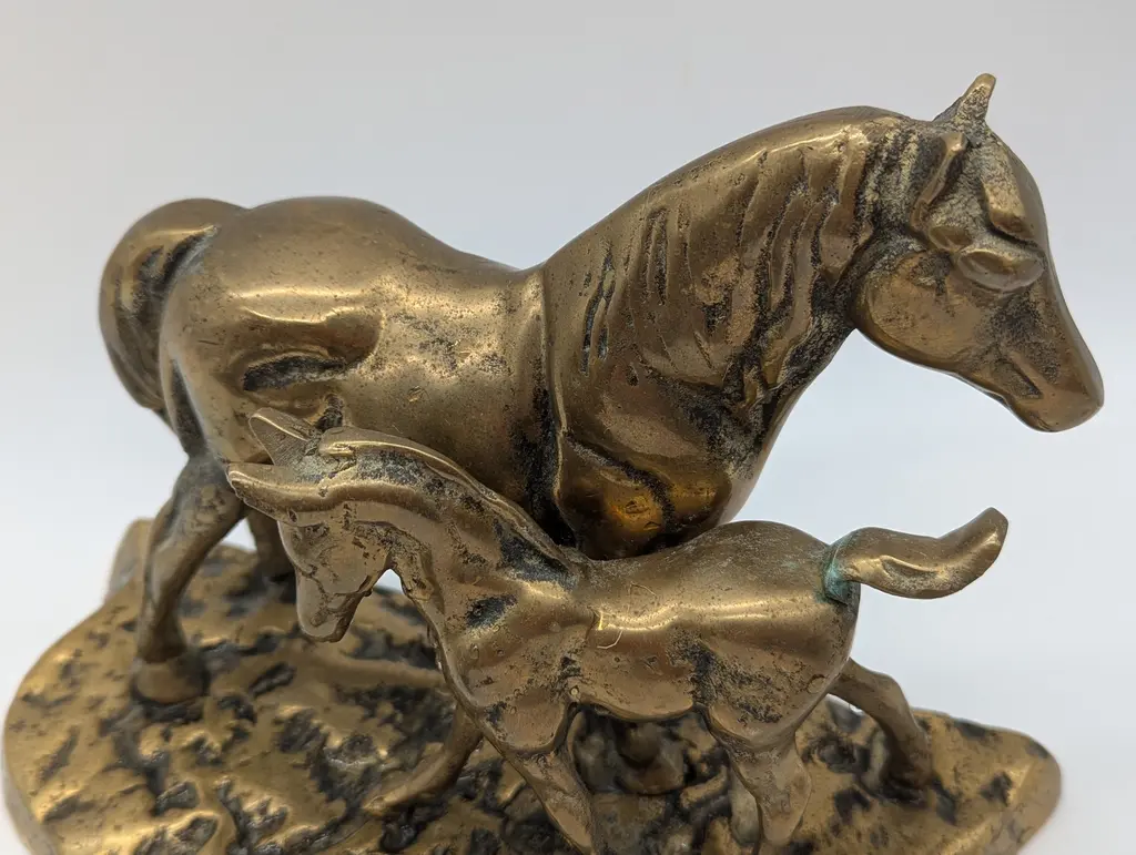 Lovely vintage brass statue of a mare and foal. Perfect for MCM or horse decor lovers. Would make a great mantel piece. Heavy, solid brass. Approx. 5lbs and 6" tall, and 8" x 3.25". Good vintage condition. Some spots of discoloration and patina. 2 available of the same design.