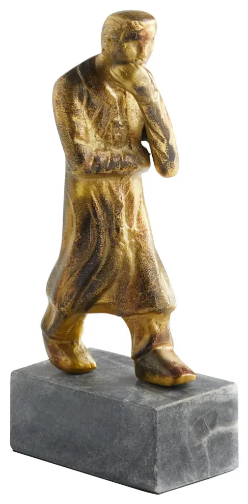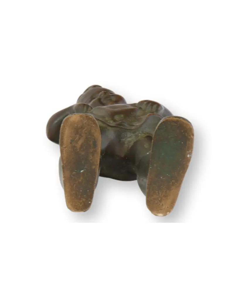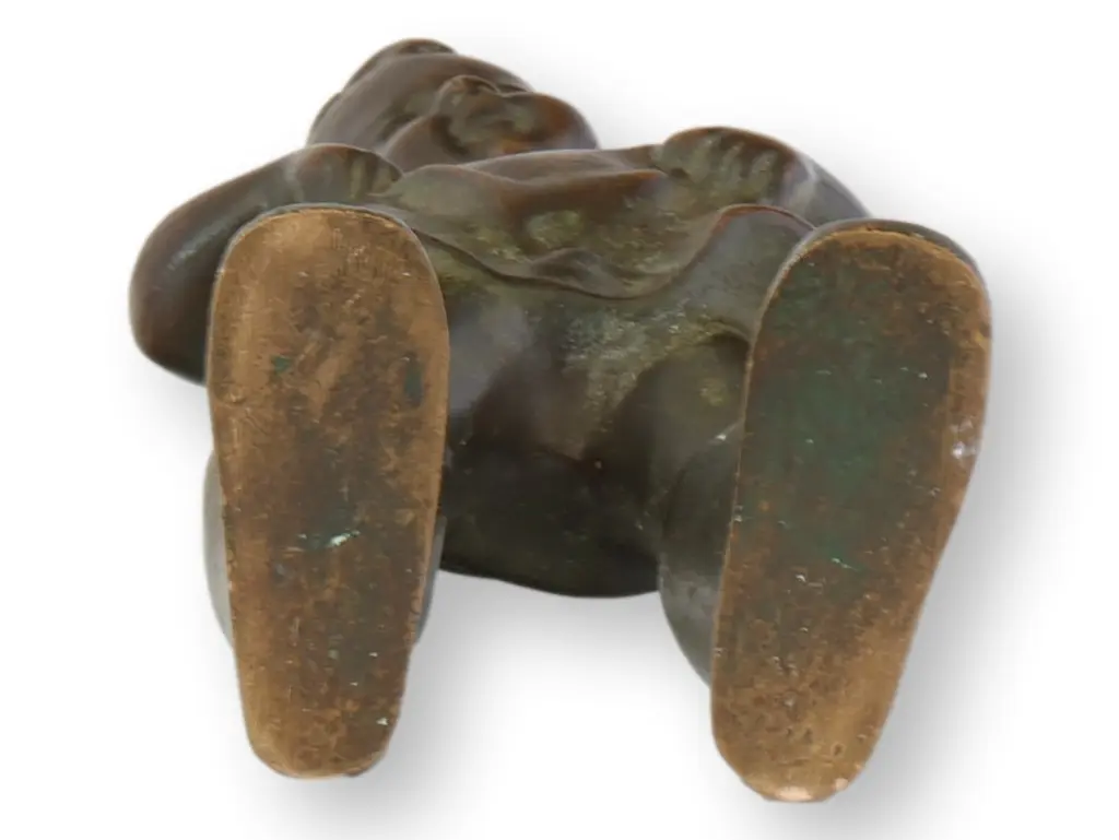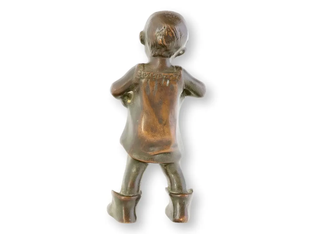 A sweetly humorous bronze sculpture from 19th-century Denmark, featuring a young child proudly donning oversized boots. The expressive stance—chin up, hands in pockets, and feet wide apart—captures a charming moment of play and confidence. Cast in bronze with a warm, naturally aged patina. Unsigned.