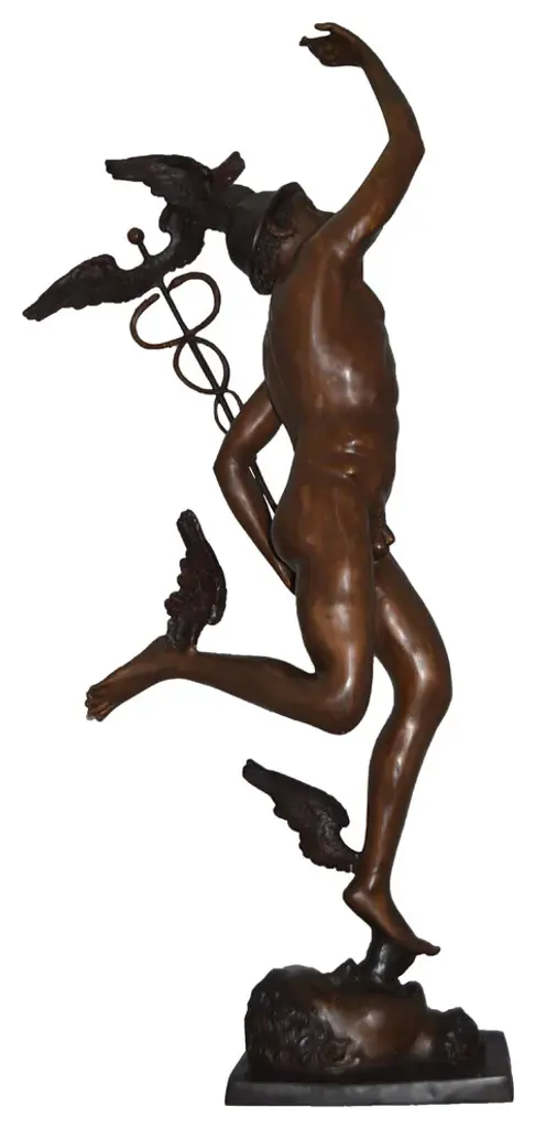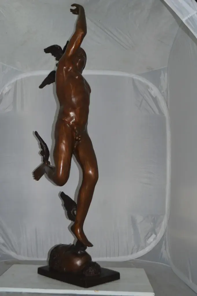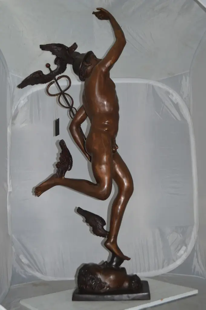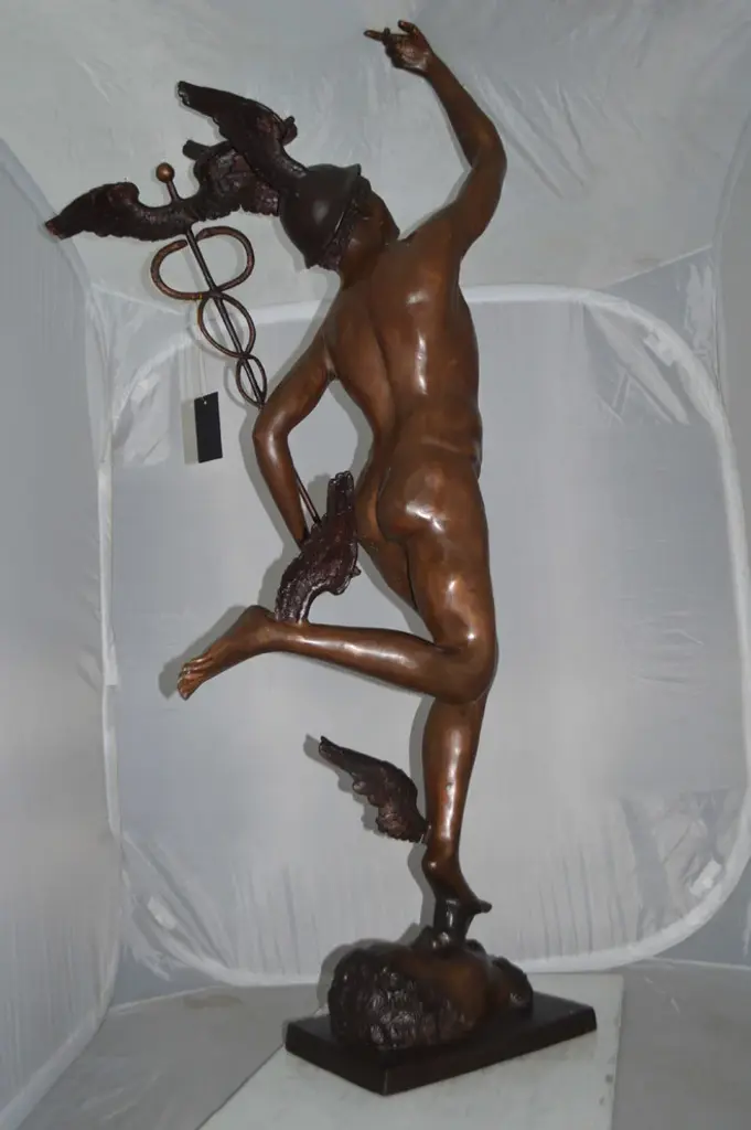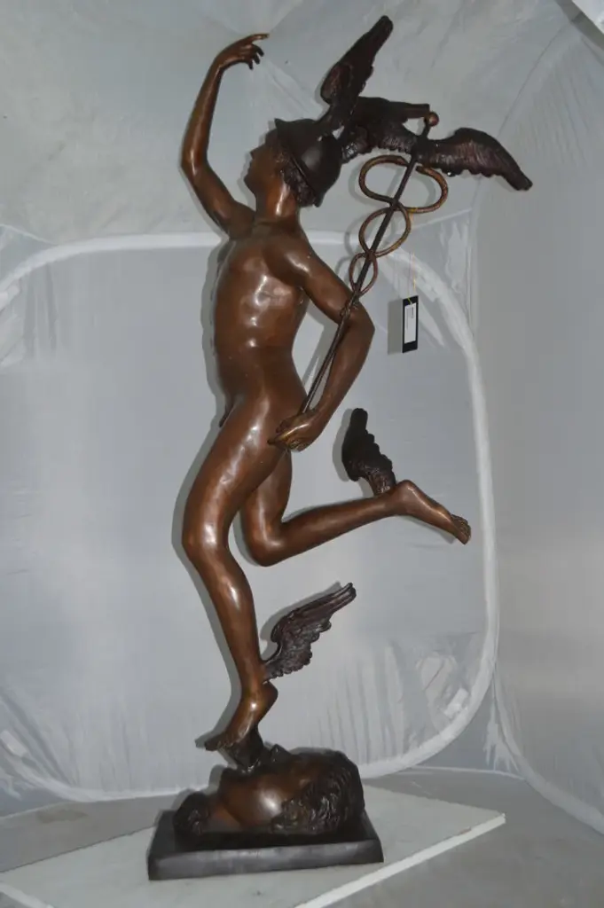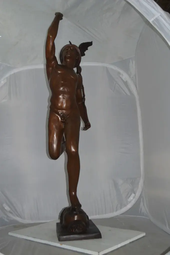 This statue/sculpture represents Mercury or Hermes, in relations to the Roman or Greek denomination of the gods. The original was sculpted by Giambologna in the 16th century. This bronze statue is museum quality and hand-cast in high-quality bronze using the "œLost Wax Process"� of bronze casting over a very special stone. Size: 23"L x 13"W x 64"H. Weight is: 60Lb