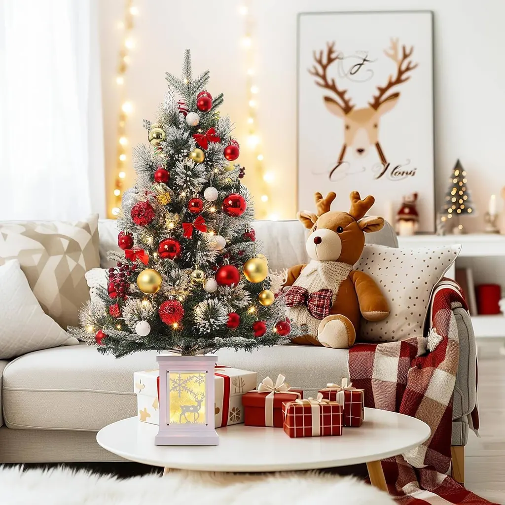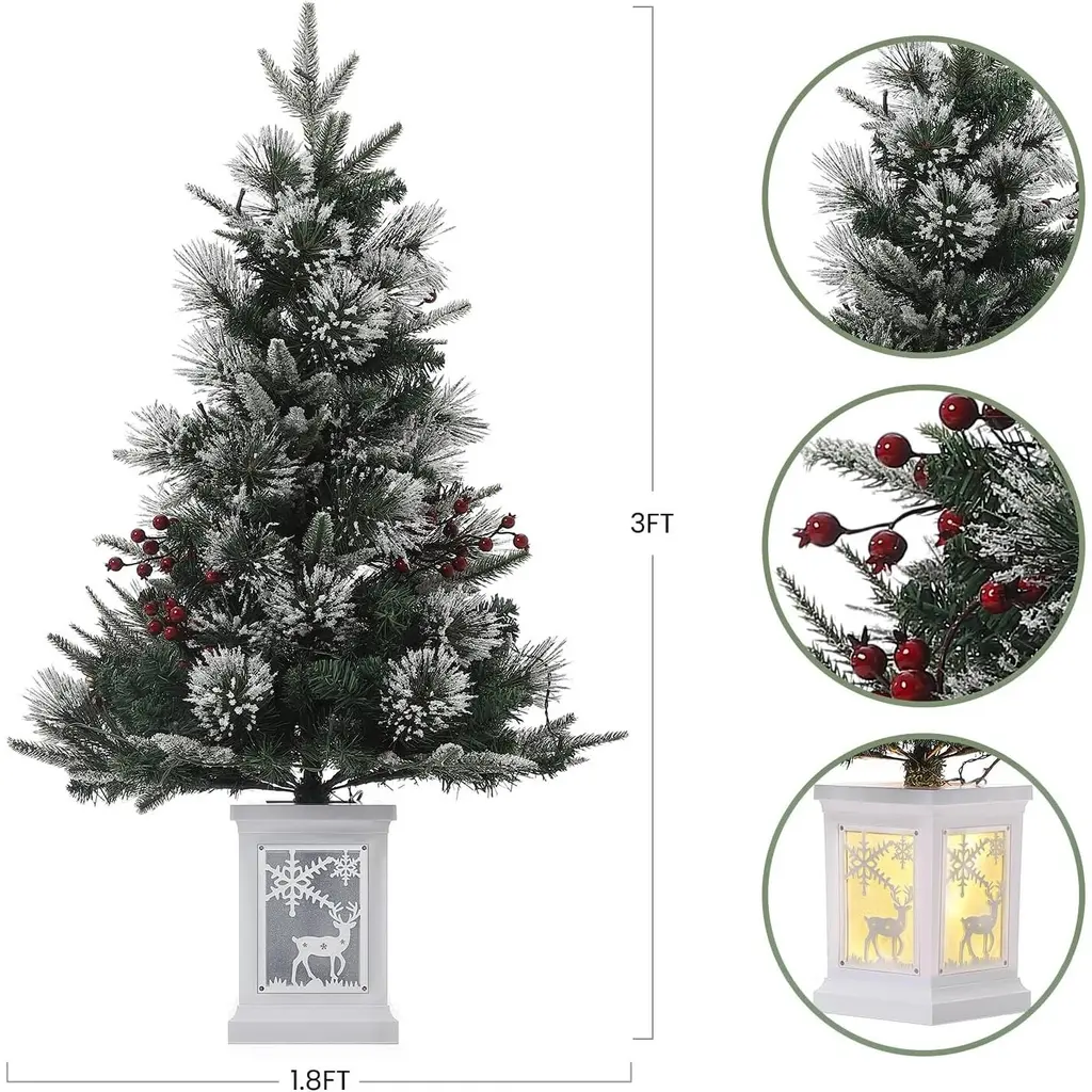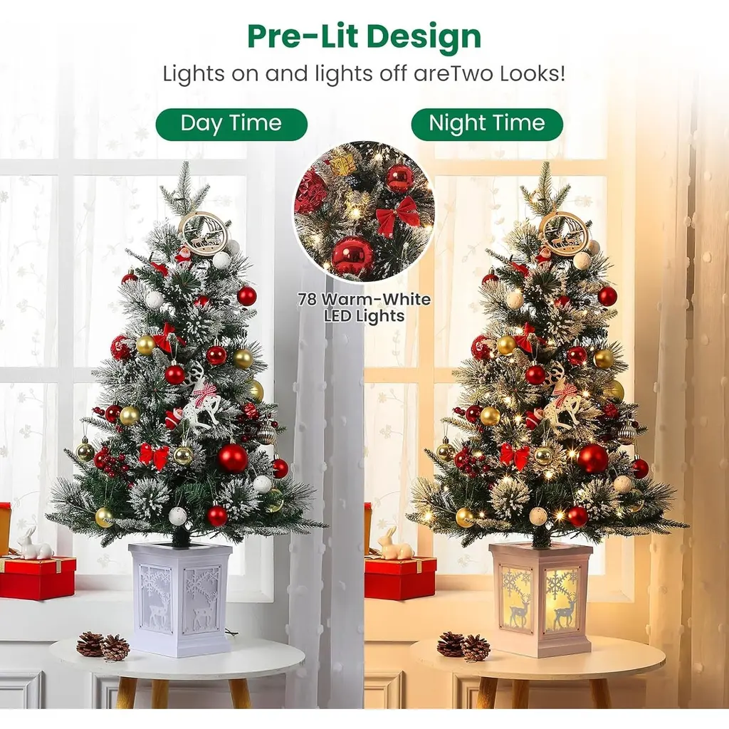 Realistic Appearance: The artificial Christmas tree features fluffy branch tips and vibrant foliage that closely resemble a real spruce. The stunning tree adds an authentic touch to your holiday decor, making it a perfect centerpiece for your home Pre-Lit Convenience: Create a festive ambiance effortlessly with the pre-lit Christmas tree, featuring dazzling optic fibers and 78 dual-color LED lights for a warm glow. An integrated timer automatically turns off after 16 hours for worry-free enjoyment Safe and Durable Materials: Crafted from premium, flame-retardant PVC, this fake Christmas tree is safe for your home. Made from allergen-free materials, its robust, crack-resistant design ensures longevity, allowing for seasonal enjoyment year after year Space-Saving Design: Standing at just 3ft tall, this compact small Christmas tree is perfect for tabletops or countertops. Its design allows for easy storage and transport, making it ideal for limited spaces while still bringing holiday cheer Versatile Holiday Decoration: This 3 ft mini Christmas tree is a charming addition to any home, office, or commercial display. It also makes a thoughtful gift, spreading holiday joy and creating a festive atmosphere wherever it goes