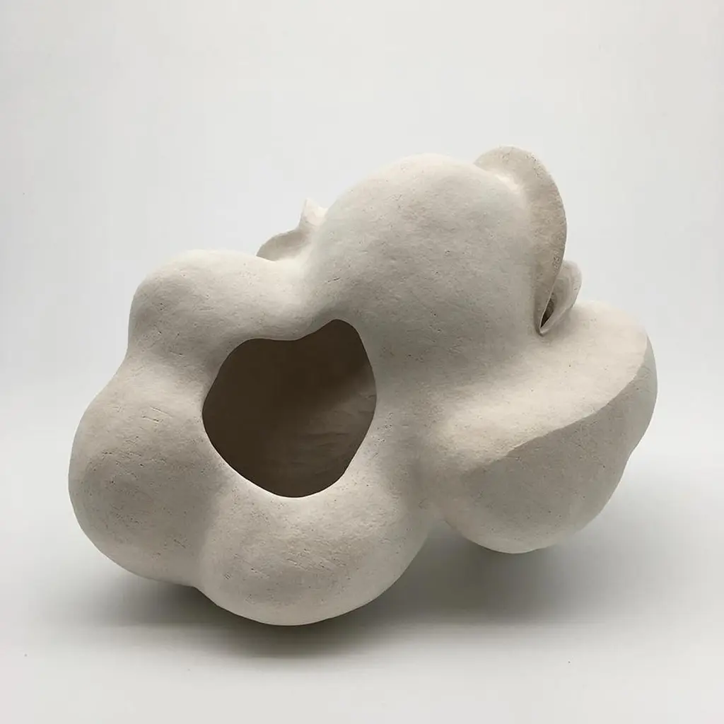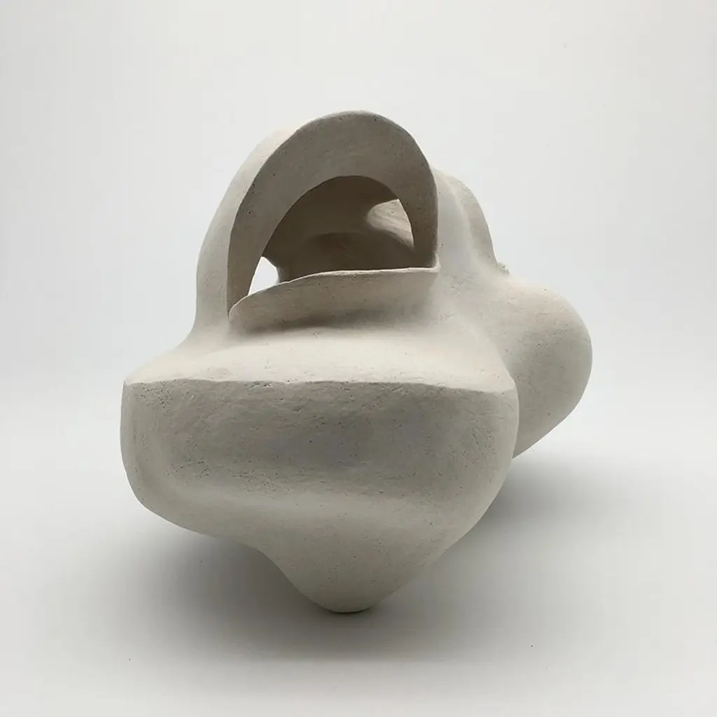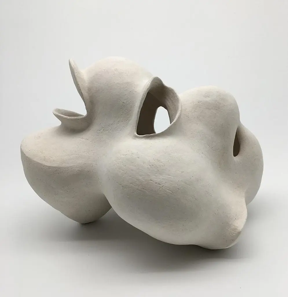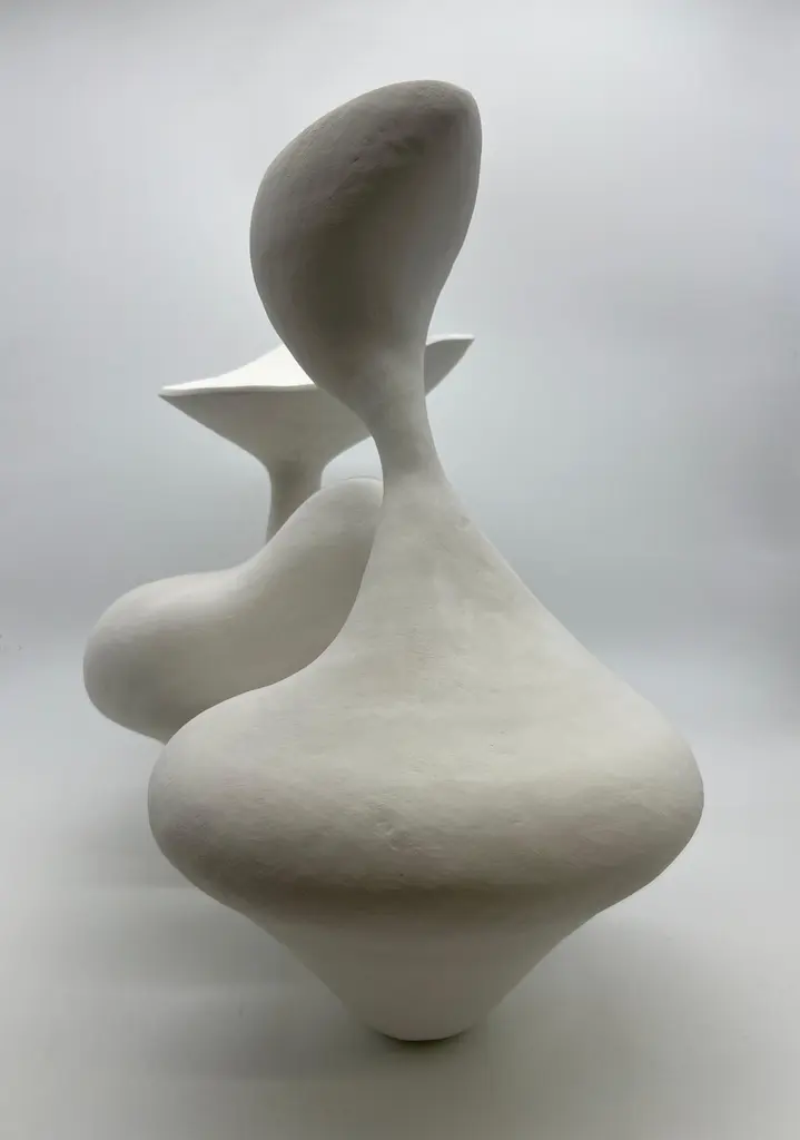 #2 Sculpture by Evamarie PappasDimensions: D 16.51 x W 16.51 x H 50.16 cmMaterials: Stoneware.This sculpture is incomplete. it will be fired once again with an underglaze.For Evamarie Pappas, making art is a family affair. She lives and works in the Florida home she shares with her husband, Gary Oglander, an abstract painter. The pair, who met while Evamarie was studying art at Ringling College of Art and Design in Florida, frequently collaborate on ceramic works and often exhibit with their sons, Daniel and Eric. "We critique each other honestly," she says. "There was never a competition between us."Organic in form, Pappas's ceramic sculptures draw inspiration from the forests and gardens that surround her home, as well as the ocean. She notes, "I would say I'm most influenced by nature. I often think about a plant or a seed pod. I think about how they might move or grow." Her process is intuitive and unconscious. "Once I start, I put everything out of my mind and let [a piece] become what it wants to become," she says. When a form is complete, Pappas sometimes hands the vessel over to her husband to paint. "Every time he paints something, I feel like he has enhanced my work," she says. For Pappas, life itself is a form of artmaking. "I work long hours, and I love it. I sleep really well. And I have a lot of energy."