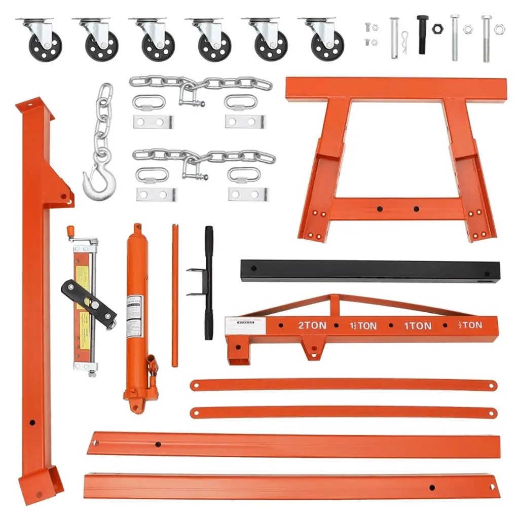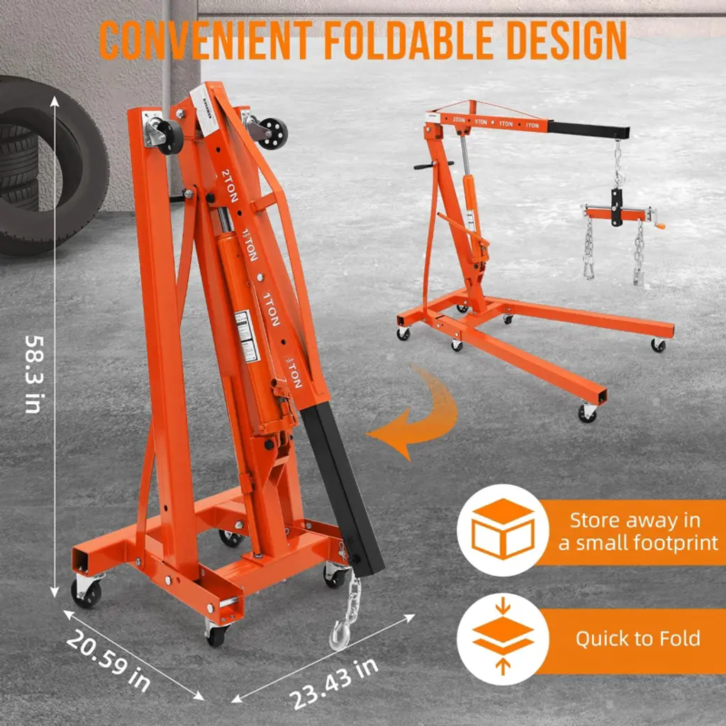 Engine Hoist 2 Ton, Folding Hydraulic Engine Crane with Lever ¨C 4400 LB Capacity Cherry Picker with 6 Wheels, Adjustable Boom & Foldable Design for Garage and WorkshopProduct Description:Transform heavy lifting tasks with our robust 2-Ton Folding Hydraulic Engine Hoist! Designed for professional and DIY use, this cherry picker combines a high-strength steel frame, an 8-ton hydraulic pump, and a 2-in-1 design integrating a crane and leveling tool. With a 4400 lb capacity, four adjustable boom positions (1/2 to 2 tons), and six wheels for smooth mobility, this hoist handles engines, transmissions, axles, and other heavy components with precision. The foldable design and retractable outriggers ensure easy storage and adaptability in tight garage or workshop spaces.Key Features & Benefits:1. Heavy-Duty Steel ConstructionCrafted from high-strength steel, this engine hoist supports up to 4400 lbs (2 tons) and features an 8-ton hydraulic pump for reliable, leak-free lifting. Built to withstand rigorous use in garages and workshops.2. 2-in-1 Crane & Leveling ToolSkip the cost of separate tools! This hoist doubles as a leveling device, providing balanced lifting for engines and other irregularly shaped loads. Save time and effort during extractions or installations.3. Precision Adjustable BoomThe boom offers four adjustable positions to match your load: ? Ton 1 Ton 1.5 Ton 2 TonCustomize the reach and capacity for engines, transmissions, or automotive parts of varying sizes. 4. Enhanced Mobility & StabilitySix wheels (including two swivel casters) enable easy maneuvering around workspaces. Retractable outriggers extend for added stability during lifts, preventing shifts or tipping.5. Space-Saving Foldable DesignQuickly fold the hoist into a compact unit for storage. Ideal for small garages or workshops where space is limited.6. Versatile ApplicationsPerfect for lifting engines, axles, motorcycles, transmissions, and other heavy items (under 4400 lbs) in auto repair shops, home garages, or industrial settings.Specifications: Brand: Generic (as unspecified in source) Load Capacity: 2 Tons (4400 lbs) Hydraulic Pump: 8-Ton Rated Boom Positions: 4 (?T, 1T, 1.5T, 2T) Wheels: 6 Total (2 swivel + 4 fixed) Outriggers: Retractable for stability Design: Foldable for storage Material: Heavy-Duty Steel Ideal For: Engines, transmissions, axles, automotive parts Why Choose This Engine Hoist? ? 4400 lb capacity for heavy loads ? 2-in-1 crane and leveling functionality ? Adjustable boom for precision lifting ? Foldable design with easy storage ? Six wheels and outriggers for mobility and stability