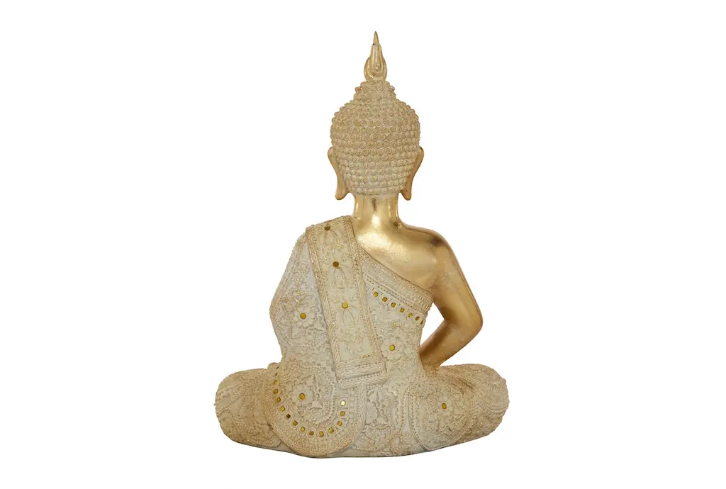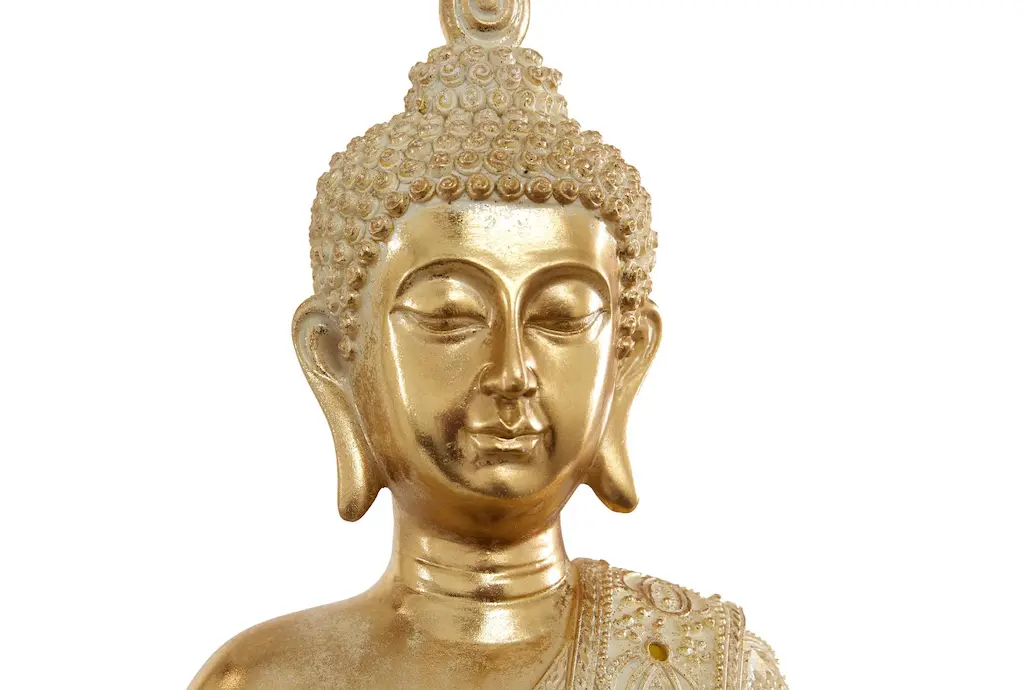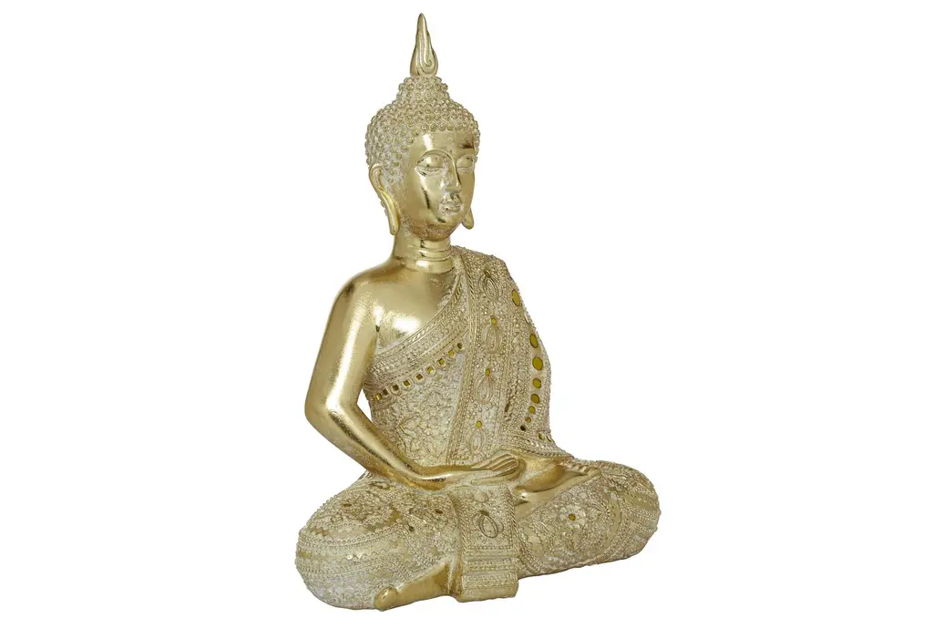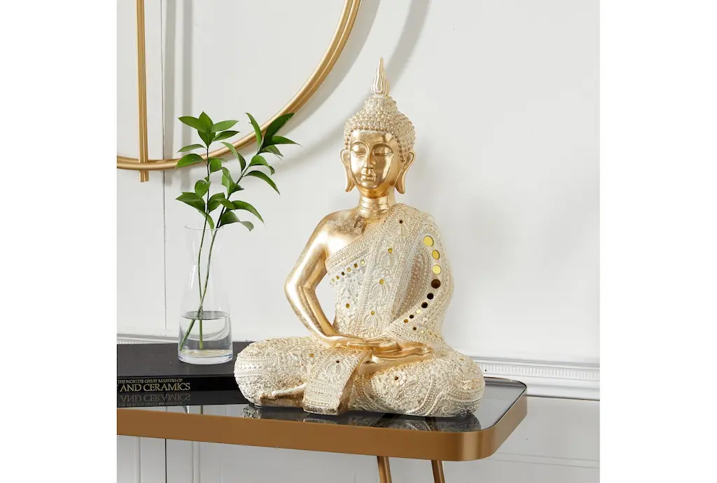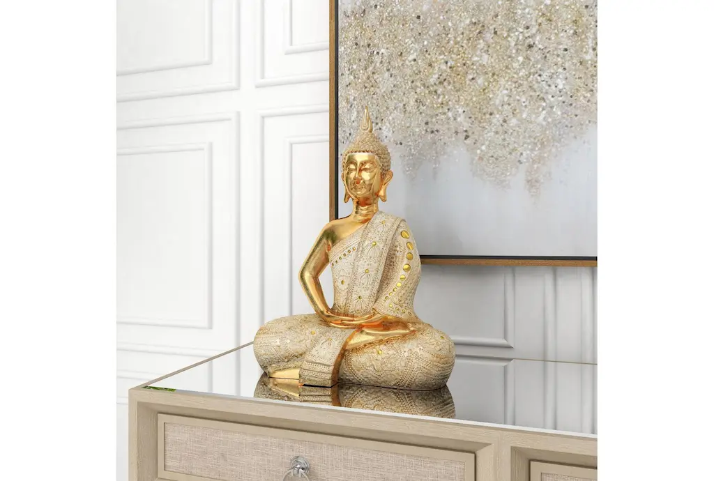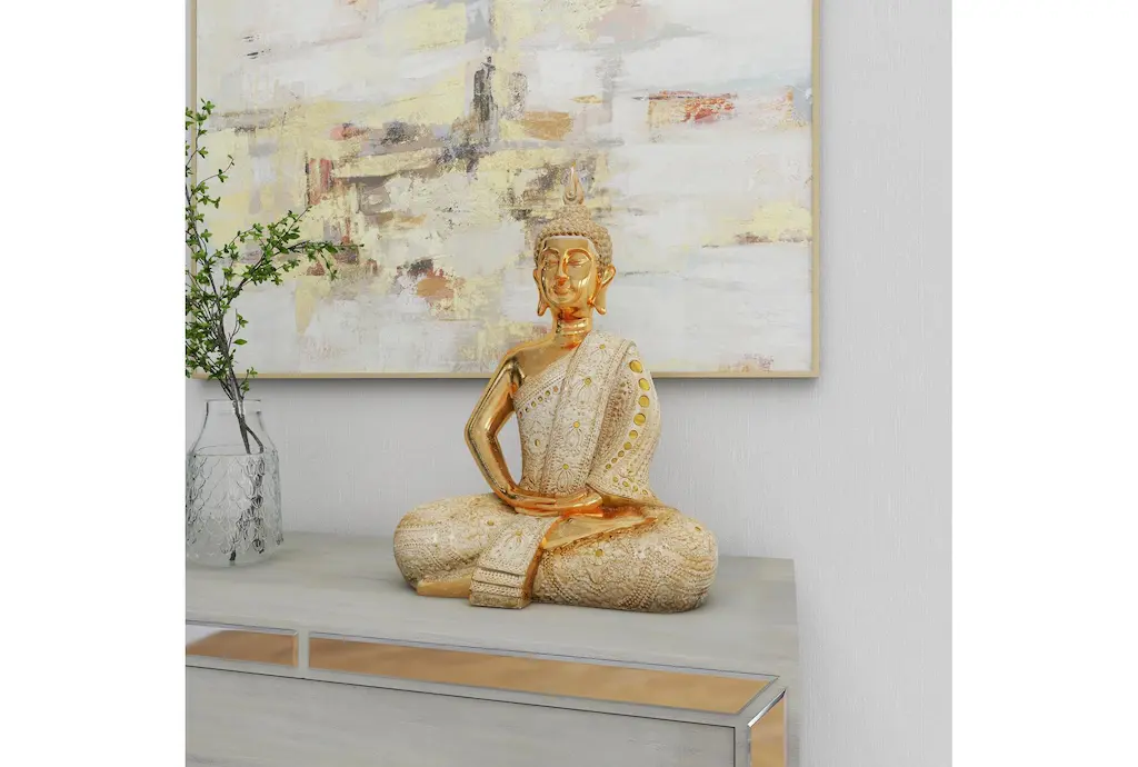 An artistic display to showcase your personality and enhance the look of any open table top space. An artistic display to showcase your personality and enhance the look of any open table top space. Create a calming and peaceful atmosphere with this buddha sculpture ideal for neutral color background. Designed with felt or rubber stoppers at the base that prevent scratching furniture and table tops, as well as sliding around. This item ships in 1 carton. Please note that this item is for decorative use only. Polystone sculpture makes a great gift for any occasion. Suitable for indoor use only. This item ships fully assembled in one piece. This is a single gold colored statue. Glam style.