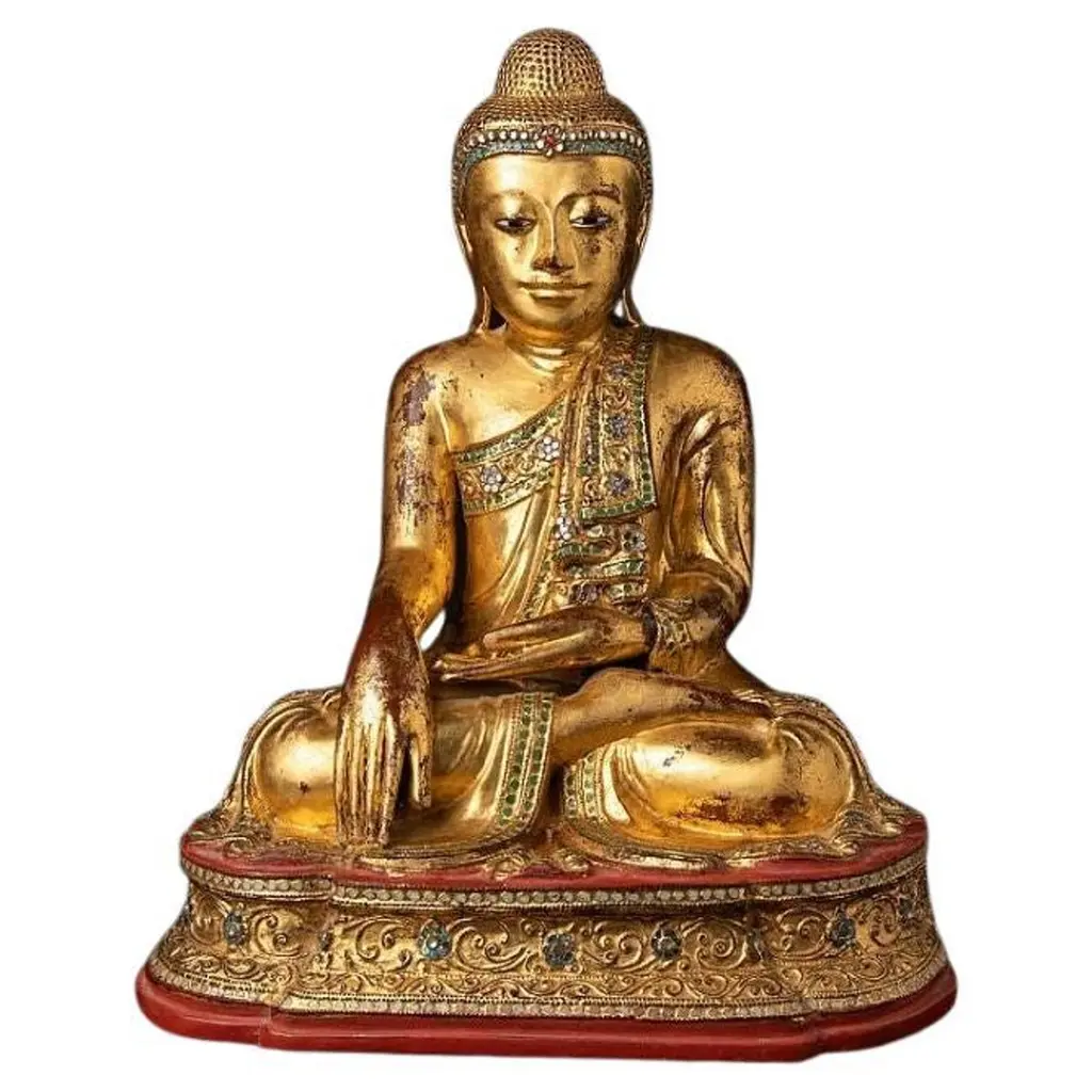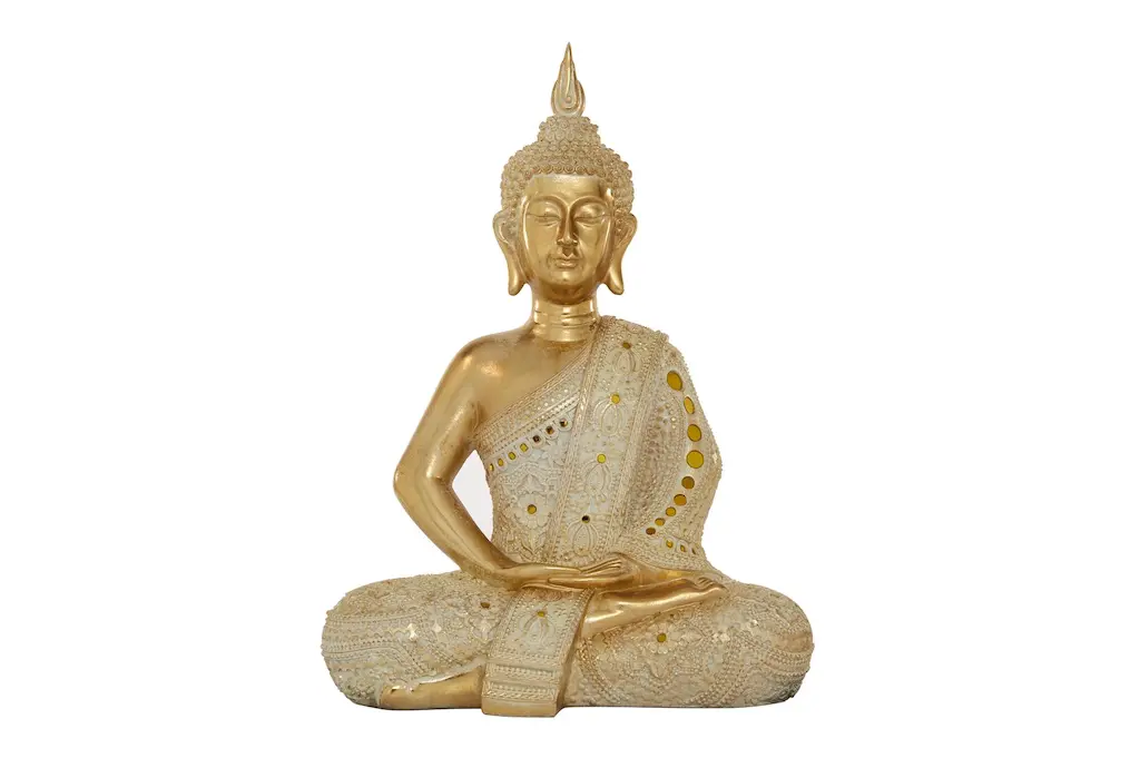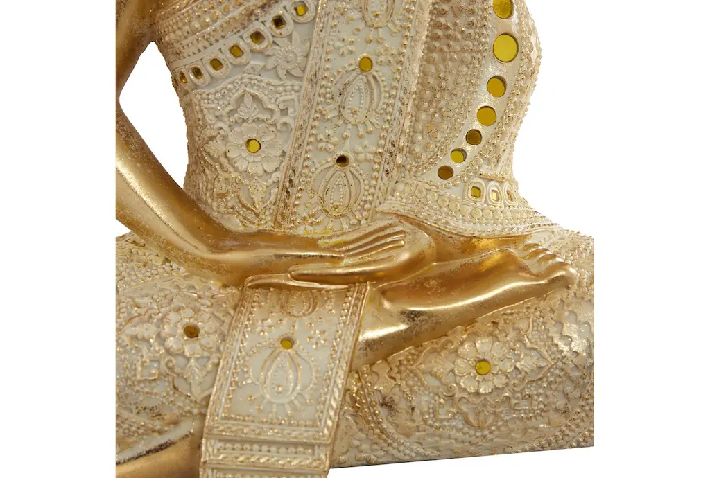 20 Inch Natural Gold Polystone Multi-Media Glam Buddha Sculpture With Intricate Carvings And Mirrored Embellishments