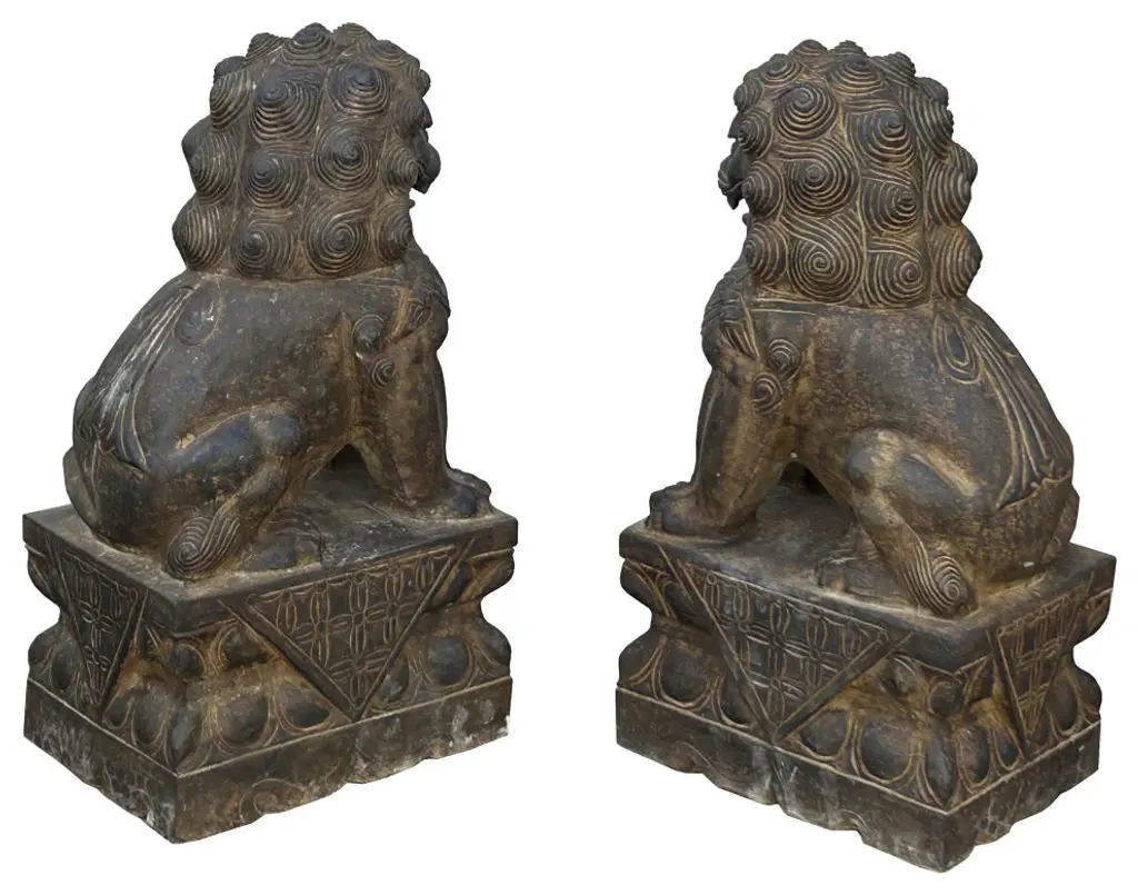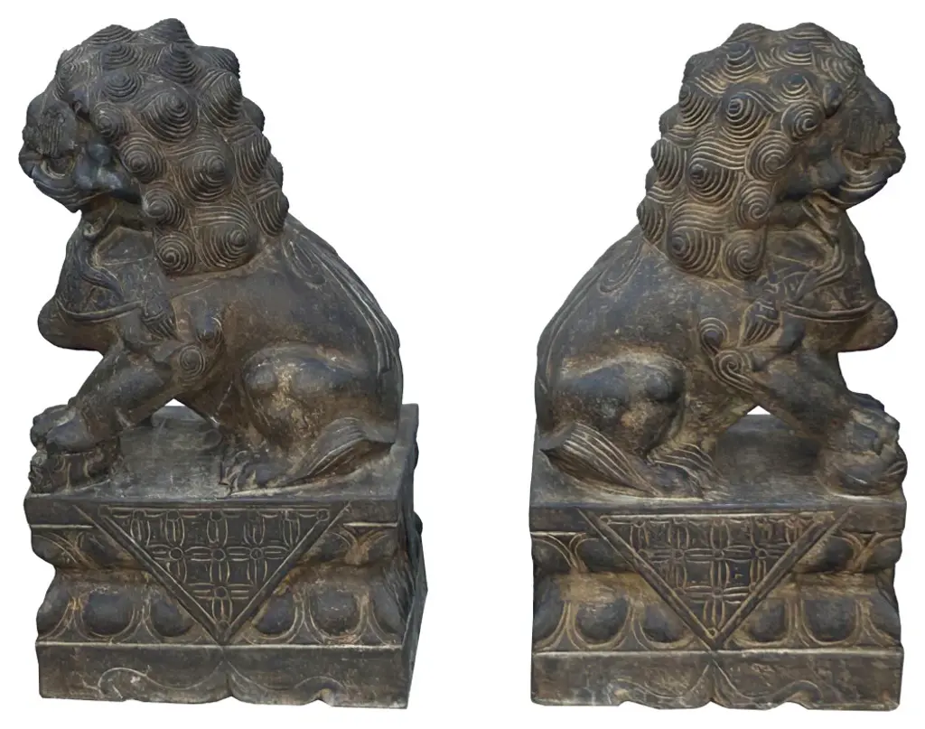 The Pair Chinese Rustic Brown Marks Stone Fengshui Foo Dogs Lions Statue is a stunning embodiment of traditional Chinese symbolism and craftsmanship. Crafted from natural stone, these statues exude elegance and grace, making them a captivating addition to any space.Standing majestically, these foo dogs, also known as guardian lions, are depicted in a classic pose: one with its paw resting on a ball, representing supremacy over the world, and the other with its paw on a playful cub, symbolizing protection and nurturing. Each intricate detail, from their flowing manes to their fierce expressions, is meticulously carved, showcasing the skill and artistry of the sculptor.In Chinese culture, foo dogs are believed to possess protective powers, guarding against evil spirits and negative energy. Placing them at the entrance of a home or business is thought to invite good fortune and ward off malevolent forces. As such, these statues not only serve as exquisite decorative pieces but also carry deep cultural significance and spiritual symbolism.Whether displayed indoors or outdoors, the Pair Chinese Rustic Distressed Stone Fengshui Foo Dogs Lions Statue commands attention and admiration, serving as a timeless symbol of strength, protection, and prosperity.Dimensions: w7.5" x d11" x h20" eachOrigin: ChinaMaterial: StoneCondition: hand-carved, natural stone marks, edge chips, dirt.For all USA domestic continental customers (from 48 states), there is a flat shipping fee of $290, which includes insurance and handling charges. (Additional shipping charges apply to buyers from Hawaii, Alaska, US Islands, Florida Keywest, and Canada). If you are in the San Francisco Bay Area, we warmly encourage you to take advantage of our convenient in-store pick-up option at no extra cost. Please keep all original packing material and box if damage happens.