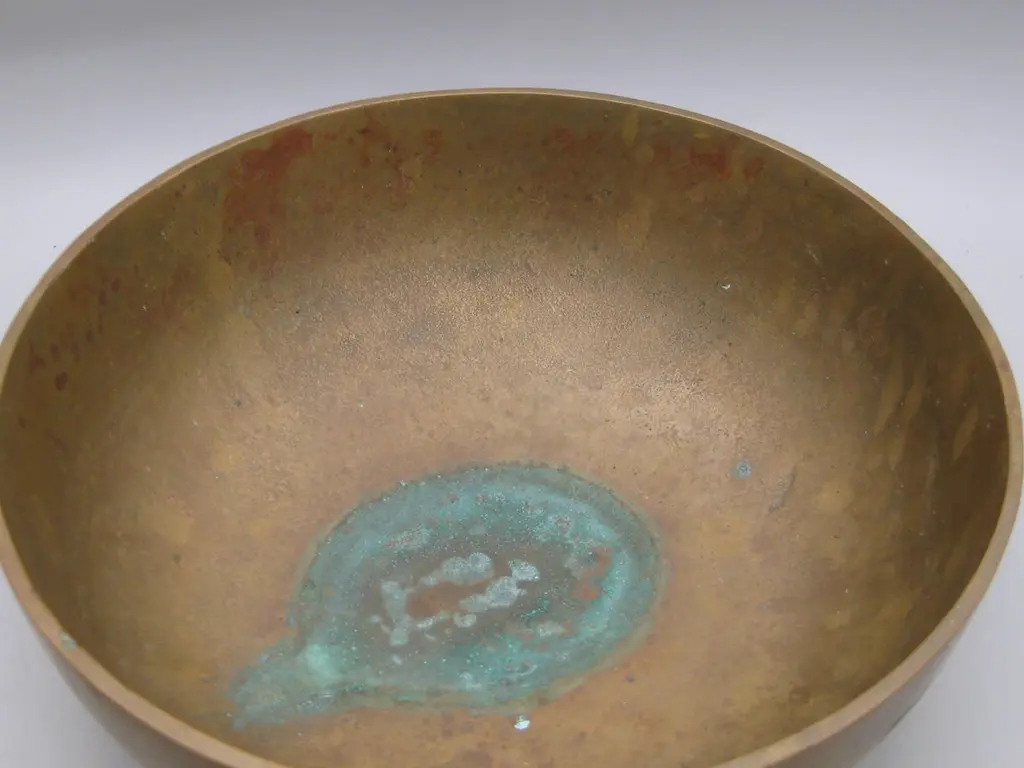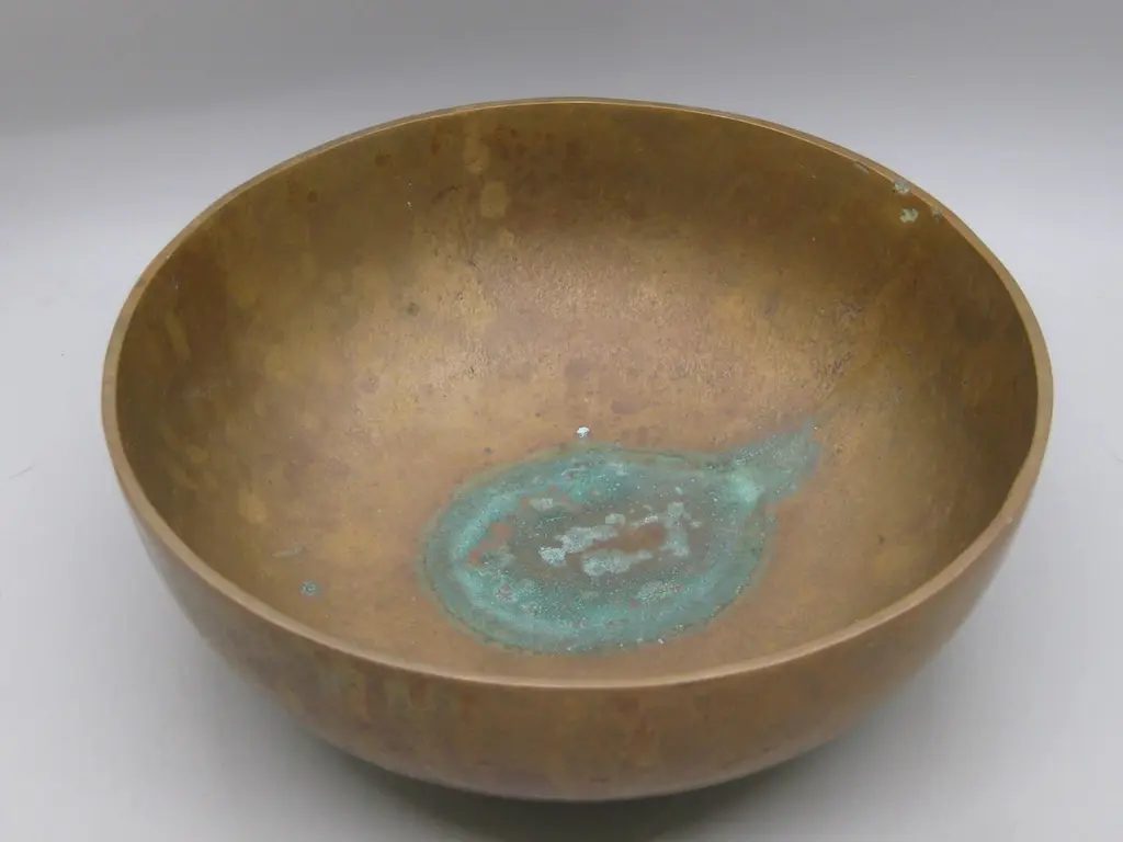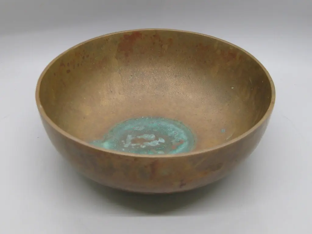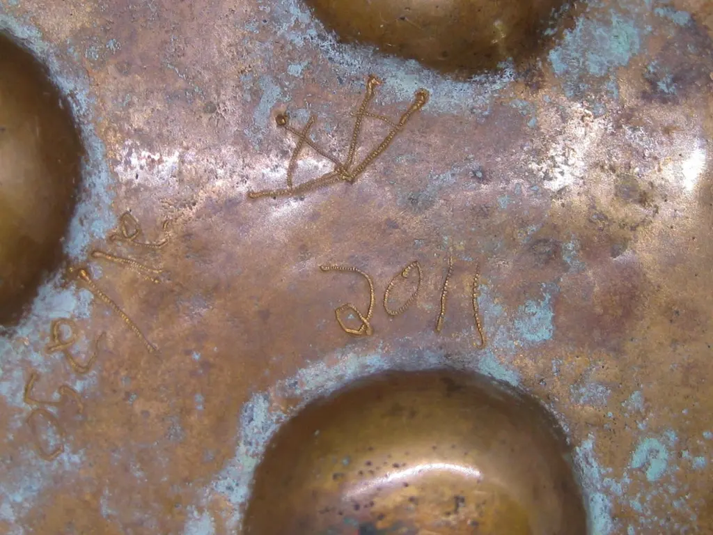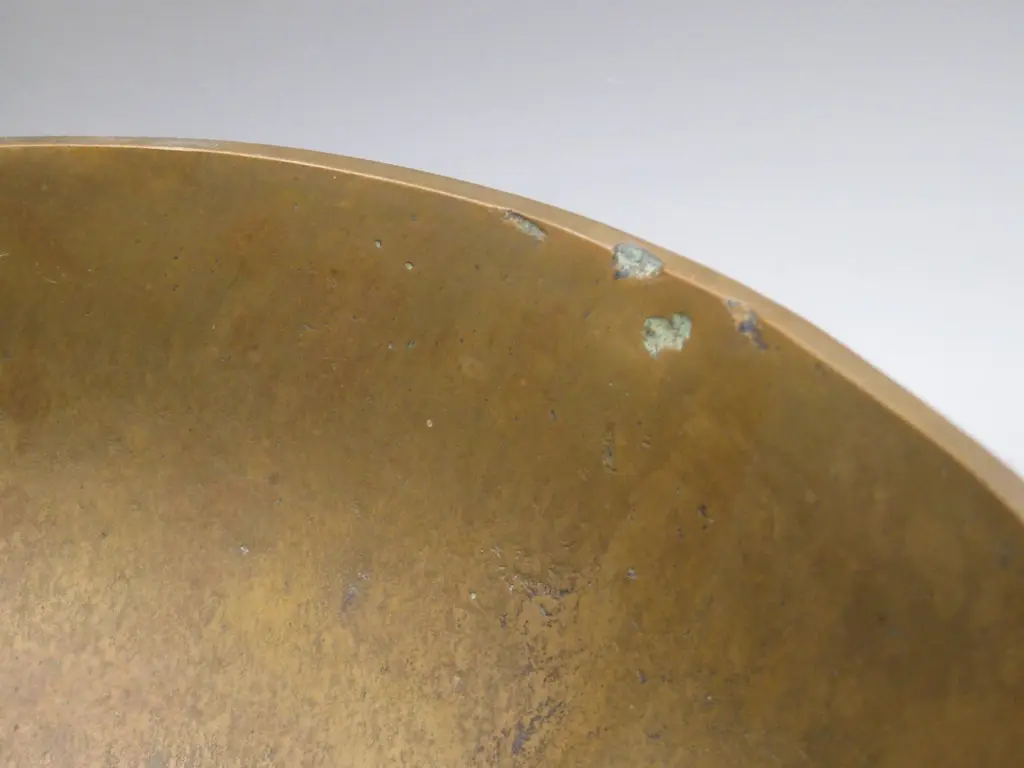 We are offering a wonderful solid bronze modernist footed bowl by artist Alma Allen. This bowl dates from 2011 and is number 21 of 250 made. Signed with the artists initials, numbered and dates on the bottom. Wonderful form and design. The bowl is in very nice condition with a wonderful patina. It can be polished if you desire to do so. Inner surface has some green tarnish from age and will polish off. No cracks, no repairs, no chips and no dents. A couple casting marks but from when the item was made and are original to the pieces. Weight unpacked is 4 pounds 2 ounces.Measures: 3" tall by 7 1/2" at the widest point.