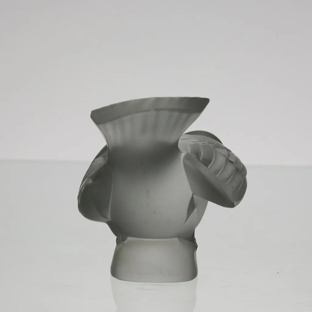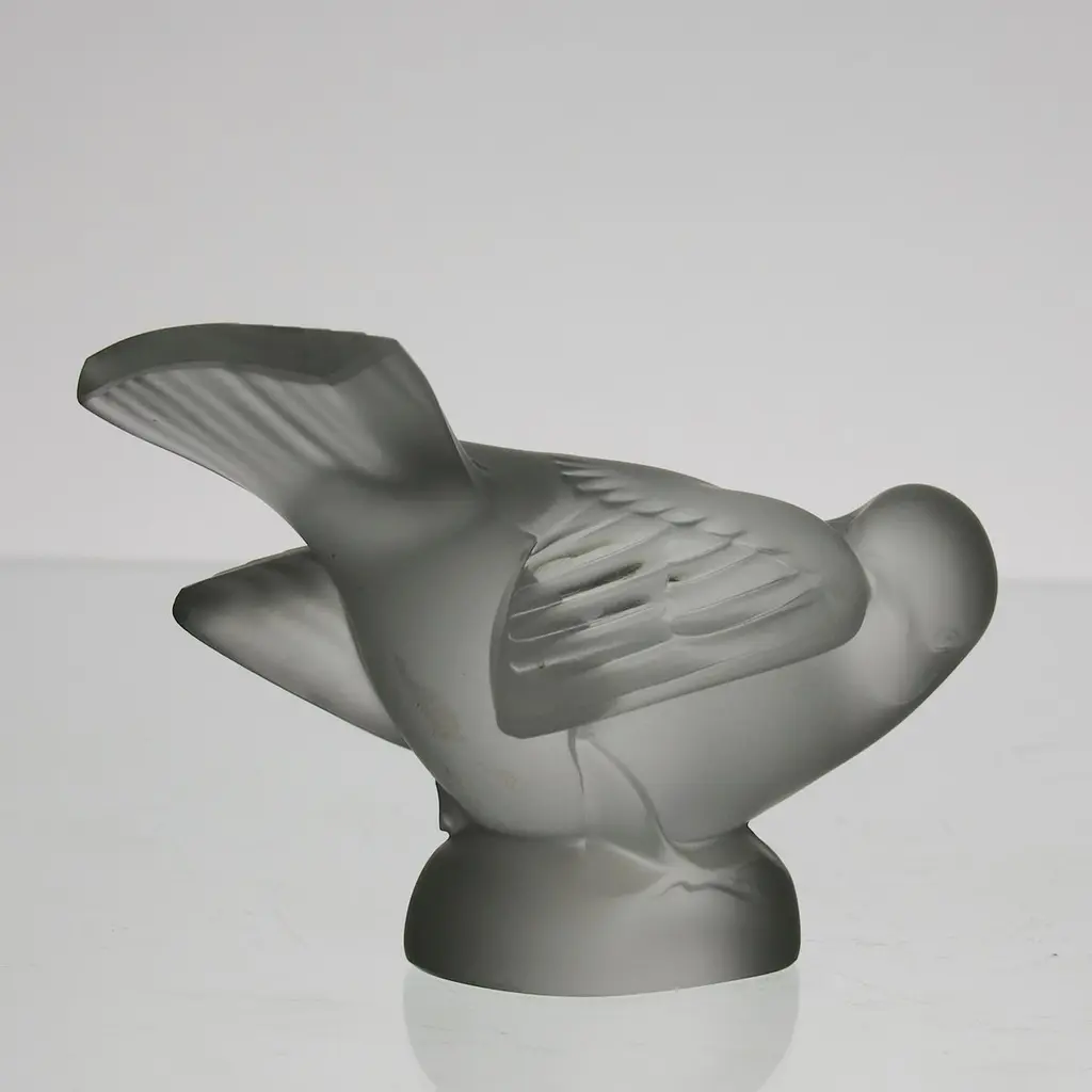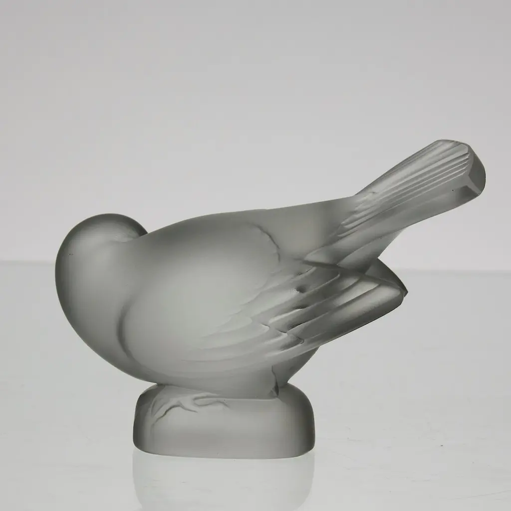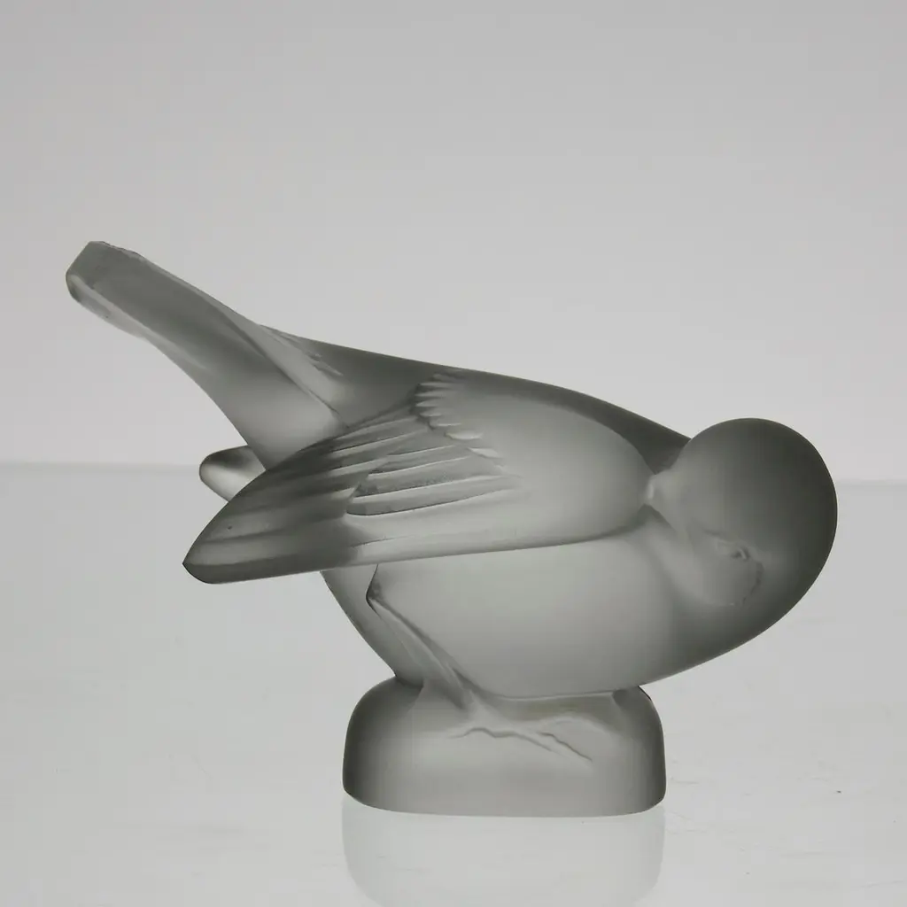 An excellent frosted glass figure of a crouched sparrow with its head turned cleaning beneath its wings exhibiting good hand finished detail, signed Lalique France to baseADDITIONAL INFORMATIONHeight: 8 cm Width: 11 cm Depth: 7 cmCondition: Excellent Original ConditionCirca: 1970Materials: Frosted GlassSKU: 6695ABOUTLalique GlassRené Lalique (French,1860-1945)began his career as a jewellery apprentice at the age of 16, and by 1881 he was a freelance designer for many of the best-known Parisian jewellers. In 1885, he opened his own workshop on Place Gaillon in Paris, the former workshop of Jules Destape. In 1887, Lalique opened a business on Rue du Quatre-Septembre, and registered the "RL" mark the following year. In 1890, he opened a shop in the Opera District of Paris. Within a decade, Lalique was amongst the best-known Parisian jewellers.In 1905, Lalique opened a new shop at Place Vendôme which exhibited not only jewellery, but glass works as well. It was close to the shop of renowned perfumer François Coty; in 1907, Lalique began producing ornate perfume bottles for Coty. The production of glass objects began at his country villa in 1902, and continued there until at least 1912. The first Lalique glassworks opened in 1909 in a rented facility in Combs-la-Ville, which Lalique later purchased in 1913. In December 1912, Lalique hosted an exhibition of Lalique Glass—as his glass would come to be known—at the Place Vendôme shop. During the First World War, the glassworks produced mundane items in support of the war effort. In 1919, work began on a new production facility in Wingen-sur-Moder, which opened in 1921. From 1925-1931, Lalique produced 29 models of hood ornaments; a mermaid statuette first produced in 1920 was also later sold as a hood ornament. During the 1920s and 1930s, Lalique was amongst the world's most renowned glassmakers.René Lalique died in 1945. His son Marc Lalique took over the business, operating initially as "M.Lalique" and later as "Cristal Lalique". Under Marc's leadership, the company transitioned from producing its famous Lalique Glass to producing lead glass, commonly known as crystal. Marie-Claude Lalique took control of the company following Marc's death in 1977. It was sold to Pochet in 1994 and to a partnership of Art & Fragrance and the holding company Financière Saint-Germain in 2008. Since 2010, Cristal Lalique has been wholly owned by Art & Fragrance.