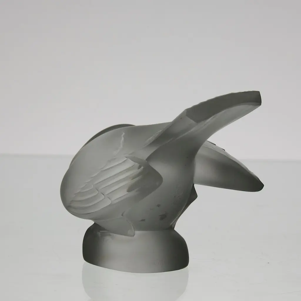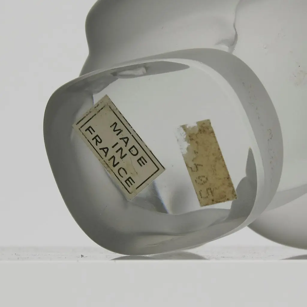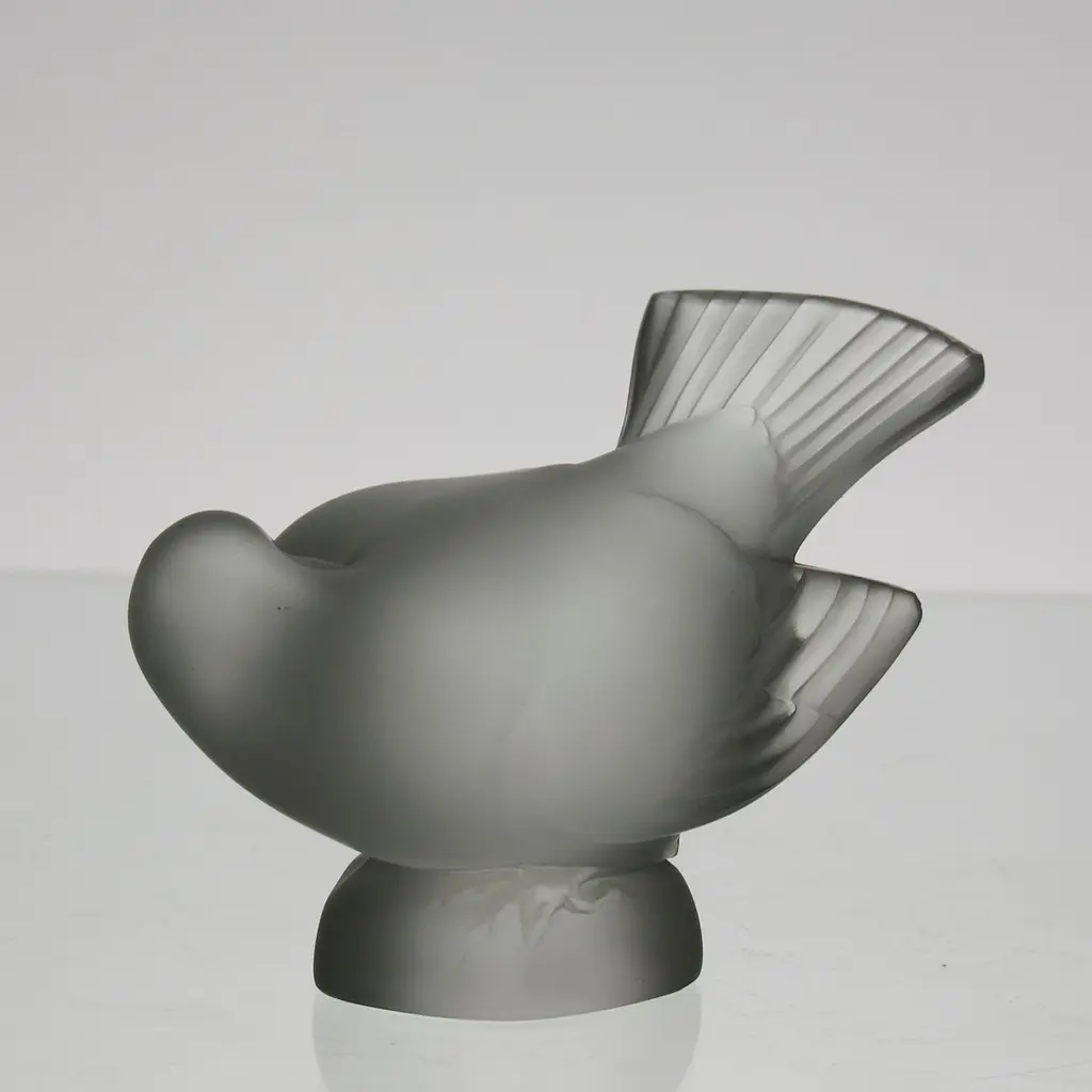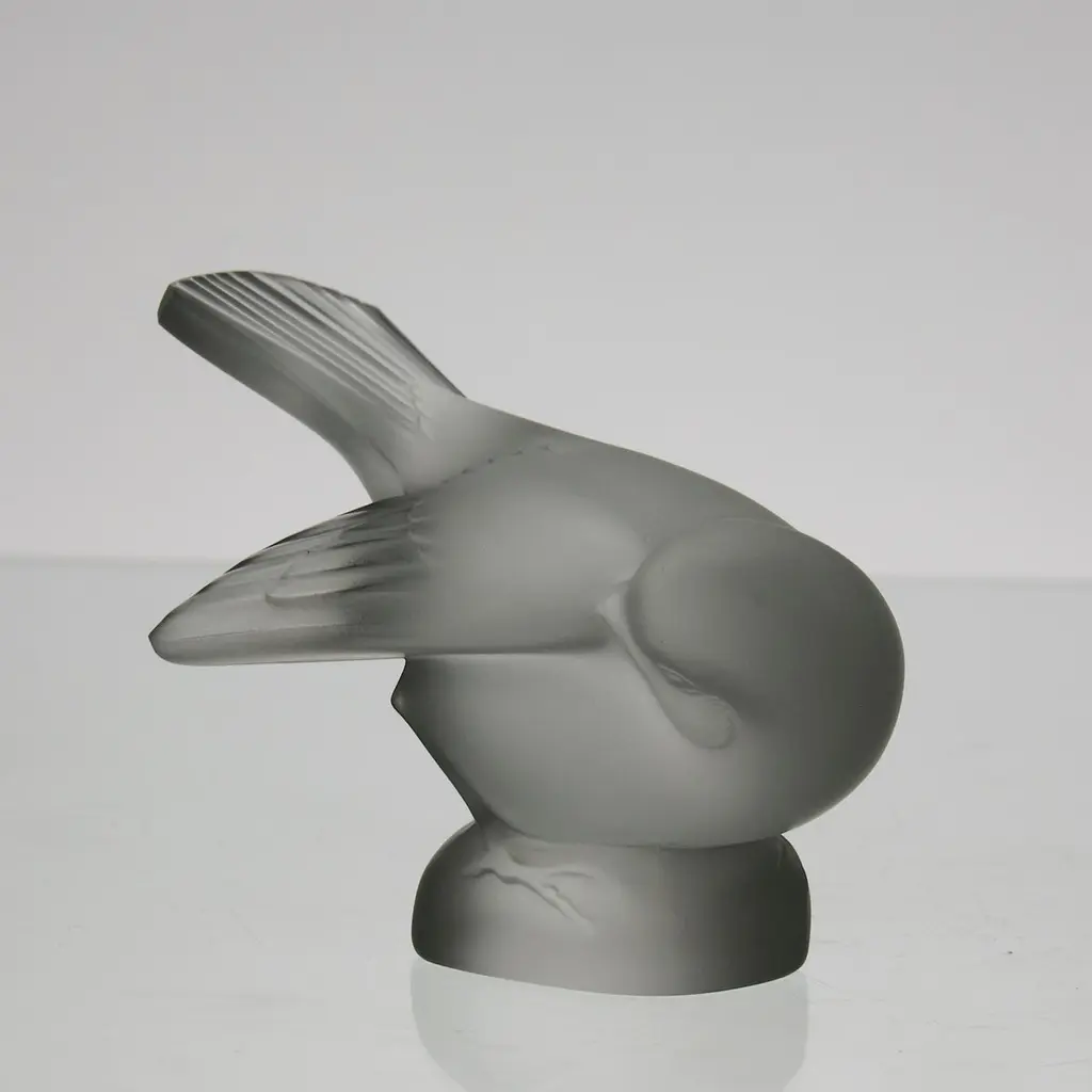 An excellent frosted glass figure of a crouched sparrow with its head turned cleaning beneath its wings exhibiting good hand finished detail, signed Lalique France to baseADDITIONAL INFORMATIONHeight: 8 cm Width: 11 cm Depth: 7 cmCondition: Excellent Original ConditionCirca: 1970Materials: Frosted GlassSKU: 6695ABOUTLalique GlassRené Lalique (French,1860-1945)began his career as a jewellery apprentice at the age of 16, and by 1881 he was a freelance designer for many of the best-known Parisian jewellers. In 1885, he opened his own workshop on Place Gaillon in Paris, the former workshop of Jules Destape. In 1887, Lalique opened a business on Rue du Quatre-Septembre, and registered the "RL" mark the following year. In 1890, he opened a shop in the Opera District of Paris. Within a decade, Lalique was amongst the best-known Parisian jewellers.In 1905, Lalique opened a new shop at Place Vendôme which exhibited not only jewellery, but glass works as well. It was close to the shop of renowned perfumer François Coty; in 1907, Lalique began producing ornate perfume bottles for Coty. The production of glass objects began at his country villa in 1902, and continued there until at least 1912. The first Lalique glassworks opened in 1909 in a rented facility in Combs-la-Ville, which Lalique later purchased in 1913. In December 1912, Lalique hosted an exhibition of Lalique Glass—as his glass would come to be known—at the Place Vendôme shop. During the First World War, the glassworks produced mundane items in support of the war effort. In 1919, work began on a new production facility in Wingen-sur-Moder, which opened in 1921. From 1925-1931, Lalique produced 29 models of hood ornaments; a mermaid statuette first produced in 1920 was also later sold as a hood ornament. During the 1920s and 1930s, Lalique was amongst the world's most renowned glassmakers.René Lalique died in 1945. His son Marc Lalique took over the business, operating initially as "M.Lalique" and later as "Cristal Lalique". Under Marc's leadership, the company transitioned from producing its famous Lalique Glass to producing lead glass, commonly known as crystal. Marie-Claude Lalique took control of the company following Marc's death in 1977. It was sold to Pochet in 1994 and to a partnership of Art & Fragrance and the holding company Financière Saint-Germain in 2008. Since 2010, Cristal Lalique has been wholly owned by Art & Fragrance.