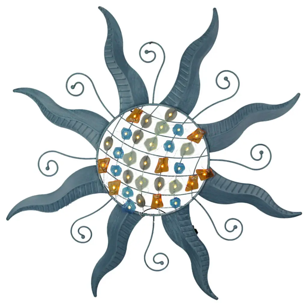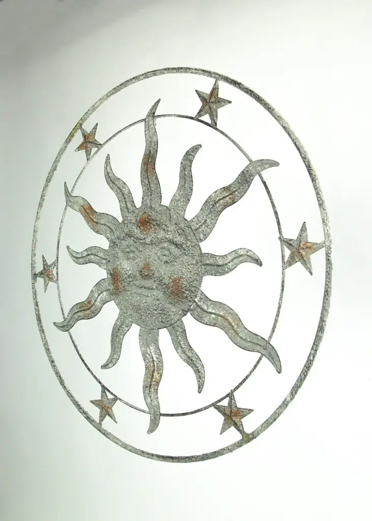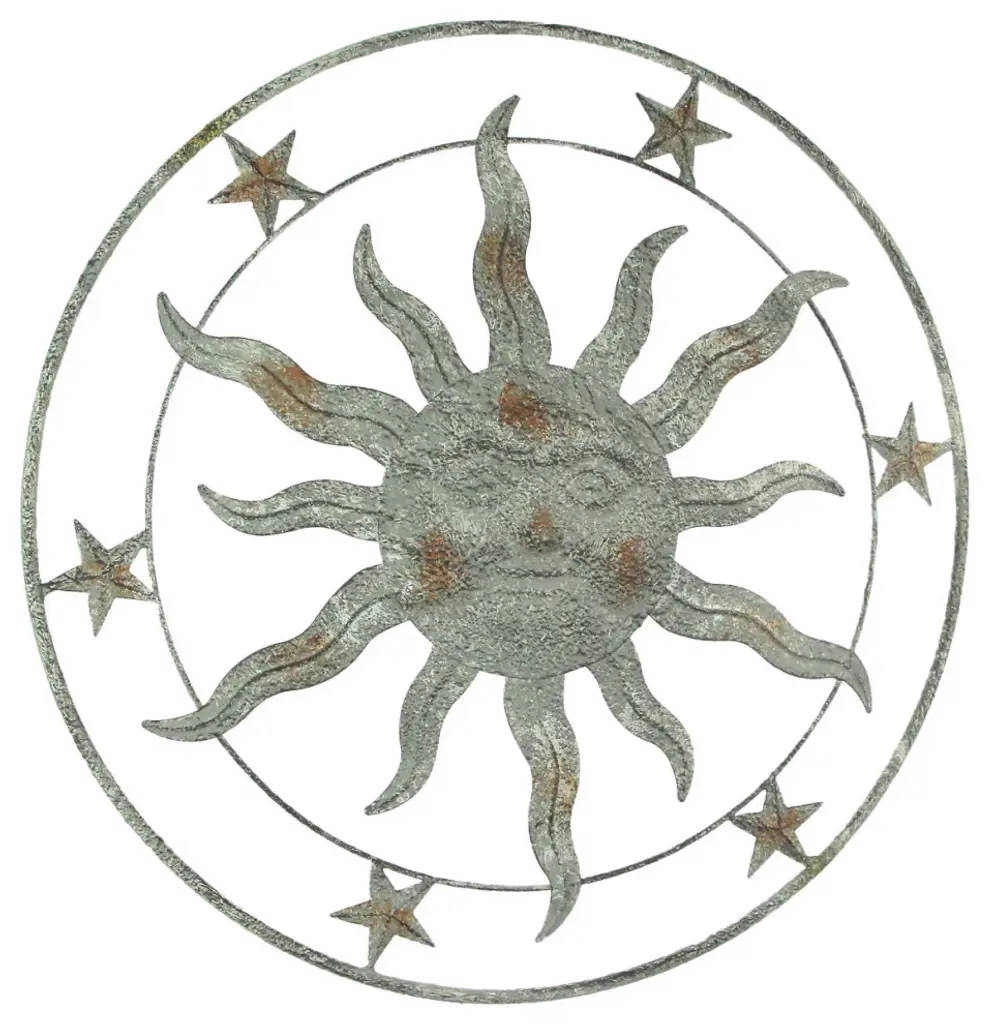 OVERALL SIZE - 21.5 Inches in Diameter, 0.75 Inches ThickDURABLE MATERIAL - Crafted of Metal For Years of Maintenance Free DisplayBEAUTIFUL FINISH - Weathered Gray and Rust Brown Enamel ExteriorEASY INSTALL - Keyhole Hanger on Back to Mount Easily to Your WallGREAT GIFT - For Yourself or For Friends and FamilyWhether displayed indoors or hung on an exterior wall, this celestial sun face metal art sculpture brings artful inspiration anywhere. Swirling rays give the sun a sense of warmth while the stars bring an air of excitement. Weathered gray and rust-brown enamels help bring out the personality in this smiling sun. Display it on a focal wall anywhere indoors or display it outside near your front entry. Hang it by your pool, on your patio, or on a fence to bring a little life to your yard or garden. This 21.5-inch diameter wall sculpture brings celestial character to your indoor or outdoor decor.