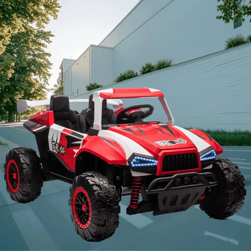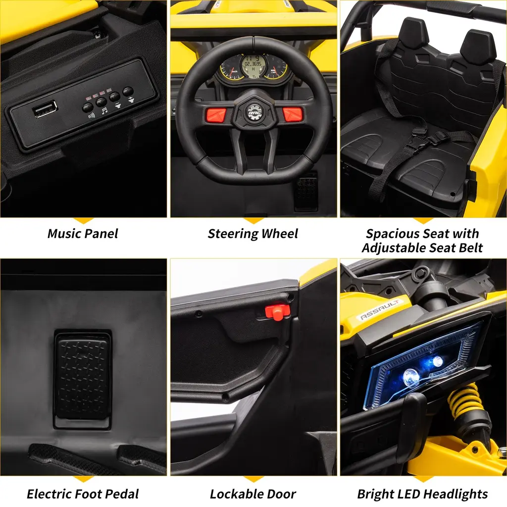 Stylish Design: This ride-on UTV car boasts a sleek and realistic look, featuring eye-catching LED lights, wear-resistant EVA wheels, an MP3 player, and a flash drive port. The fully opening and closing doors enhance the authenticity of the driving experience, making it a fun addition to any child's playtime. Powerful Performance: Powered by a 24V 7AH rechargeable battery, this electric UTV car is designed for comfortable driving on various terrains, including grass, gravel, and slight inclines. Its robust performance ensures a fun and safe driving experience for young adventurers. Dual Driving Modes: The ride-on UTV offers two modes of operation, allowing children to drive independently using the foot pedal for acceleration and the steering wheel for maneuvering. For added safety, parents can take control using the 2.4G remote control, which includes forward, reverse, and park functions, along with steering operations. Safe & Durable Construction: Crafted from high-quality, durable materials, this ride-on car meets all child safety standards and has passed CPSIA, CPC, and ASTM-F963 certifications. It has undergone rigorous testing for stability and safety, providing peace of mind for parents. Perfect Gift for Children: Measuring 40.9" x 28.7" x 24" and supporting a maximum load of 66 lbs, this ride-on UTV car features a spacious seat for added comfort, making it suitable for children aged 3 and up. It's an excellent gift that promotes independence and coordination through interactive play.