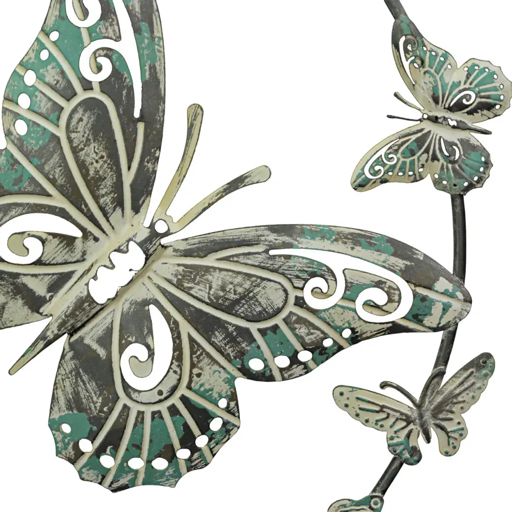 Overall Size - 26 Inches in Diameter, 0.25 Inches in DepthDurable Material - Made Of High Quality Metal For Years Of Maintenance Free DisplayDistressed Finish - Rustic Aged Metal With Painted AccentsEasy Install - Built-in Hanger For Quick And Simple Display On Walls Or Garden FencesIndoor/Outdoor Decor - A Wonderful Accent For Your Living Room, Kitchen, Bedroom, Bathroom, Home Office, Study, Patio, or Garden FenceBring a touch of rustic charm to any room with this Metal Butterfly Wall Decor. This decorative wall hanging is made from high quality metal with a distressed finish, giving it a rustic aged look with painted accents. Measuring 26 inches in diameter and 0.25 inches in depth, this sculpture is the perfect centerpiece for any living room, kitchen, bedroom, bathroom, home office, study, patio, or garden fence. Installation is a breeze with the built-in hanger, allowing you to quickly and easily display this decorative art piece. Add a beautiful and unique accent to your home with this decorative sculpture.
