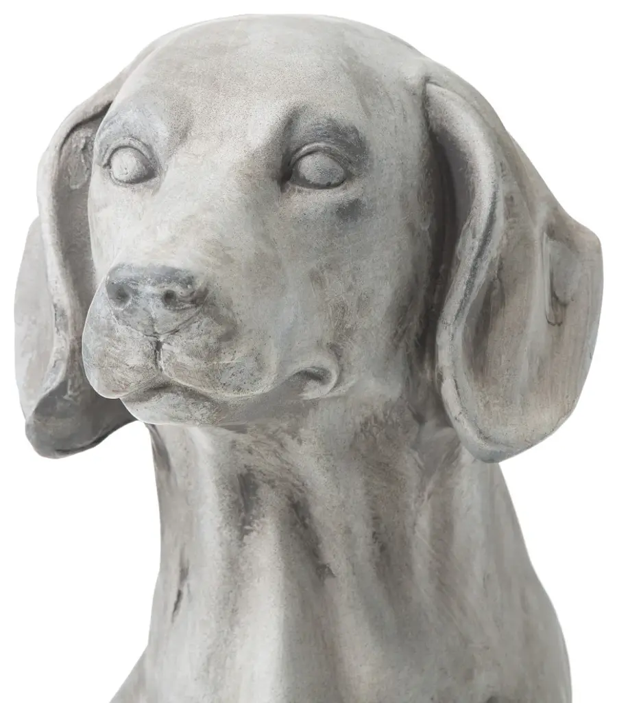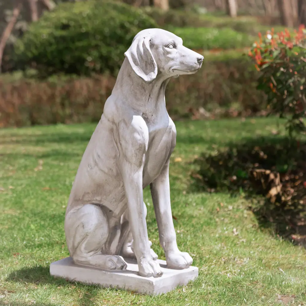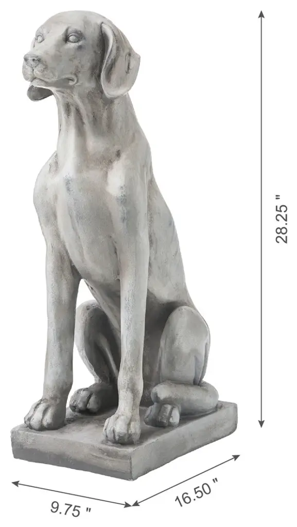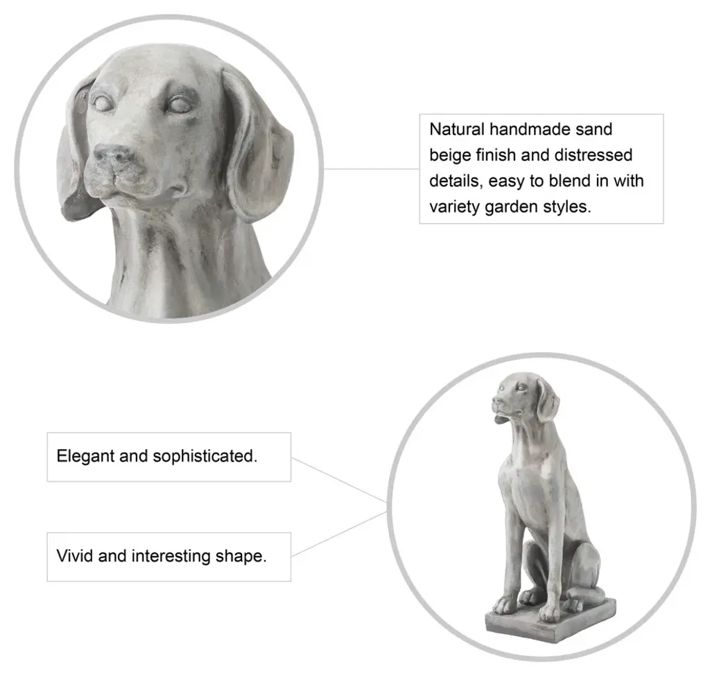 Enhancing your garden or porch with this elegant dog statue, brings a touch of artistic to your space. The handmade sand beige finish with distressed details gives a sense of vintage and advanced texture. This dog statue is a great decorative figurine that is sure to highlight your garden appearance, also a great gift.- Elegant and sophisticated.- Desinged as a sitting Labrador Retriever, looks vivid and interesting. - Natural handmade sand beige finish with distressed details, easy to blend in with variety garden styles.- Weather-resistant, perfect for indoor and outdoor use, such as porch, garden or backyard.- Constructed of 95% MGO and 5% fiberglass, high quality, very durable.- Compared to the traditional stone or concrete statue, it is light weight, easy to move to anywhere you like.