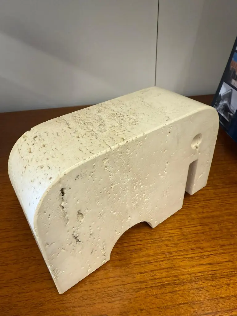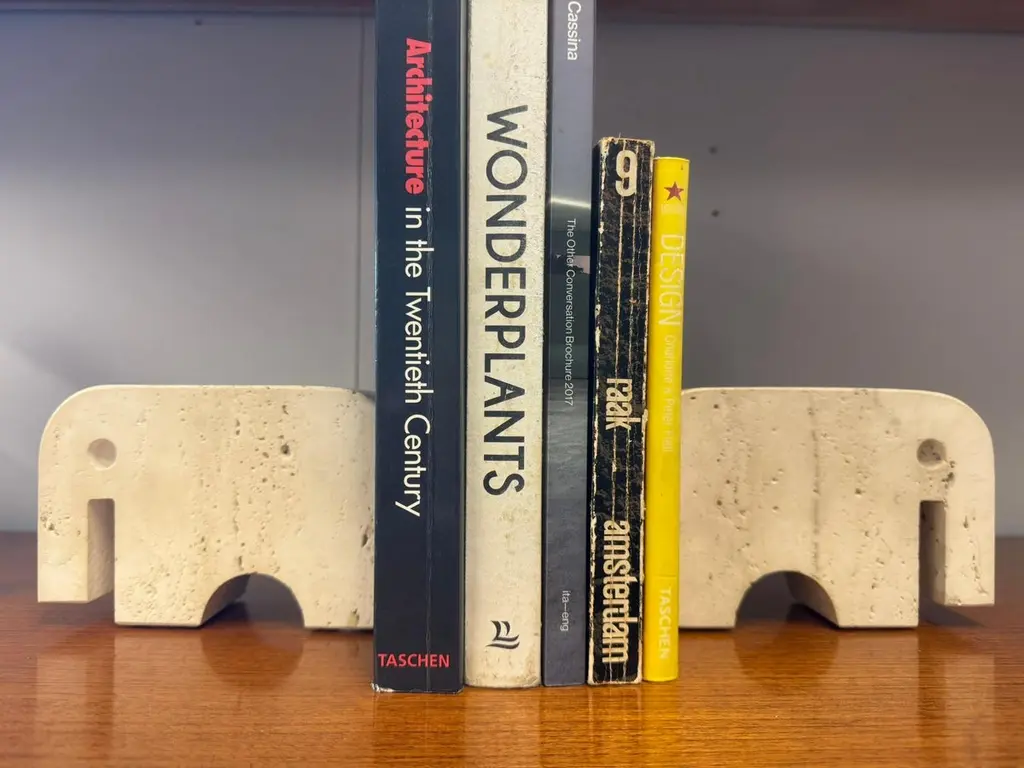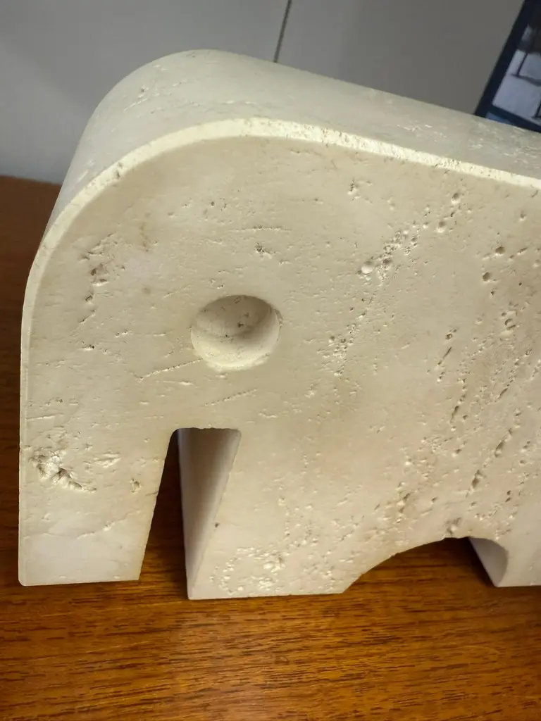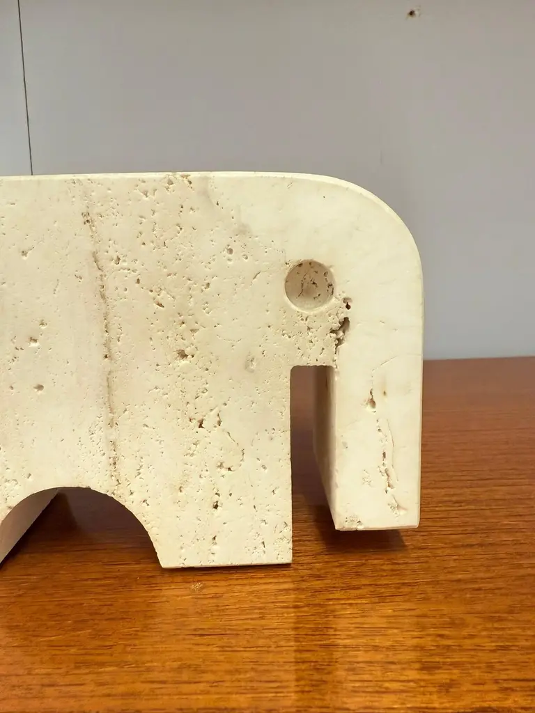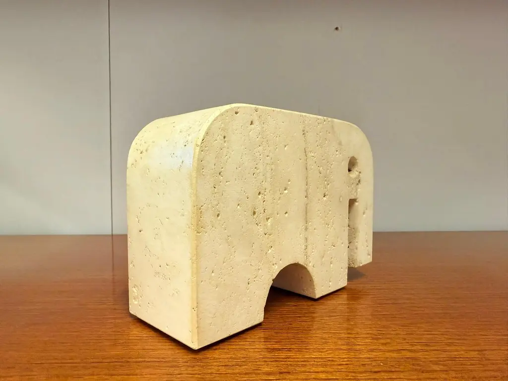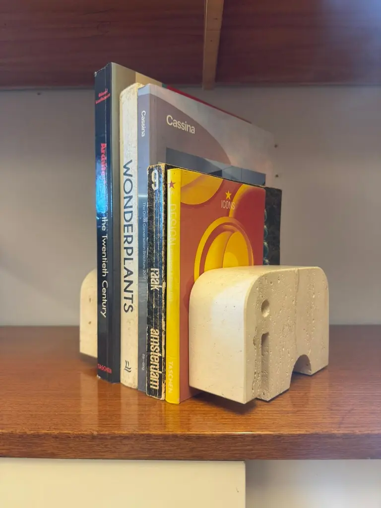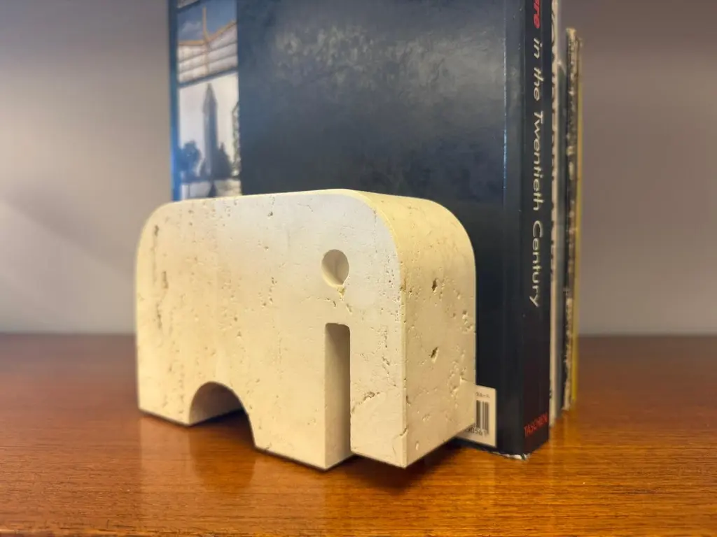 Beautiful pair of sculptural bookends in travertine marble, crafted in the shape of two stylized elephants. Designed by Enzo Mari and produced by Fratelli Mannelli in the 1970s in Italy.The natural travertine gives each piece a unique texture and warm tone, making them not only functional but also highly decorative. The minimalist yet playful elephant form is typical of Italian design of the era – simple geometric shapes.Fratelli Mannelli is renowned for their work in travertine during the mid-20th century, creating a wide range of objects from vases and bowls to desk accessories and sculptures. Their pieces are increasingly sought after by collectors of Italian mid-century design.A wonderful set that combines charm, function and collectible value – perfect for any design lover’s library or interior.Please contact us for the best shipping options and rates tailored to your location.
