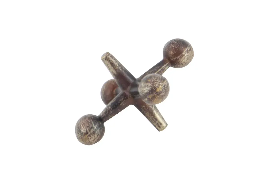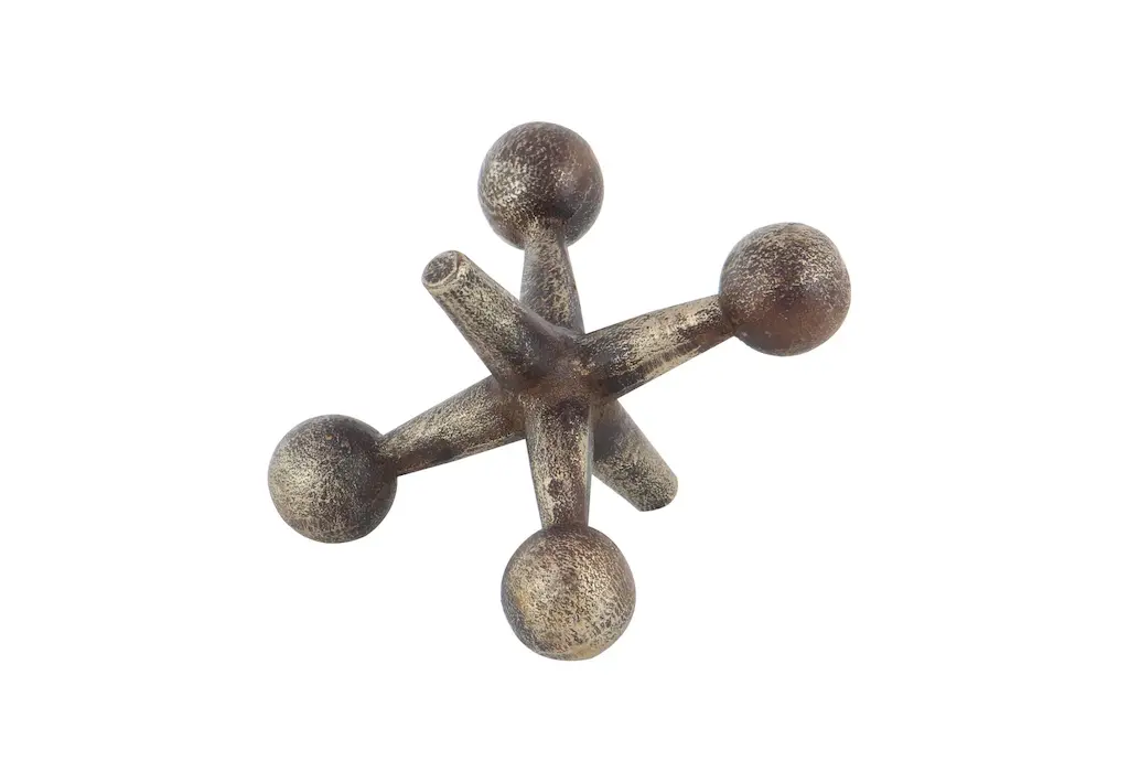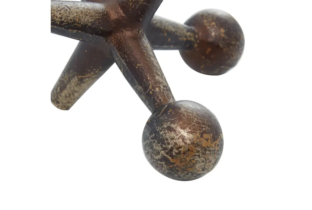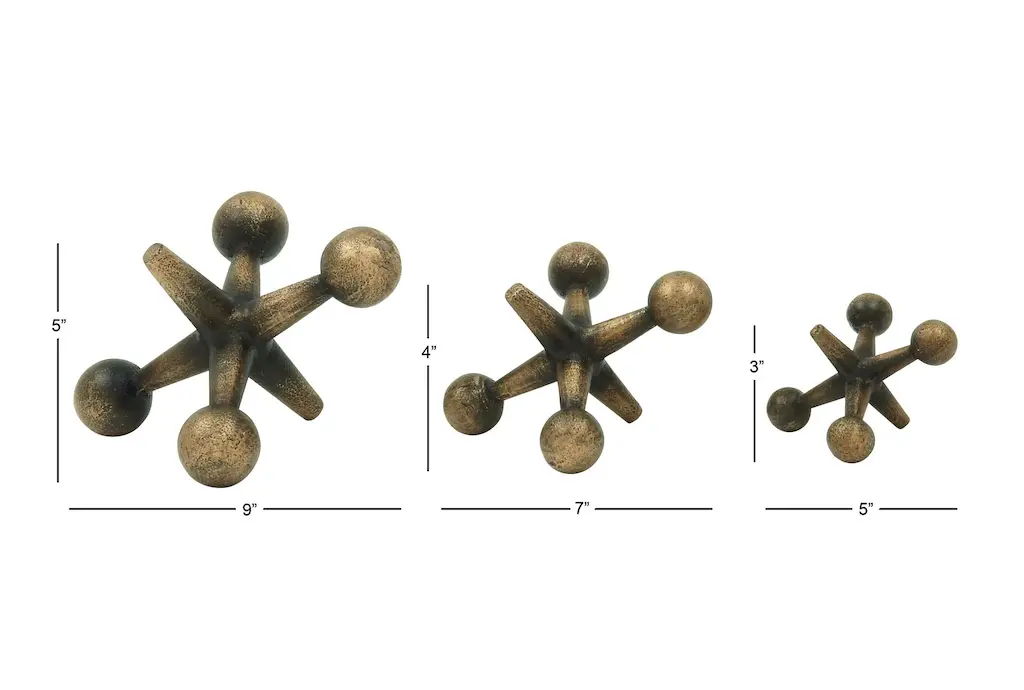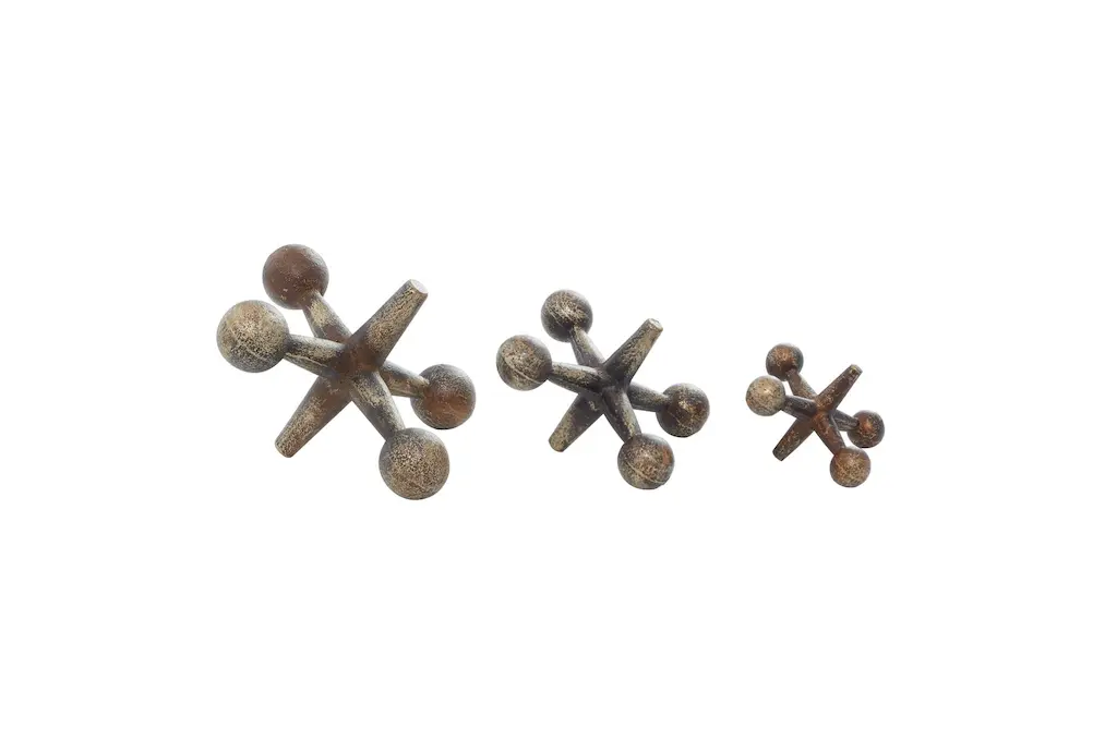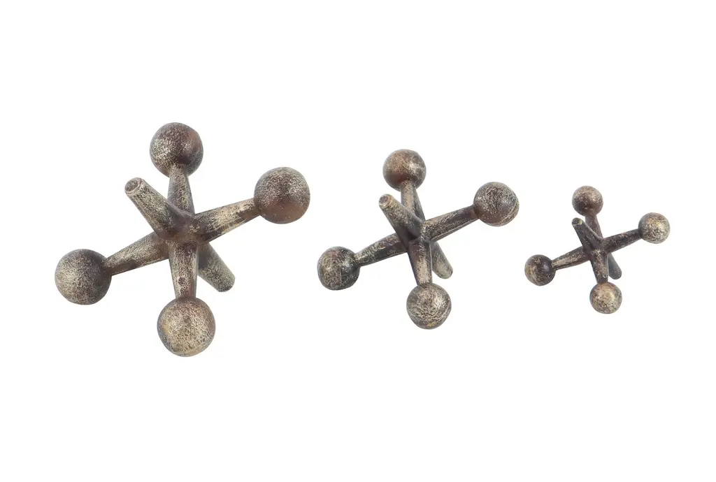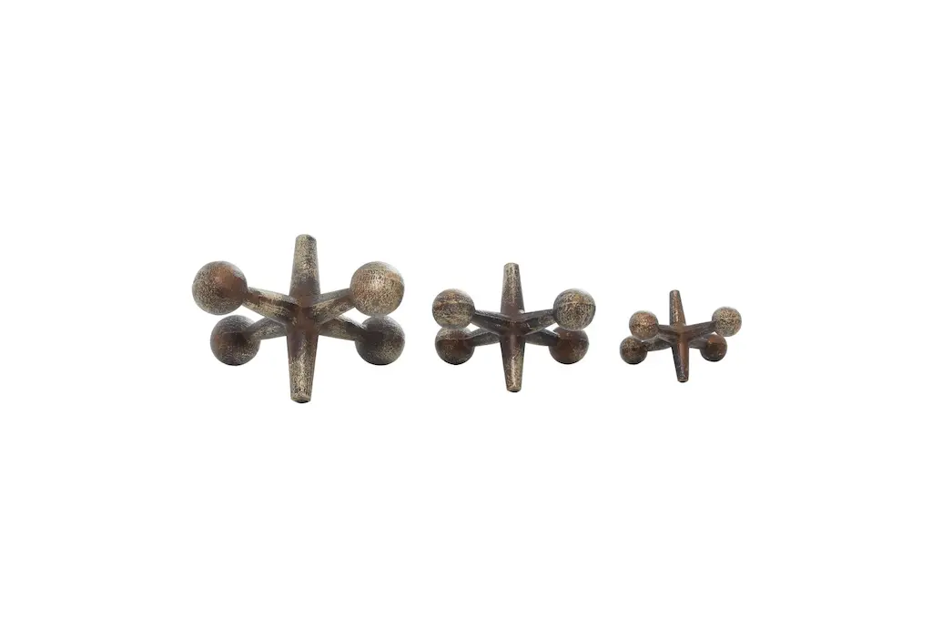 Enhance your modern decor with this 3-piece set of gold and bronze metal multi-media jack sculptures. These abstract-shaped curios are perfect for adding a touch of industrial charm to any space.
