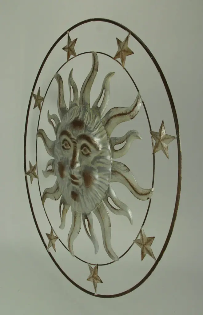 OVERALL SIZE - 32 Inches in Diameter, 0.75 Inches WideDURABE DESIGN - Crafted From Metal For a Lightweight Yet Sturdy SculptureRUSTIC APPEAL - Off-White Distressed Finish Gives it a Wonderfully Weathered AppearanceEASY INSTALL - Built-in Hanger For Quick And Simple Mounting to Any Indoor or Outdoor Wall, Garden Fence or Patio RailCELESTIAL STYLE - Brings Visual Excitement and Artful Inspiration to Any Home Decor SettingBring a harmonious balance to your indoor or outdoor space with this celestial-inspired wall hanging featuring a smiling sun in a circle of stars. The metal art sculpture brings your space a delightful touch of celestial charm in a distressed white finish that gives it a wonderfully weathered look. Swirling rays give the sun a sense of motion while the stars bring a soothing sense of calm. A simple round frame completes the look. Display it on a focal wall anywhere indoors or let it greet your guests outside near the front entry. Hang it by the pool, on the patio, or on a fence to bring a little life to your yard or garden. This 32-inch diameter, .75-inch wide wall sculpture brings personality, character, and artful inspiration to your indoor or outdoor decor.