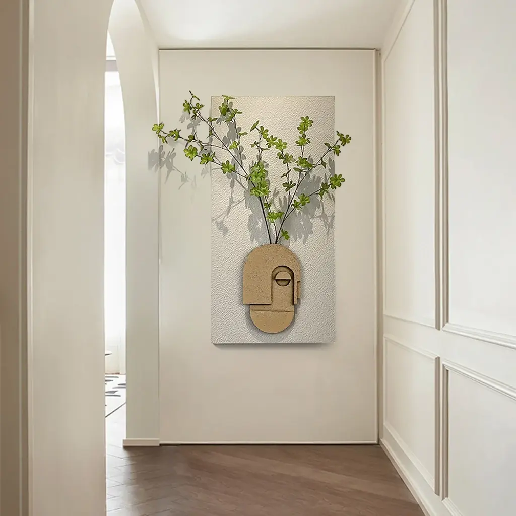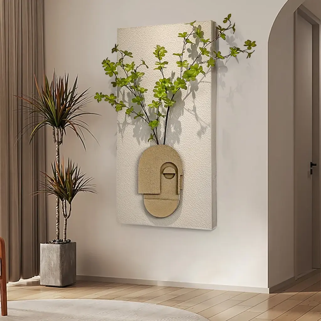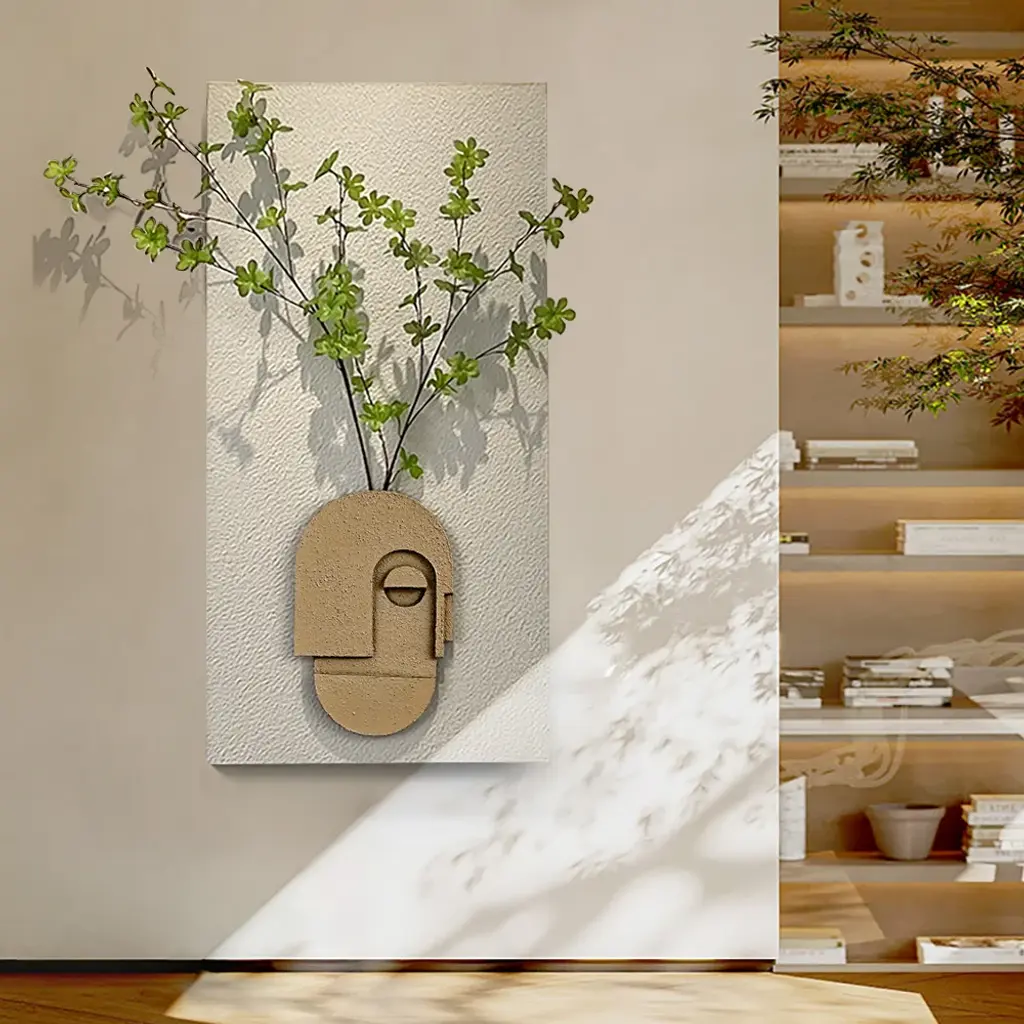 This is a wall-mounted artificial plant in 3D, combining natural sandstone material with abstract hand-carved modern character and natural green plants. Modernity and nature can be integrated by the borderless design of hanging paintings in various styles of scenarios.