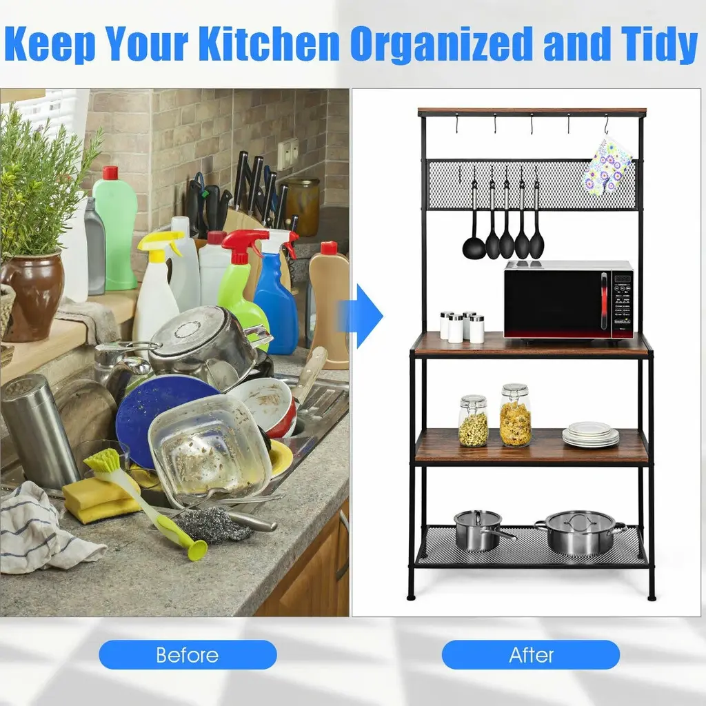 4-Tier Bakers Rack Kitchen Rack Stand With Hooks And Mesh Panel - Brown