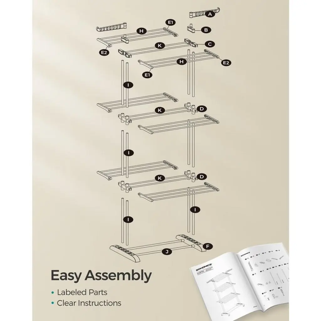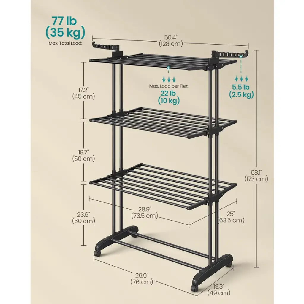 Discover the perfect drying solution with our amazing rack! It offers Generous Storage, being a 4-tier, 25"D x 50.4"W x 68.1"H rack that's ideal for drying a wide range of items from socks to blankets. Its Robust Build, crafted from stainless steel and thick plastic, can support up to 77 lb and is built to last for years. With Easy Mobility provided by 4 casters, 2 of which have brakes, you can move it smoothly and position it securely wherever you need. Assembly is a breeze with Quick Assembly ¨C just follow the clear instructions and use the labeled parts, and it'll be ready in just 10 minutes. Plus, it has a Versatile Application as it's suitable for both indoor and outdoor use, and it's foldable for convenient storage when not in use. Don't wait any longer, order yours now and make drying your clothes and other items a whole lot easier! Overall Unfolded Size: 25"D x 50.4"W x 68.1"H (63.5 x 128 x 173 cm) Overall Folded Size: 19.3"D x 29.9"W x 68.1"H (49 x 76 x 173 cm) Base: 19.3"D x 29.9"W (49 x 76 cm) Size per Tier When Wings Unfolded: 25"D x 28.9"W (63.5 x 73.5 cm) Size per Tier When Wings Folded: 8.5"D x 28.9"W (21.5 x 73.5 cm) Product Weight: 9.7 lb (4.4 kg) Max. Total Static Load Capacity: 77 lb (35 kg)