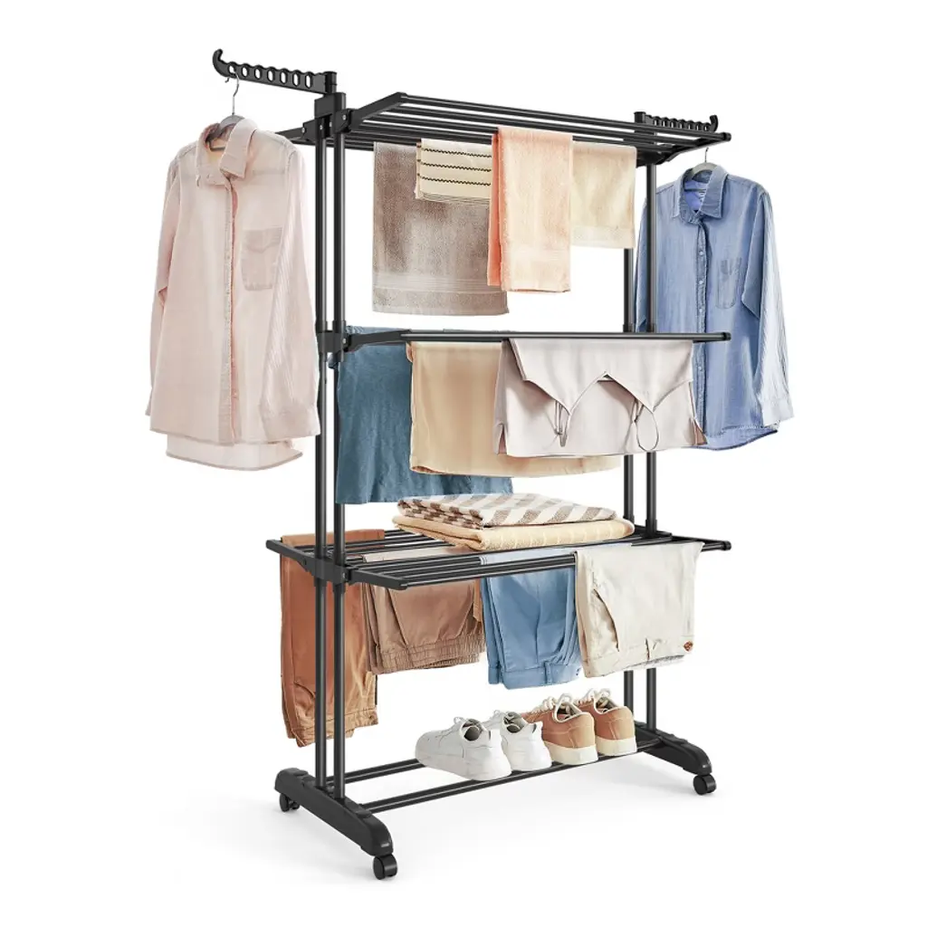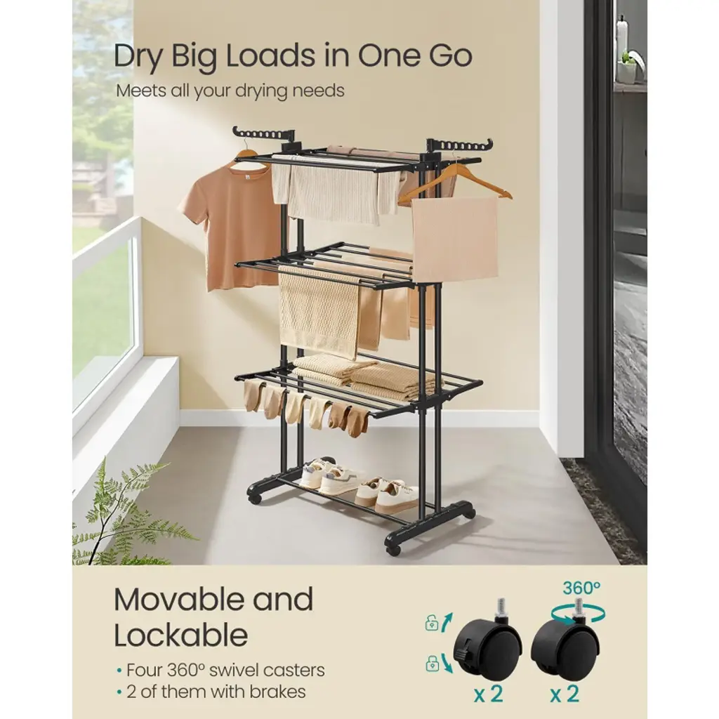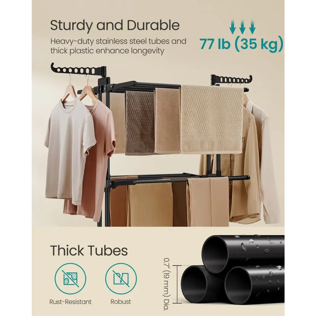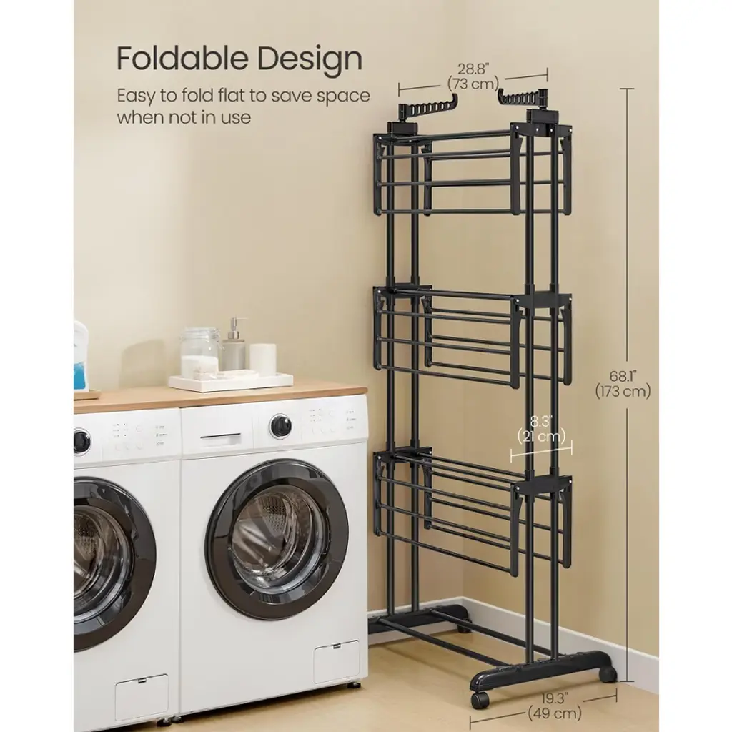4 - Tier Foldable Clothes Drying Rack - 68.1" Tall, Stainless Steel, Rolling. Easy Assembly For Indoor & Outdoor Use. Ink Black Color