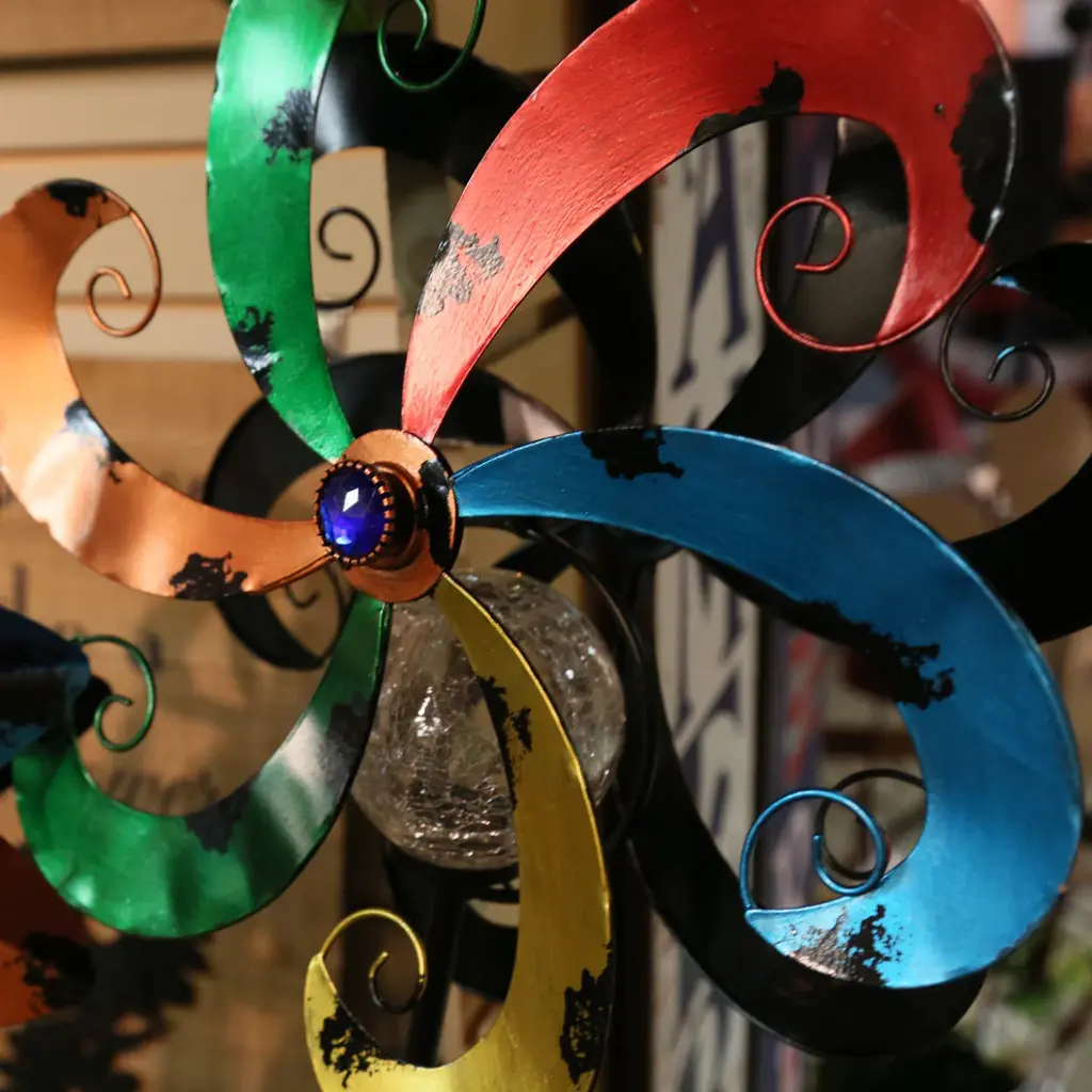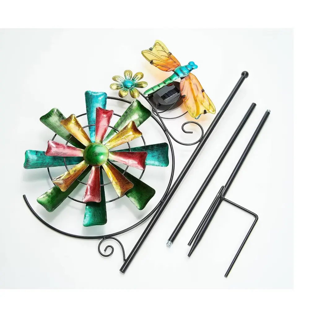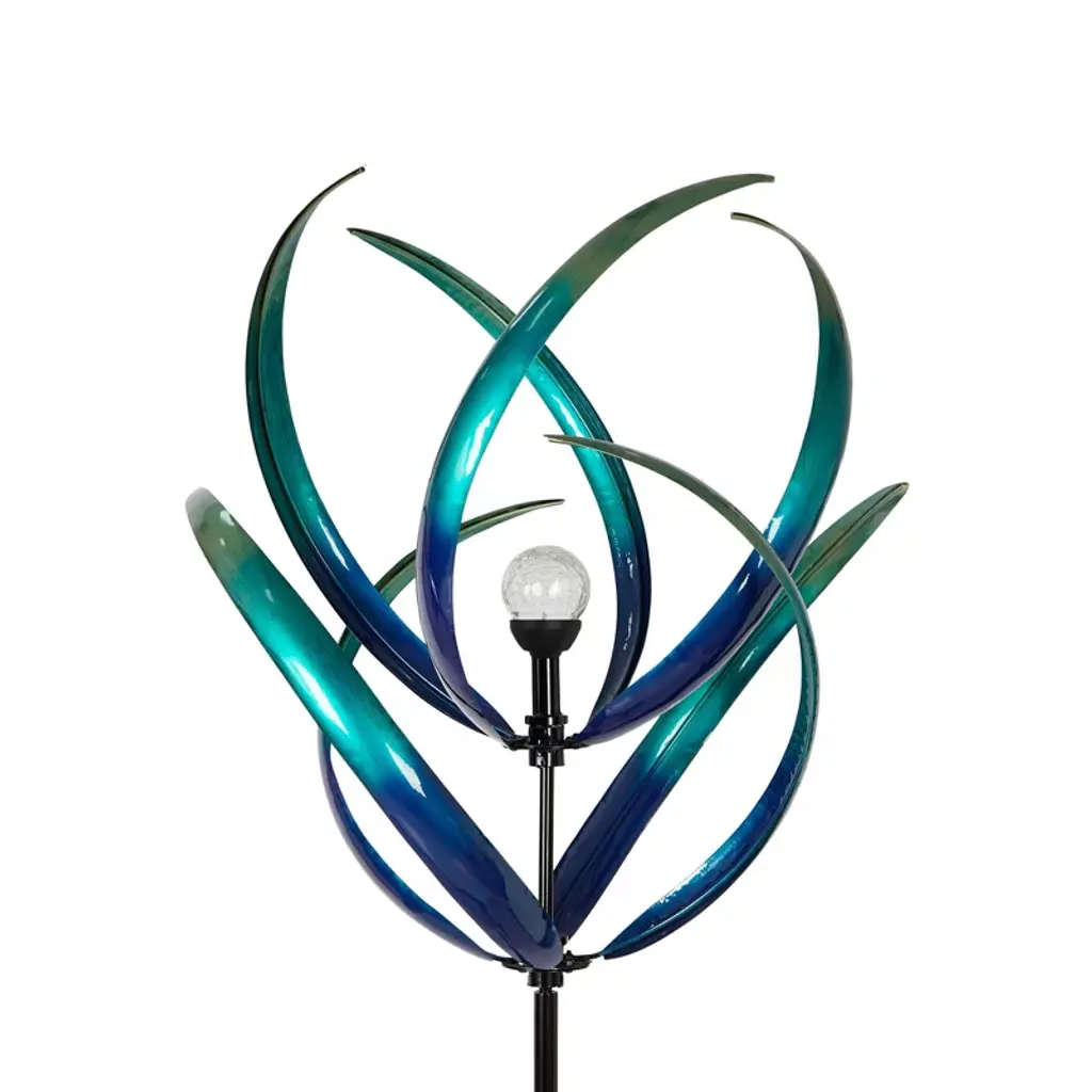 Light up your yard with this charming and cheerful set of three, solar-powered metal yard stake wind spinners. Each delightful wind spinner has a black metal painted stake, and a beautiful geometric wind spinner affixed to the top. Each wind spinner includes one C5 energy efficient, warm white LED light in clear crackle glass in-between the blades so they really shine at night. The LED lights are solar powered, operated by one rechargeable AA battery (included), making each wind spinner yard stake an artful sculpture by day and a luminescent accent by night. Your yard stakes come in three assorted bright colors and styles of wind spinners: Two with multi-colored blades, one with sharp points and one with rounded points, and the third has curved antique bronze blades. Place the set together to make a happy garden scene, or separate them to add a little accent piece to several areas of your garden or yard.