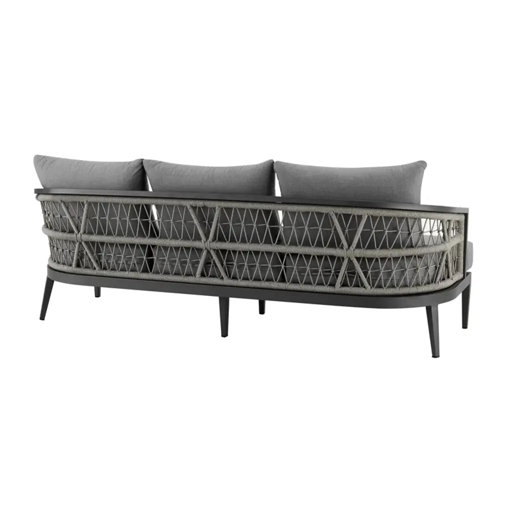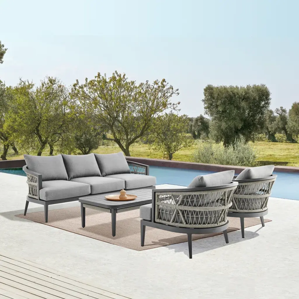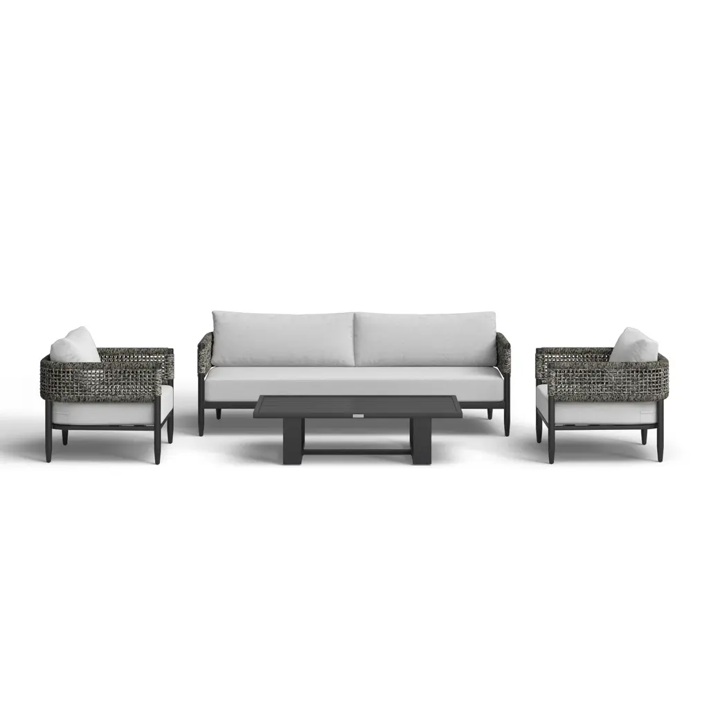 Introducing the Evalyn outdoor patio 4-piece conversation set in aluminum with light gray rope and cushions — a symphony of modern design and outdoor luxury meticulously crafted to redefine your lounging experience. The collection seamlessly blends sleek aluminum with inviting light gray rope detailing and plush earl gray cushions, creating a sophisticated and enduring ensemble. The Evalyn outdoor patio armchair, a masterpiece in itself, features a robust aluminum frame, ensuring durability and a contemporary aesthetic. Water-resistant and UV-resistant, it stands as a steadfast and stylish seating solution for your patio. The incorporation of light gray rope detailing adds a unique visual dimension, creating a captivating contrast with the sleek aluminum frame. Paired with earl gray cushions, it invites you to relax in both style and comfort, transforming your outdoor space into a sanctuary. Joining the ensemble is the Evalyn outdoor patio sofa, a fusion of contemporary design and outdoor luxury. With a sturdy aluminum frame, water-resistant and UV-resistant features, and the added charm of light gray rope detailing, this sofa remains a reliable centerpiece for your outdoor gatherings. Paired with earl gray cushions, it offers an inviting and luxurious seating option, perfect for hosting outdoor gatherings or seeking a tranquil retreat. Completing the set is the Evalyn rectangular coffee table, a contemporary masterpiece that marries sleek aluminum with a refined charcoal finish and light gray rope detailing. Designed for outdoor durability, it stands as a steadfast and stylish addition to your patio, offering a functional and inviting surface for your outdoor living needs. Invest in the Evalyn outdoor patio furniture collection, where contemporary elegance meets the demands of modern outdoor living.