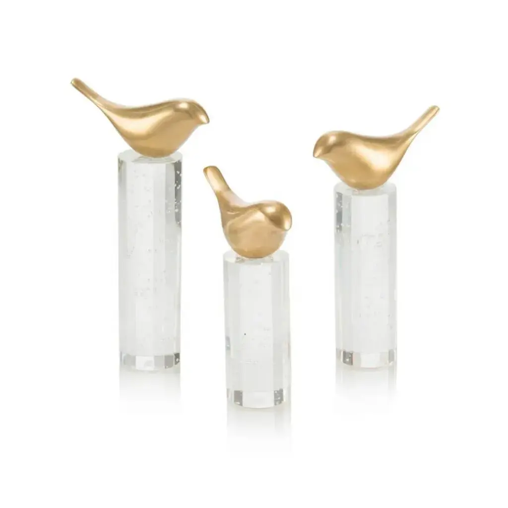 Enhance your living space with this stunning set of gold metal bird sculptures. Each piece features intricate gold foil texturing, adding a touch of sophistication to any room. These charming sculptures are perfect for adding a unique and artistic element to your home decor.