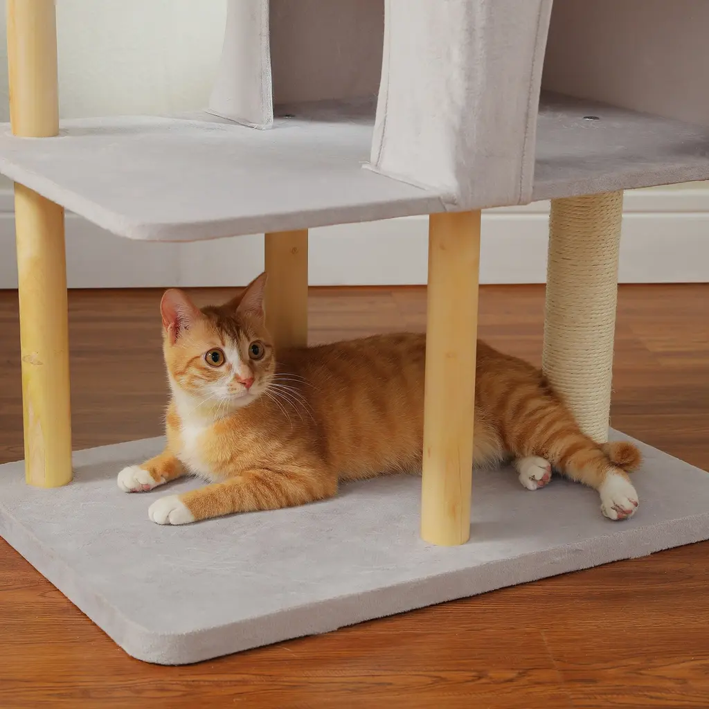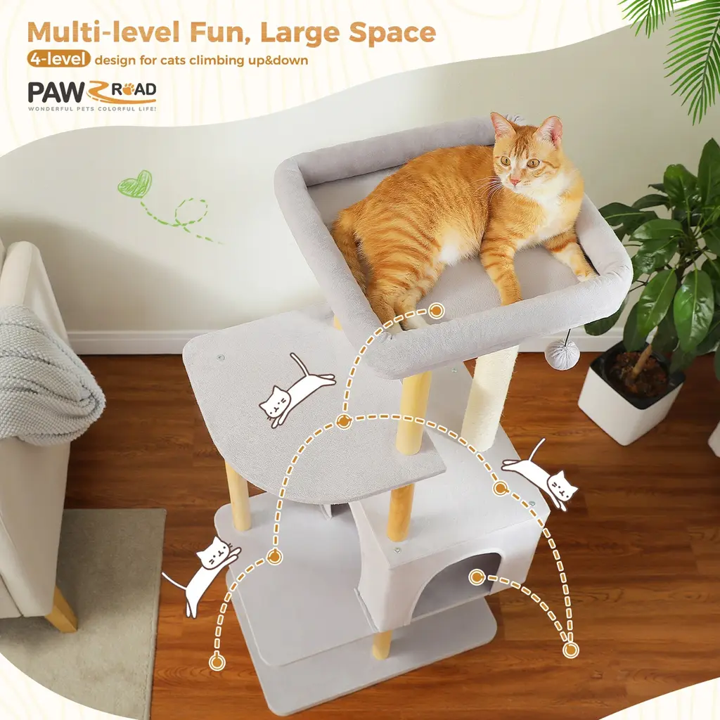 Spacious and Sleek: Looking for a spacious and modern cat furniture piece? This contemporary cat tower, crafted from pure solid wood and standing at 23.6X15.7X53.1 inches, is the perfect solution for those seeking a larger option. It features a 4-tier structure, with each platform elevated at a height of 17 inches, providing plenty of space for larger cats to jump, play, and chase.Ideal for Large Cats: This cat tree is specifically designed for larger cats. It boasts a generously sized top padded perch measuring 20x10 inches and an exceptionally large condo measuring 20x15 inches. These features provide ample space for all your feline friends to play, rest, and live together in harmony within their shared space.And the padded removable cover is easy to care.Robust and Sturdy Construction: The wood cat tree is constructed with Double layer Base that enhancing its entire stability and durability by 60% than similar size cat trees. The natural wood post not only gives stronger support that cardboard post but also gives this cat tower a stylish and elegant look will complement your home decor.Fully Equipped Scratching Posts: The cat tree is fully equipped with several scratching posts that are perfect for your cats to scratch, climb, play, and become active. These posts not only satisfy your cats' instinctual need to scratch but also help keep their claws sharp and healthy while saving your furniture from their claws.Easy to Assemble: Our wooden Cat Tree comes with detailed graphical instructions. You can easily install it in a few minutes! If you have any questions about our cat tower, please feel free to contact us and we will provide you with the best service to solve your problem.