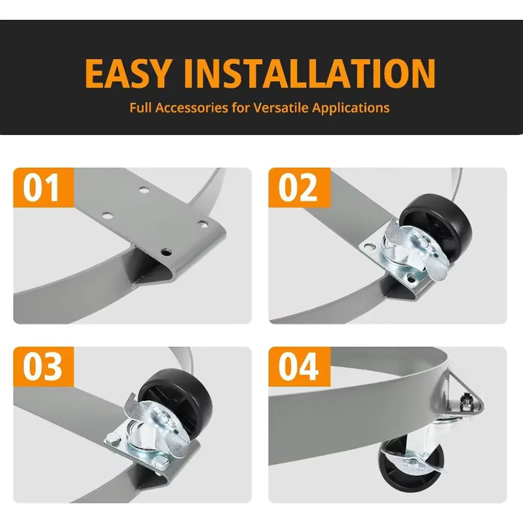 The Drum Cart is expertly engineered for moving heavy 55-gallon drums with ease and safety. Featuring a heavy-duty steel frame crafted from a 3mm thick plate, this cart supports up to 1250 pounds, ideal for industrial, commercial, or garage applications. Its large 67cm outer ring diameter accommodates standard drum sizes precisely, providing a secure and snug fit to minimize shifting during transport. Designed for superior mobility, this drum dolly is fitted with five universal 3-inch caster wheels, including two with integrated brakes for reliable stopping power. The brakes enhance safety by preventing unwanted rolling when the cart is stationary, giving you greater control on sloped or uneven surfaces. The swivel wheels ensure smooth and effortless maneuvering across various flooring types. Reinforced with cross braces and strong welds around each wheel, the cart maintains structural integrity even under heavy loads, preventing warping or tipping. Its elevated height of 16.5cm allows easy access for loading and unloading drums or trash containers, reducing strain and improving efficiency. Whether you need to move water barrels for landscaping, transport large waste cans, or handle industrial drums, this drum cart delivers durability, stability, and convenience. Its combination of robust steel construction, secure braking system, and ergonomic design makes it a reliable tool for warehouse workers, facility managers, and professionals requiring dependable drum handling solutions. Choose the Drum Cart for smooth mobility, enhanced safety, and strong performance in all your heavy-duty drum transport tasks.