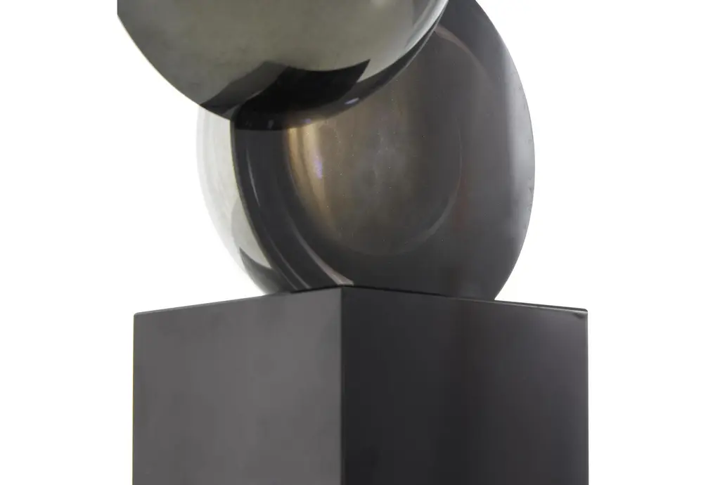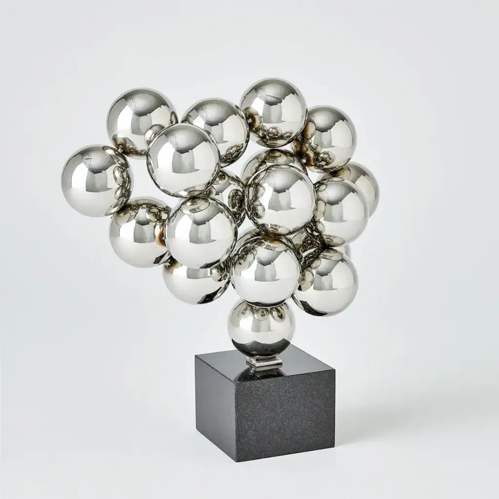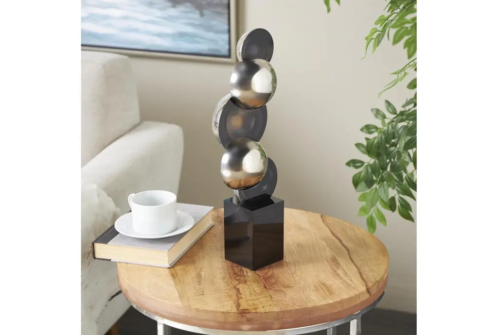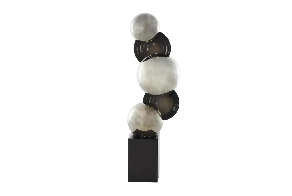 This 6" X 4" X 18" silver glass abstract stacked orb sculpture with a black base is a striking addition to any contemporary or modern decor. The unique design features a series of orbs stacked in an abstract formation, creating a visually captivating piece. The silver glass material adds a touch of sophistication and shine to your space.