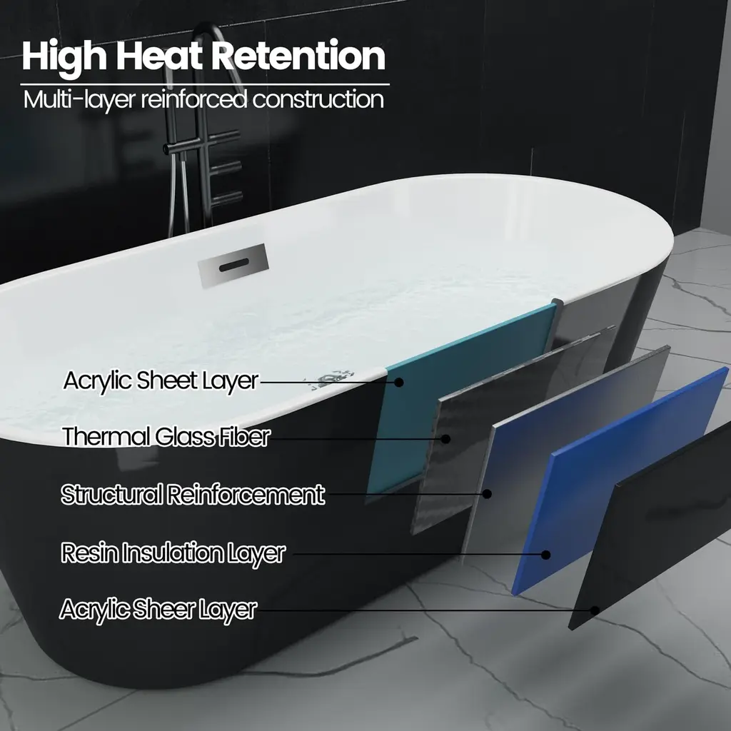 Premium Material & Timeless Design:Crafted from reinforced acrylic with a scratch-resistant, glossy white finish, this freestanding bathtub combines classic oval elegance with robust load-bearing durability for long-lasting performance.Efficient Heat Retention:Advanced insulation technology locks in warmth, maintaining water temperature for 30+ minutes of uninterrupted, luxurious soaking without reheating.Leak-Proof Safety System:Features a fully integrated overflow and chrome drain, CUPC-certified to prevent leaks and ensure compliance with international safety standards.Ergonomic Deep-Soak Comfort:Designed with a 15° sloped lumbar support and extra-deep 17-18 inch basin for full-body immersion, delivering therapeutic relaxation and comfort.Hassle-Free Installation:Includes pre-assembled non-slip base, detailed tool kit, and modular installation guide, plus triple-layer shockproof packaging for damage-free delivery.