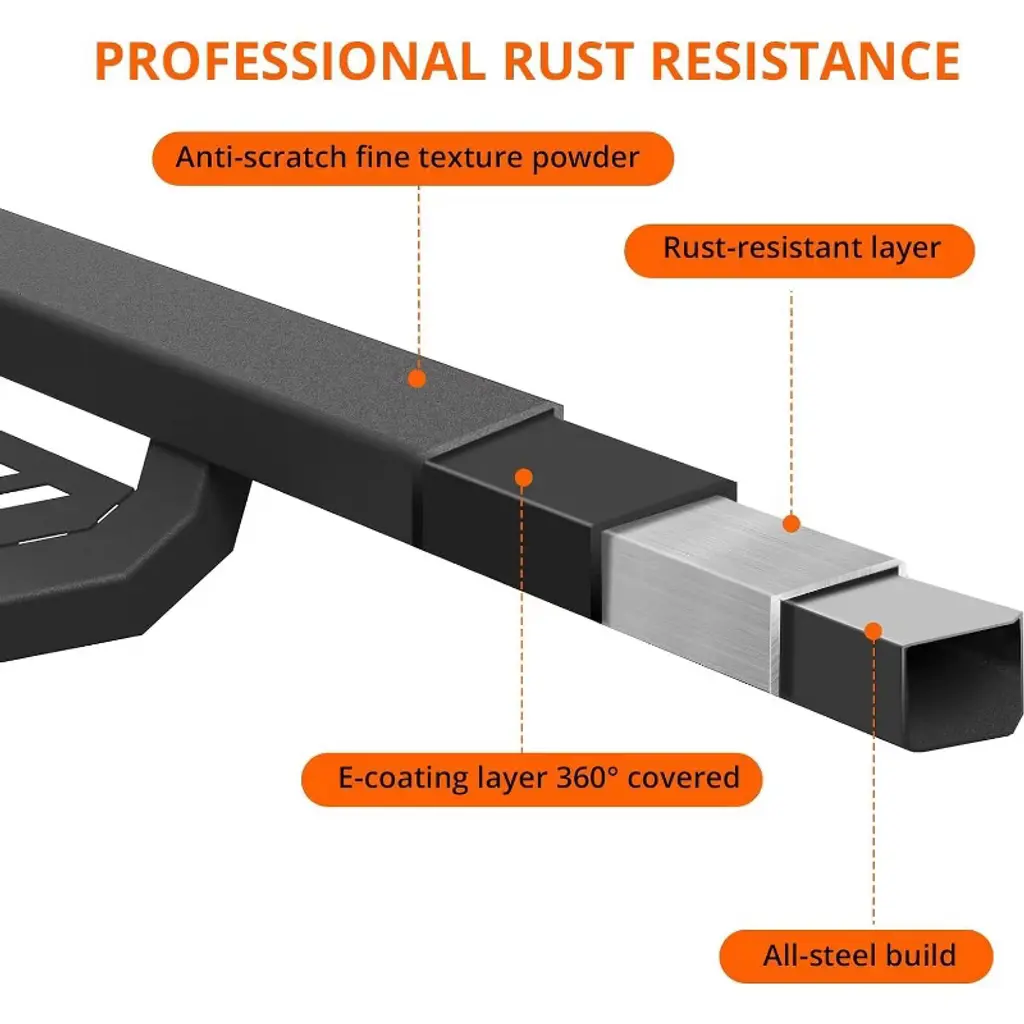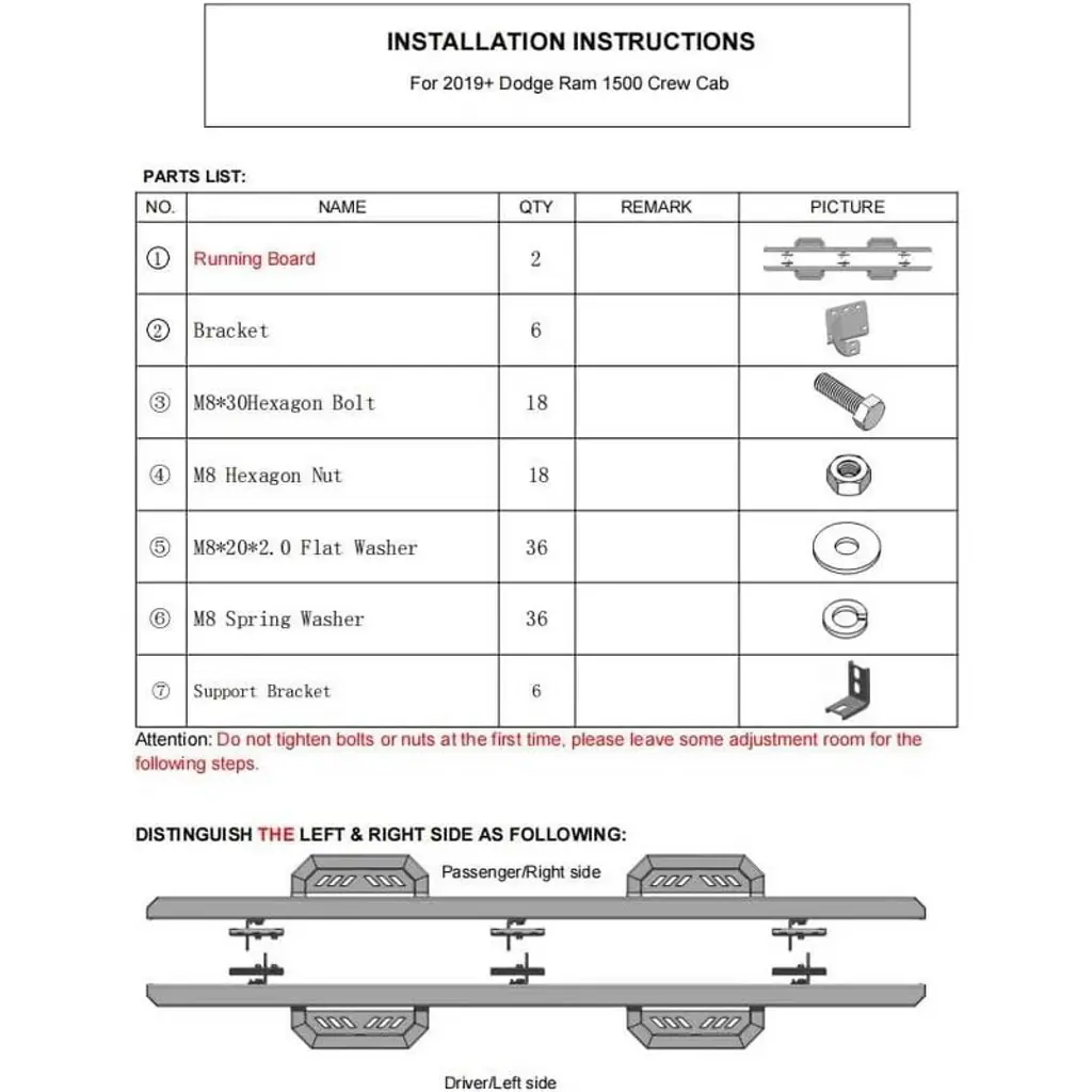 7-inch Aluminum Running Boards Nerf Bars for 2019-2021 Ram 1500 Crew Cab, 600LB CapacityProduct Details:Precise Vehicle CompatibilityEngineered specifically for the 2019-2021 Ram 1500 Crew Cab (excluding the 2019-2022 Classic models), these running boards ensure a perfect, seamless fit. The custom-designed brackets and contours align exactly with your truck's body, providing a factory-installed appearance without any modification required.Heavy-Duty 600-Pound Weight CapacityBuilt with exceptional strength, these nerf bars support up to 600 pounds per side, offering reliable stability and safety for passengers entering and exiting the vehicle. The robust construction provides added side protection for your truck while ensuring secure footing for adults, children, and pets in all weather conditions.Premium Aluminum Alloy ConstructionCrafted from high-grade aluminum alloy, these running boards deliver superior durability against daily wear and environmental challenges. The material provides excellent resistance to corrosion, rust, and UV radiation, ensuring the finish remains vibrant and the structure intact through harsh winters, road salt, and intense sunlight.7-Inch Wide Anti-Slip Step SurfaceFeatures a generously wide 7-inch stepping surface that provides comfortable and secure footing. The textured pattern offers enhanced traction even when wet, making entry and exit safer during rain or snow while accommodating various foot sizes comfortably for improved user convenience.Drill-Free Installation with Rust-Resistant HardwareEnjoy straightforward installation with all necessary stainless steel bolts and a innovative slide-on bracket system that requires no drilling into your vehicle's frame. The comprehensive kit includes detailed illustrated instructions, enabling most users to complete the installation in under two hours with basic tools.Product Specifications:Compatibility: 2019-2021 Ram 1500 Crew Cab (Excludes Classic models)Material: High-Strength Aluminum AlloyColor: BlackStep Width: 7 InchesWeight Capacity: 600 PoundsFinish: Corrosion-Resistant, UV-ProtectedInstallation: Drill-Free Design with Stainless Steel HardwareDesign: OE Style with Four Brackets Per Side