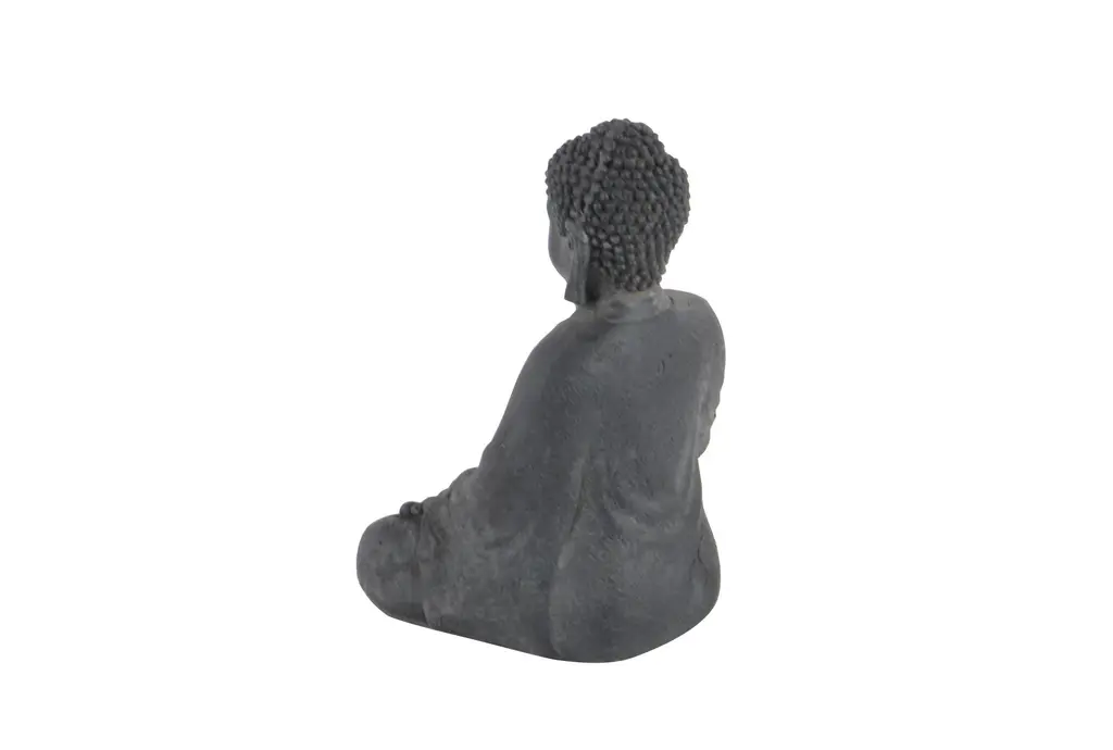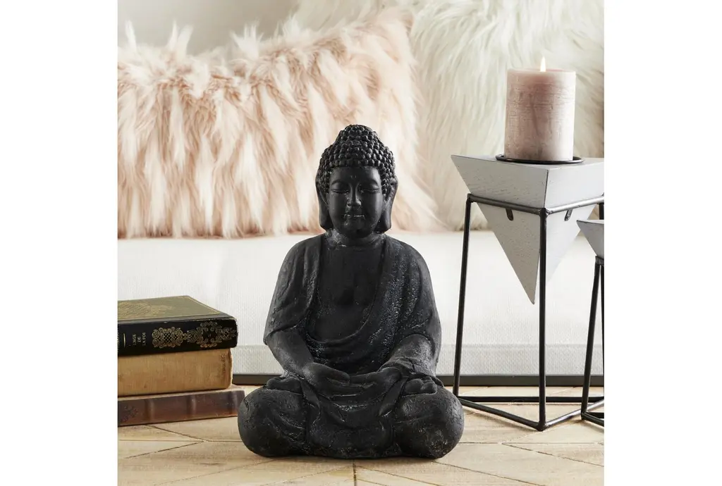 Enhance your living space with the serene presence of the 8" X 12" Dark Grey Ceramic Buddha Meditating with Engraved Carvings Sculpture by Cosmopolitan. This beautifully crafted piece brings a touch of tranquility and elegance to any decor.