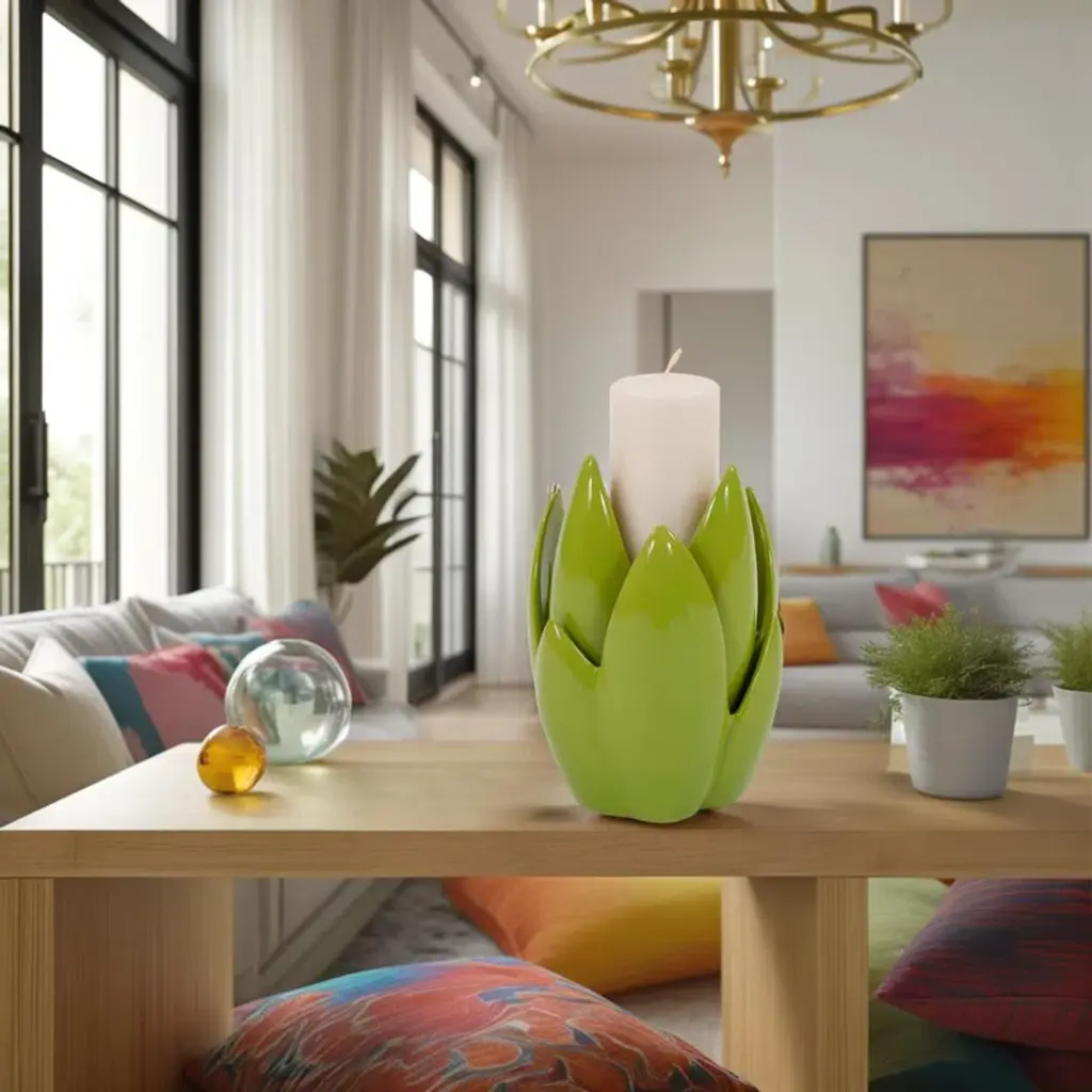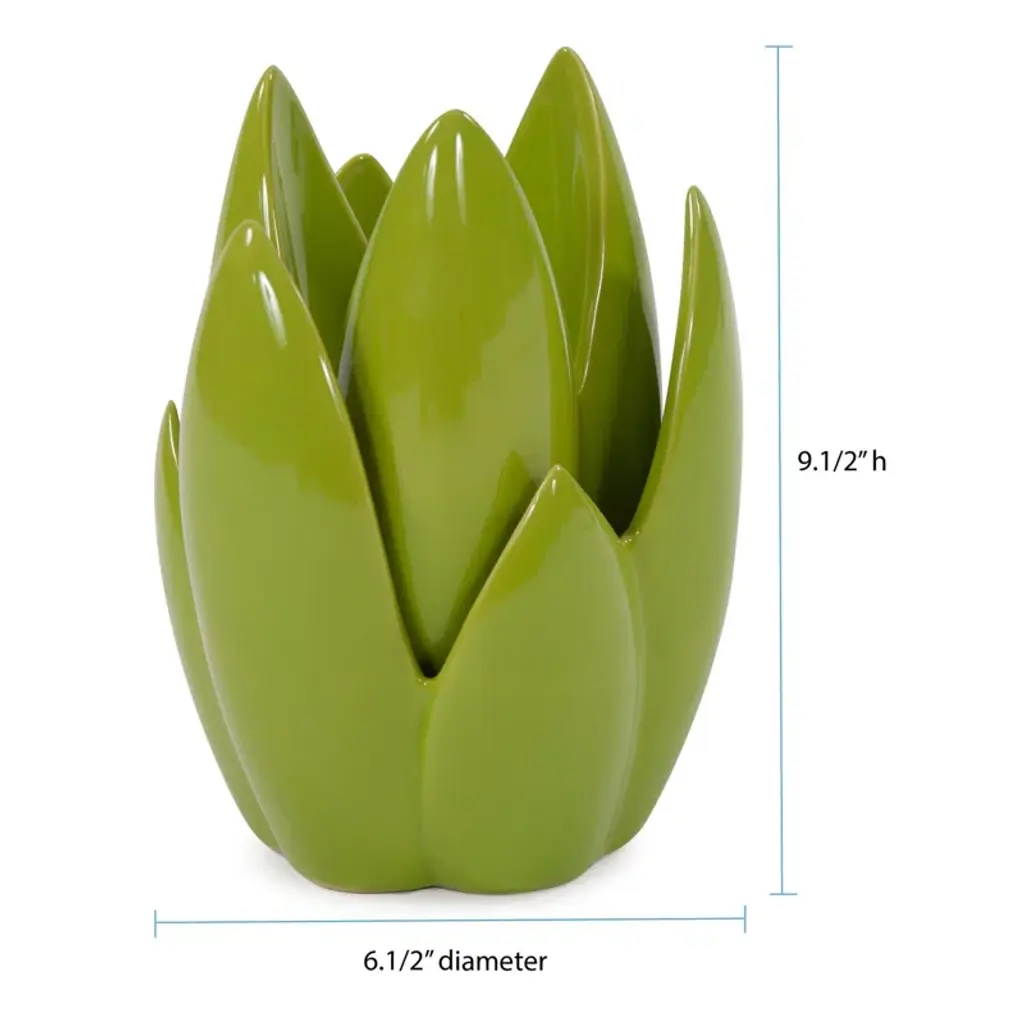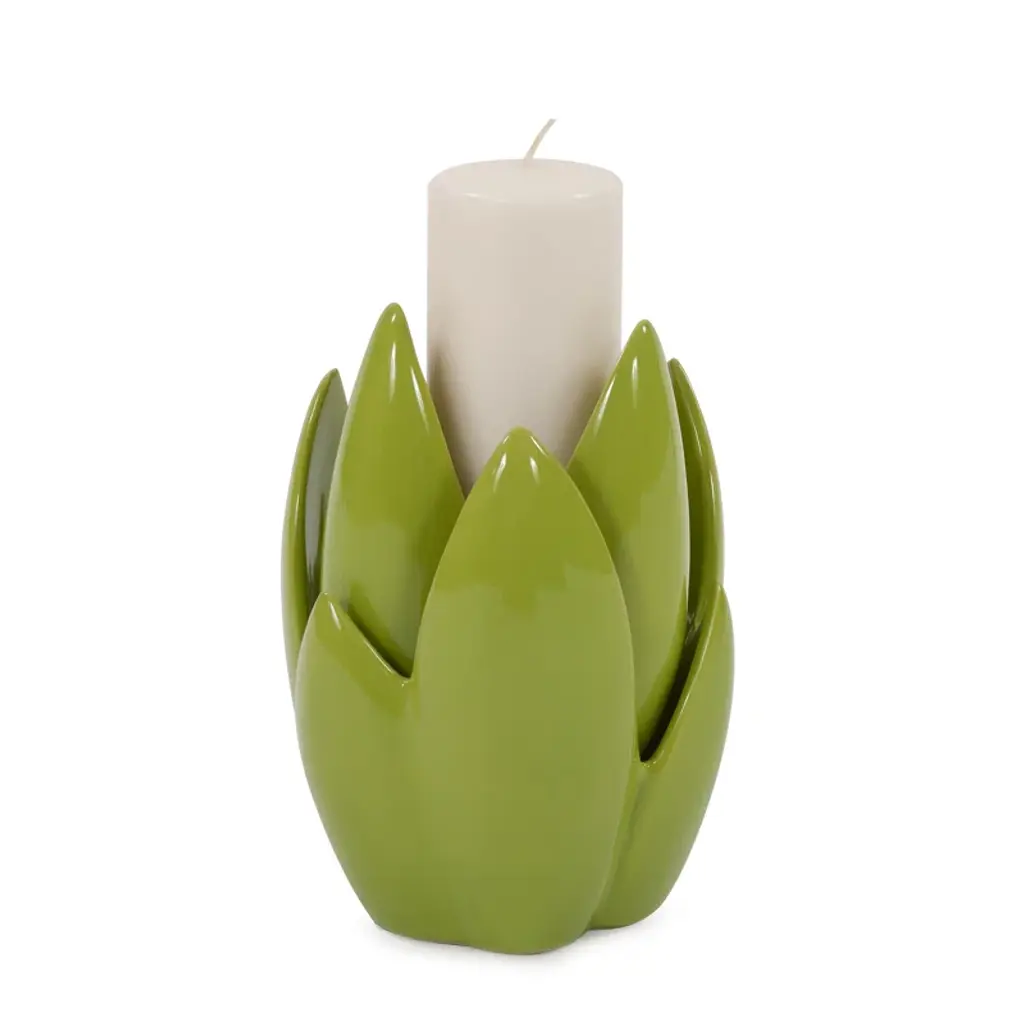 Our contemporary twist to a garden favorite, the artichoke‚ comes to life. Whimsical green petals are artfully layered to create a showstopper for your tablescape. The top center point of our sculpture becomes the resting place for the warm glow of a votive candle.
