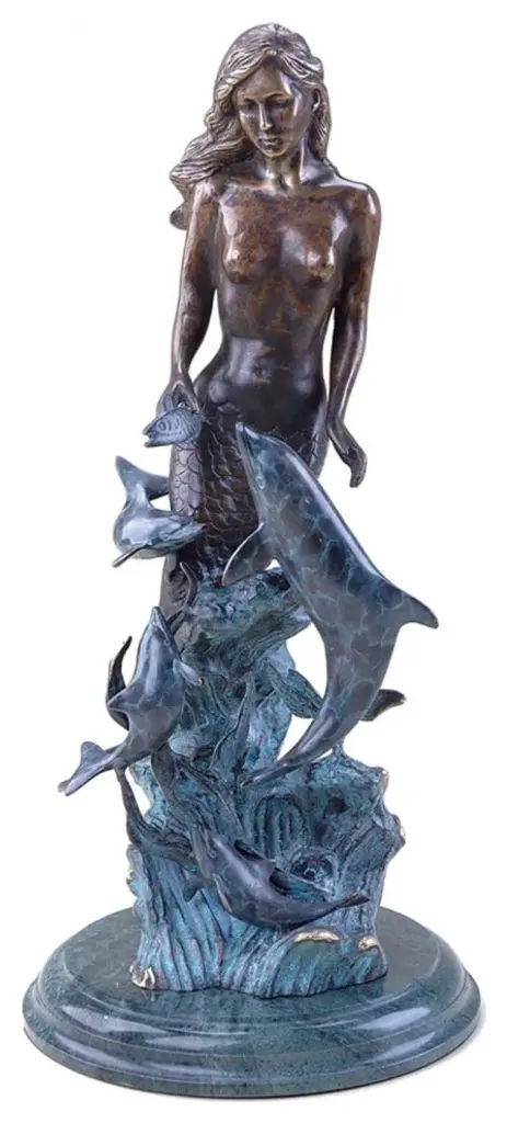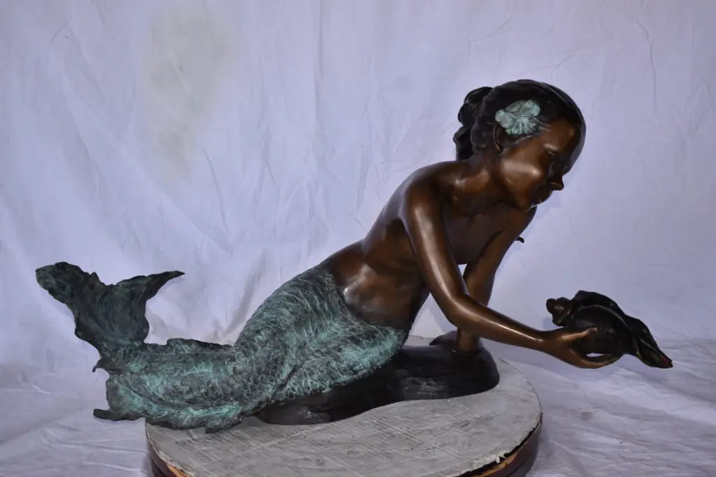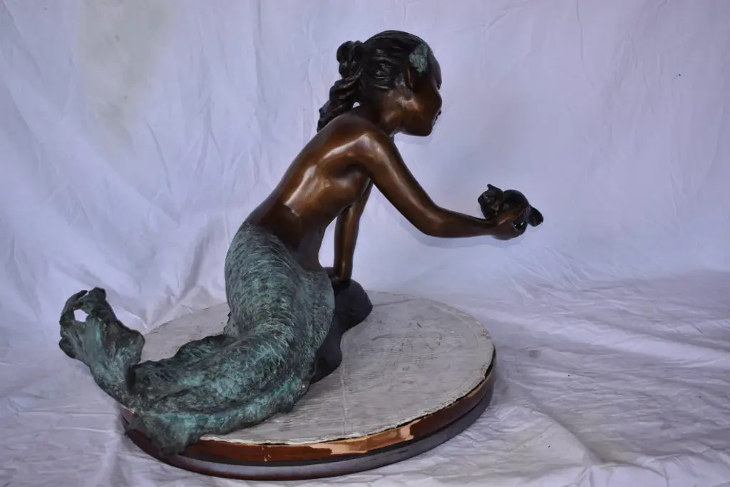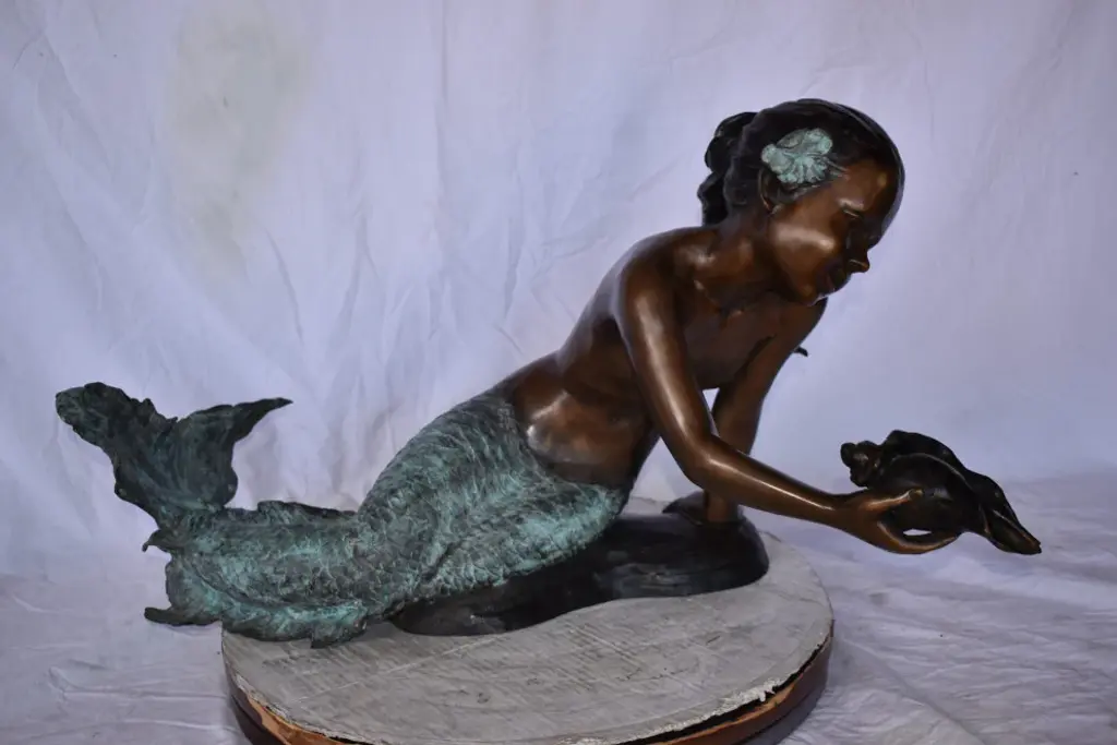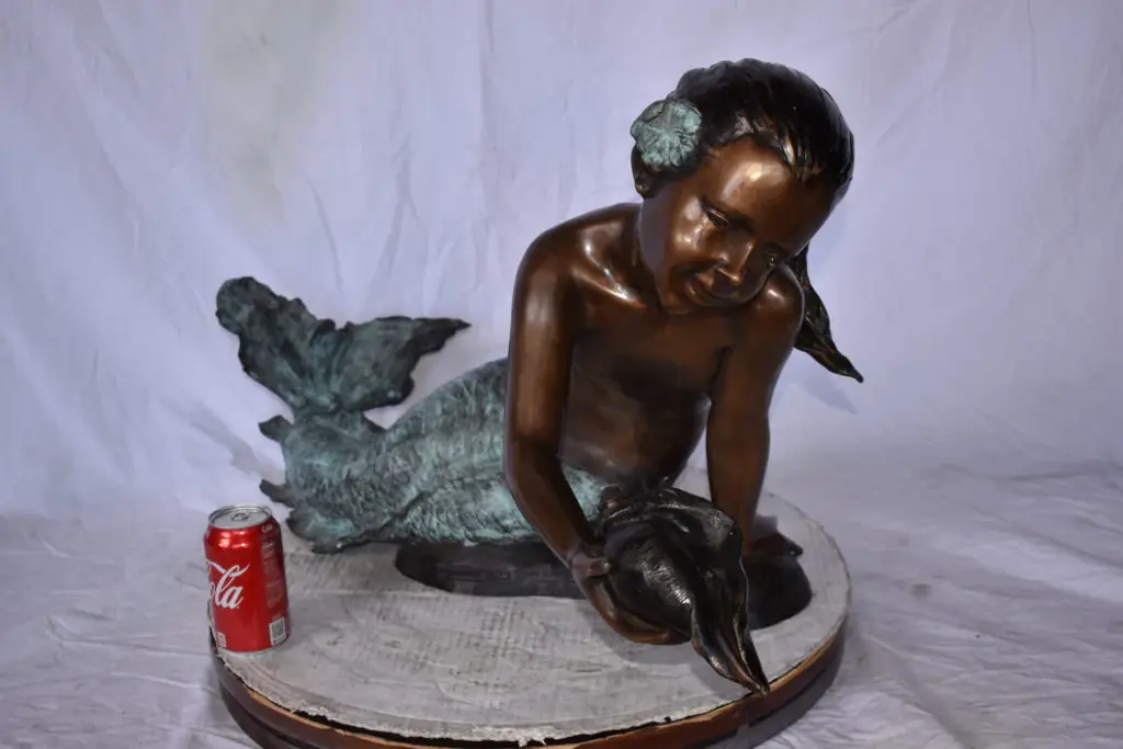 A Little Mermaid Holding A Shell Bronze Fountain Art Nude: 15" X 37" X 20"h