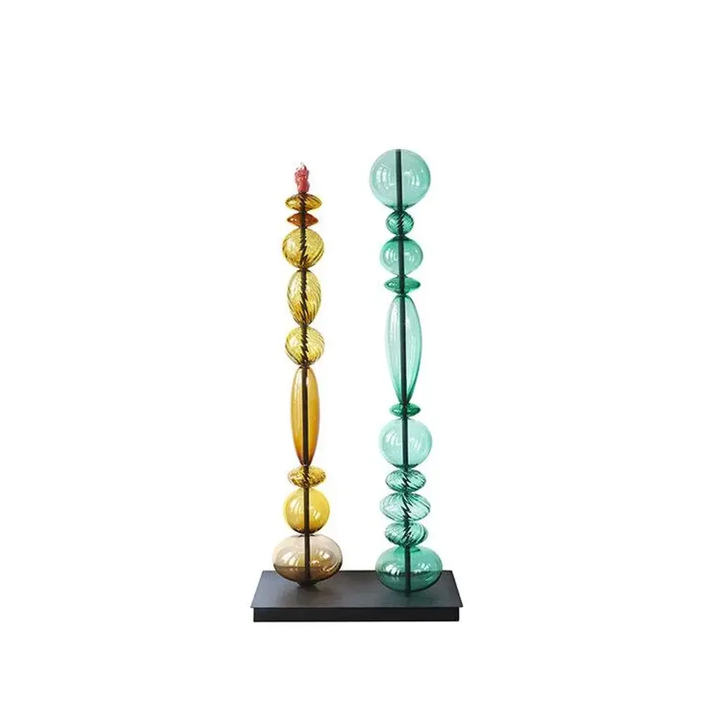 Our Abacus Glass Towers were intellectually conceived as vertical timelines with each sphere representing a time period or moment. Each “moment in time” is stacked on the next to create a visual composition that illustrates the beauty of collective experiences one may enjoy over a lifetime. Each Glass tower is made to order and no two will ever be the same. Each tower is made of pieces blown by hand using multiple traditional glass blowing techniques in accordance with traditional Murano glass making craftsmanship. glass sculpture, tower, totem, glass, colorful, statue, accessory, column Our current lead times reflect production delays our industry is experiencing. Please allow 6-12 weeks for delivery.