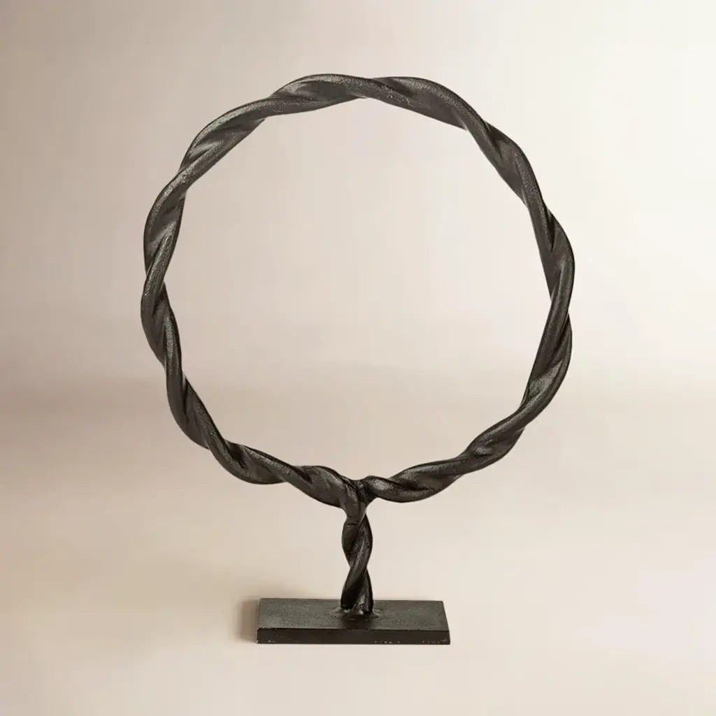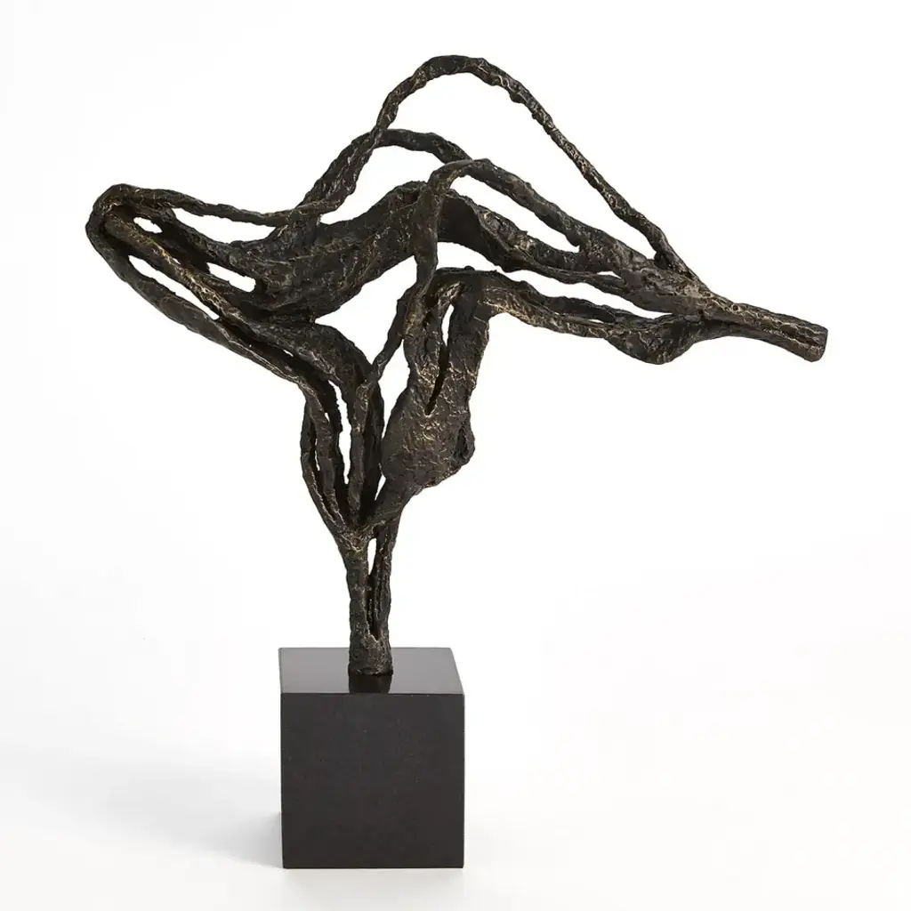 The Abstract Arches Sculpture is a stunning work of art, crafted from aluminum in a black color, that displays two organically shaped arches of varying heights. The arches unpredictable twists and turns introduce a stunning level of dimensional depth to any décor. The sculpture proudly stands atop a base of black marble, completing the look.